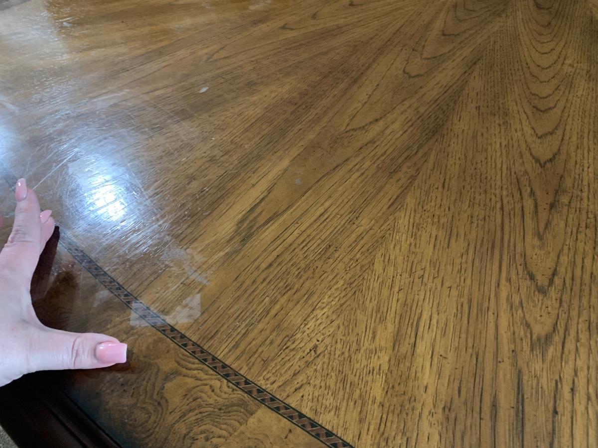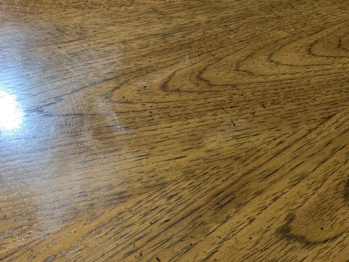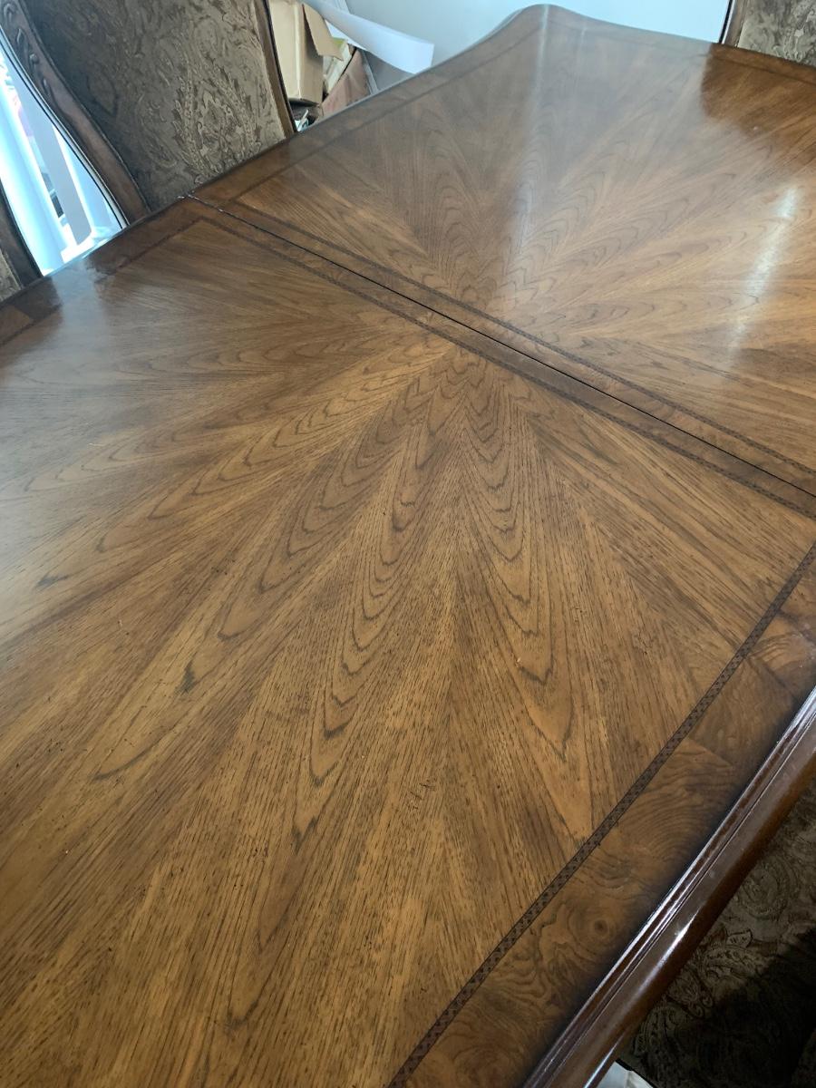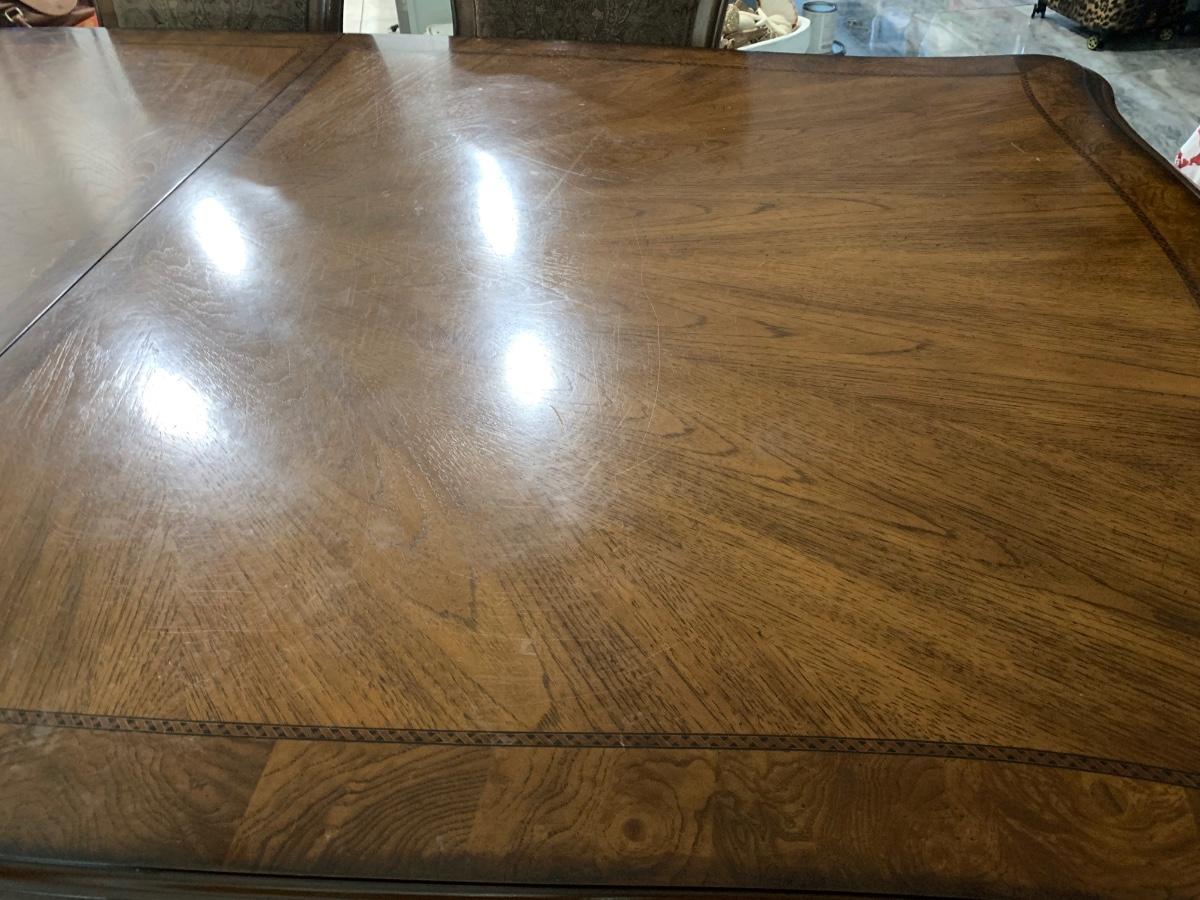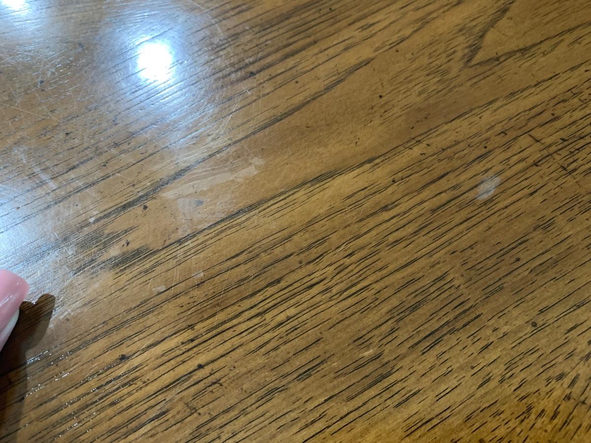 Flaws: The top of the table has some flaws I tried to take some close up photos but it is hard to see . The top can easily be lightly sanded and and finish it off with some poly spray to restore. Some of the chairs have some Nicks nothing major I do have a photo on one of the chair corners where you can see small scuff mark. Stain pen will cover those up easily.