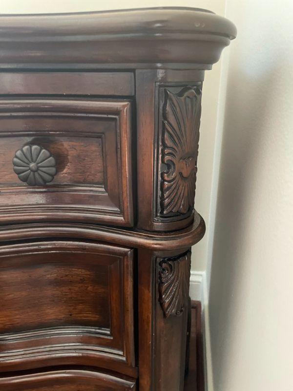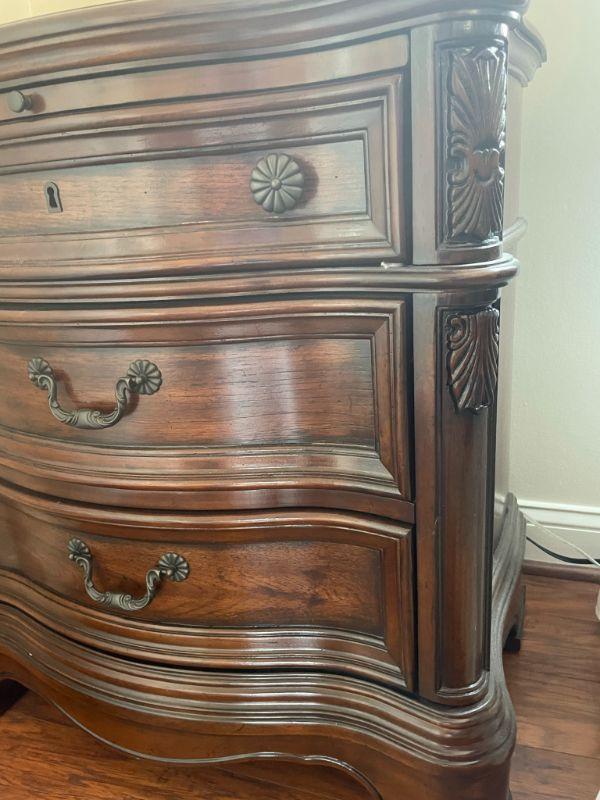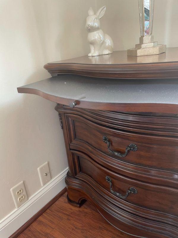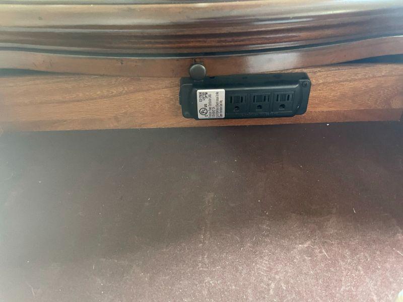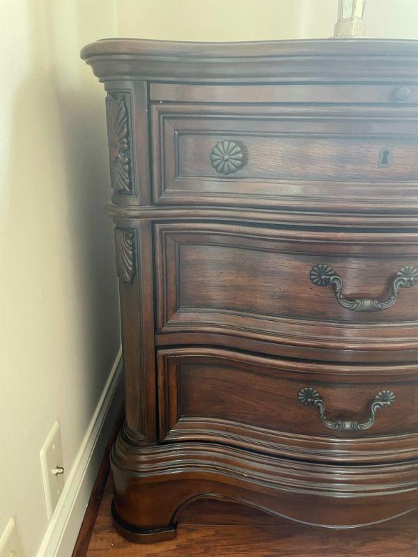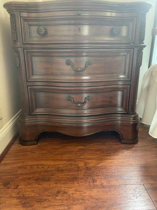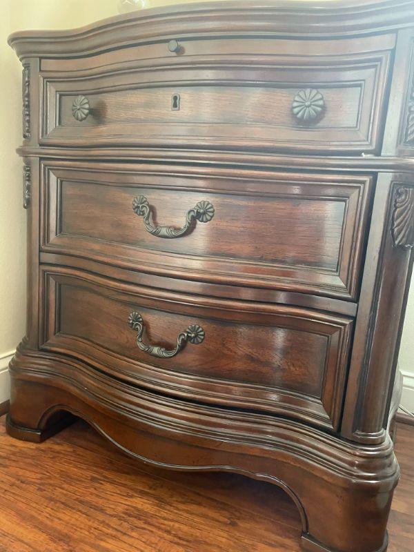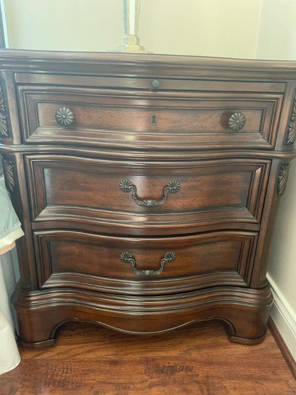 Nice matching bedside tables with pullout shelf and power in the top drawer. Measures 31" H X 30" W X 19" D