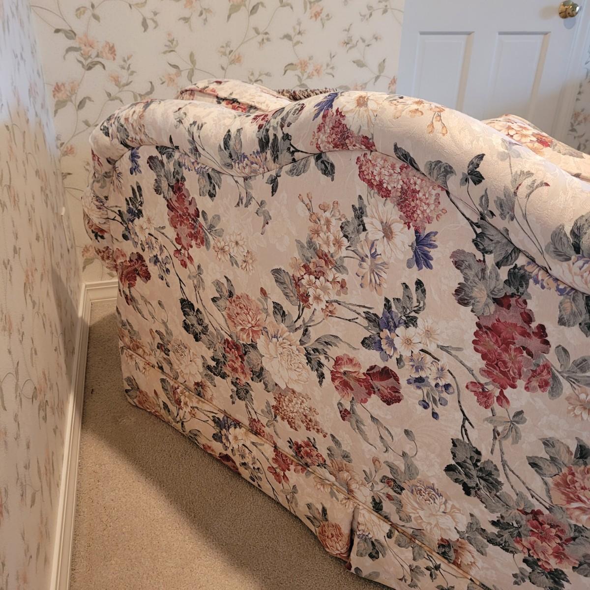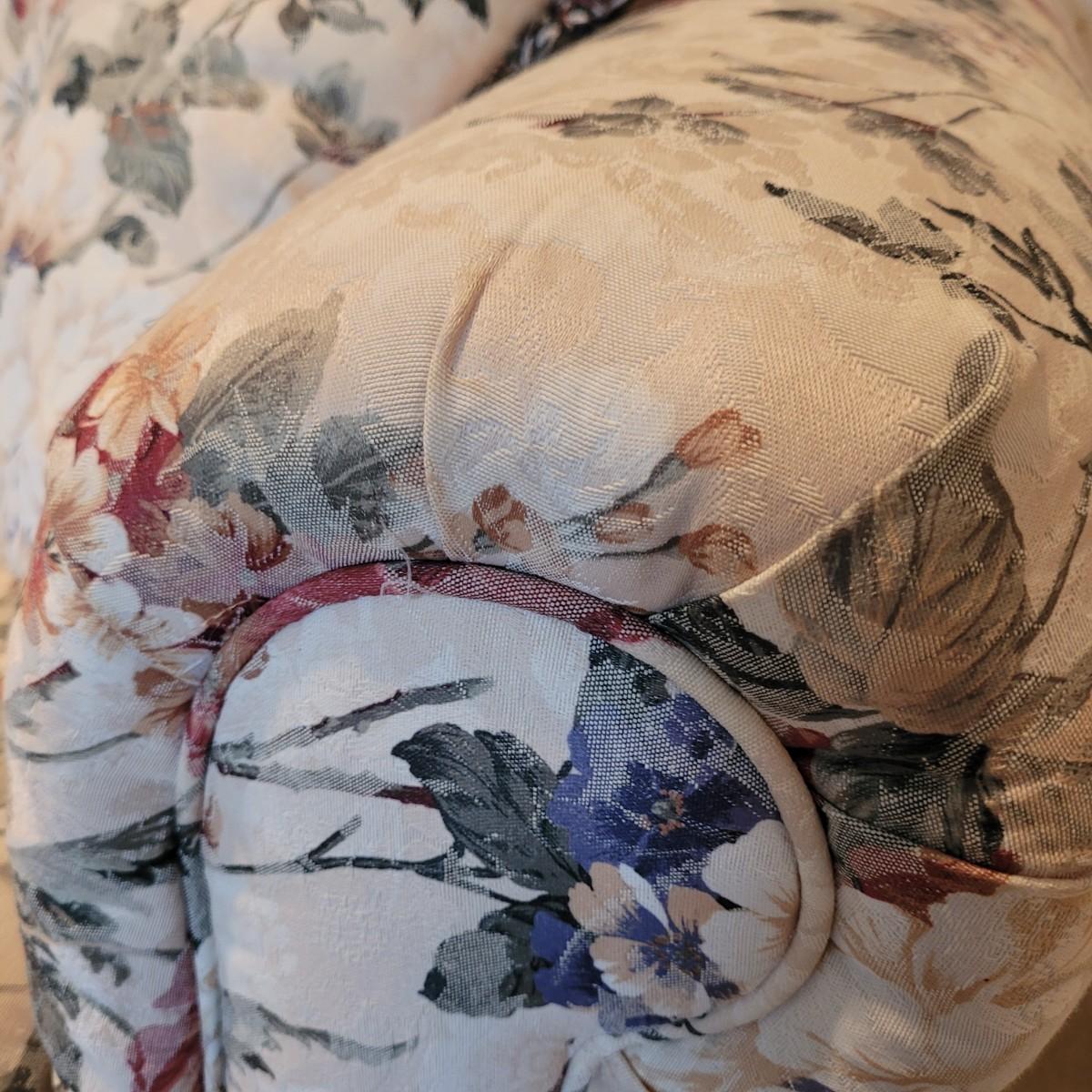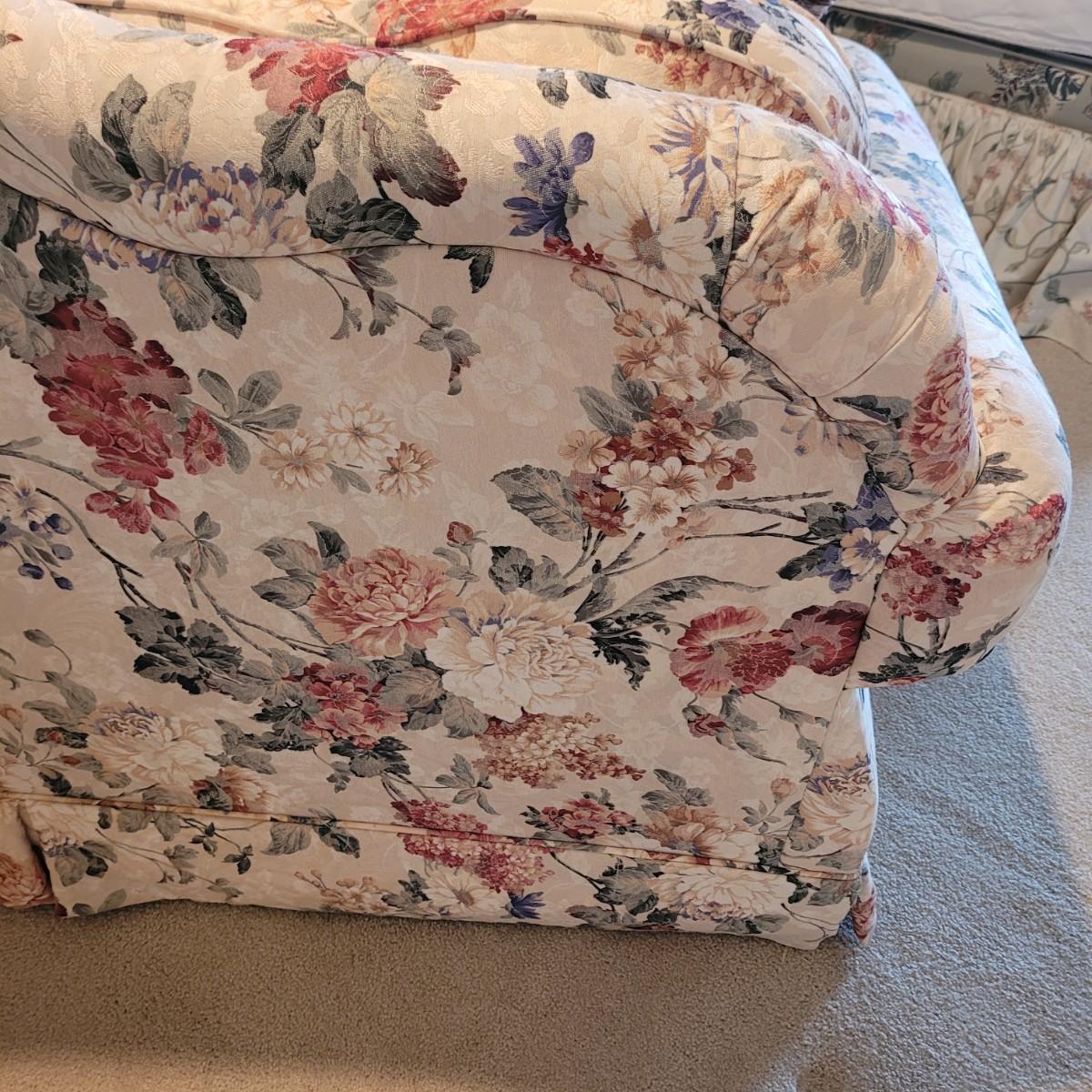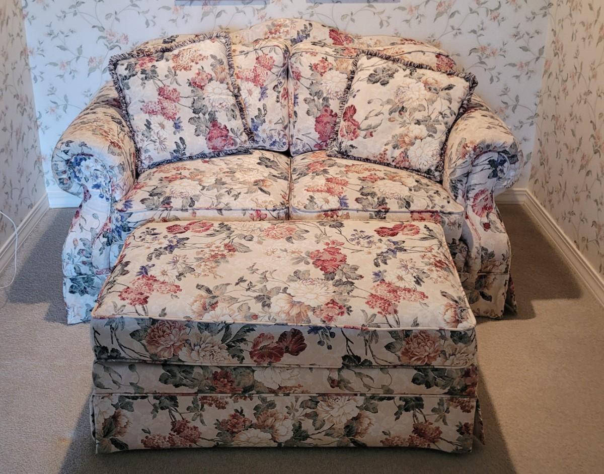 This floral print loveseat by Haverty’s has removable bottom cushion covers, attached back cushions, two throw pillows and an ottoman with casters. Loveseat measures approximately 62” x 37” x 36”H with a seat height of 17”, and ottoman 40” x 23” x 18”H. Local pickup only. Winning bidder must bring assistance to help move and load this item due to its weight and size. Sofa is located up one flight of stairs.