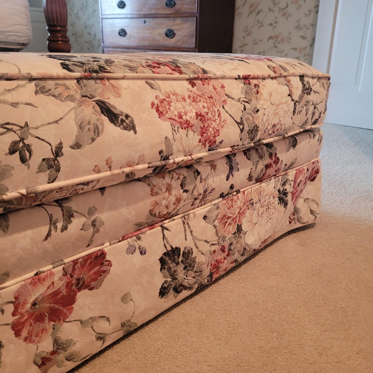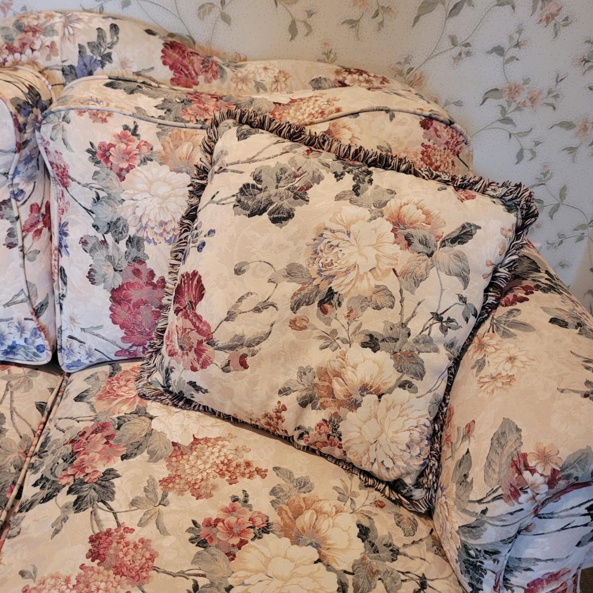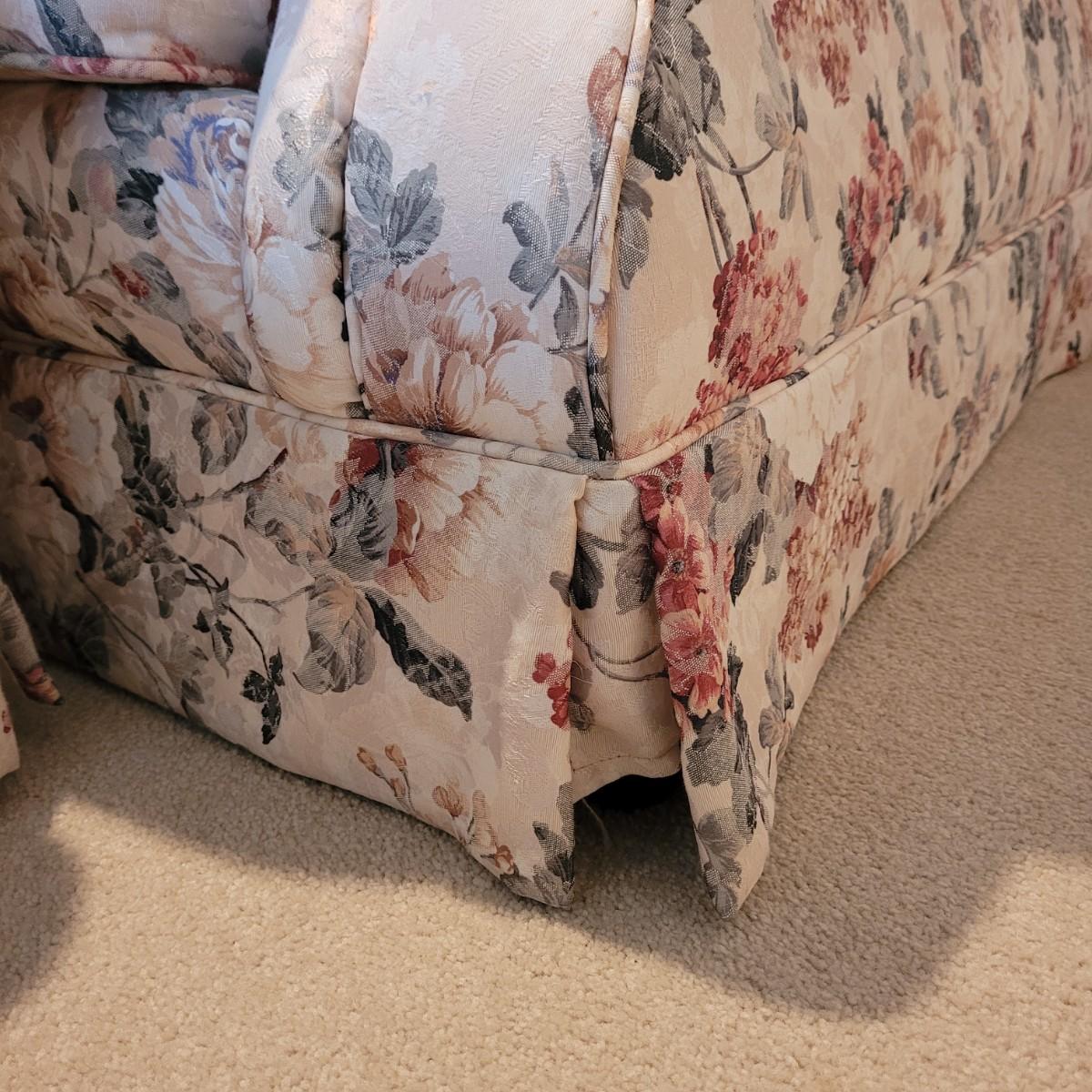 This floral print loveseat by Haverty’s has removable bottom cushion covers, attached back cushions, two throw pillows and an ottoman with casters. Loveseat measures approximately 62” x 37” x 36”H with a seat height of 17”, and ottoman 40” x 23” x 18”H. Local pickup only. Winning bidder must bring assistance to help move and load this item due to its weight and size. Sofa is located up one flight of stairs.