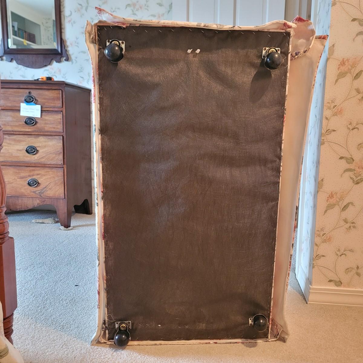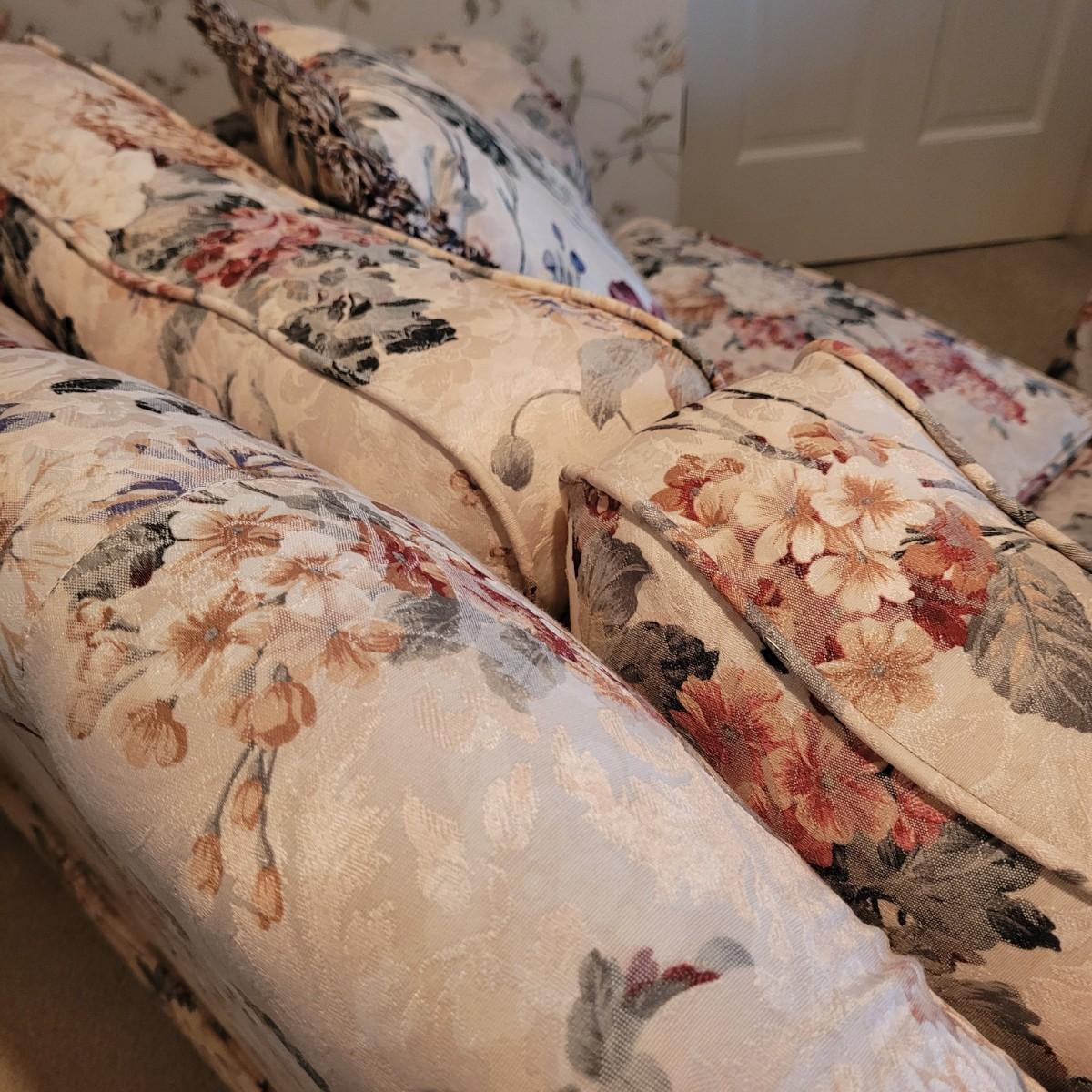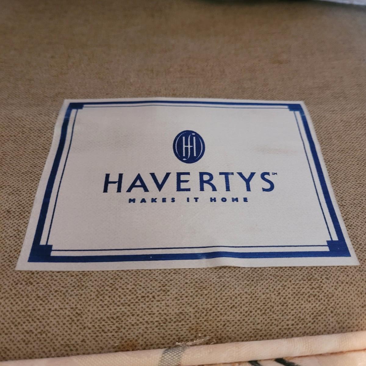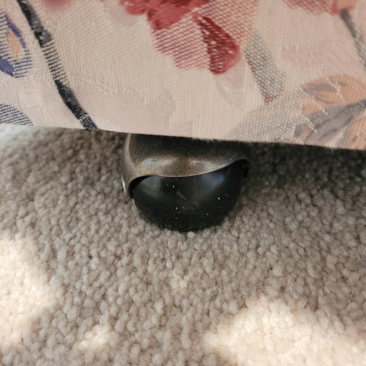 This floral print loveseat by Haverty’s has removable bottom cushion covers, attached back cushions, two throw pillows and an ottoman with casters. Loveseat measures approximately 62” x 37” x 36”H with a seat height of 17”, and ottoman 40” x 23” x 18”H. Local pickup only. Winning bidder must bring assistance to help move and load this item due to its weight and size. Sofa is located up one flight of stairs.