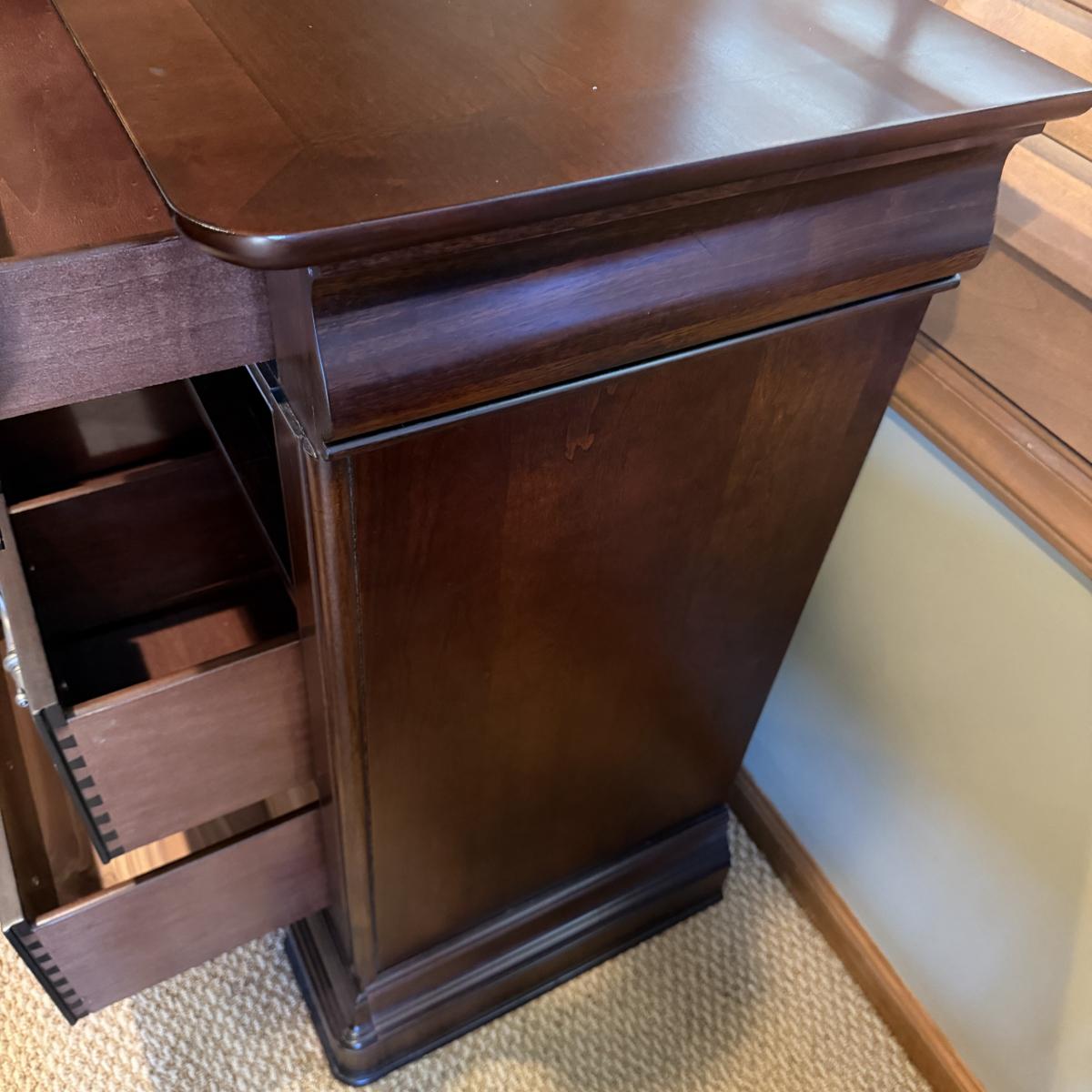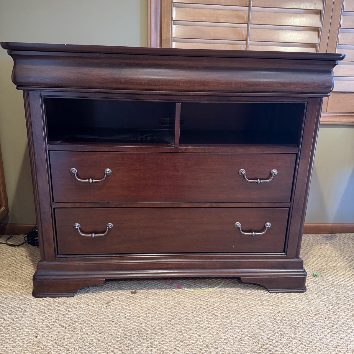 Lot includes a Haverty’s media chest with two dovetailed drawers and one drawer near top. Piece appears to be solid wood and measures 46” x 19” x 38”H.