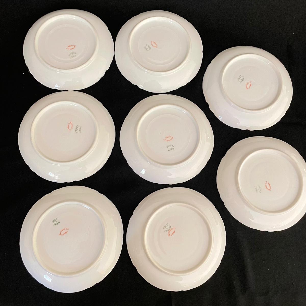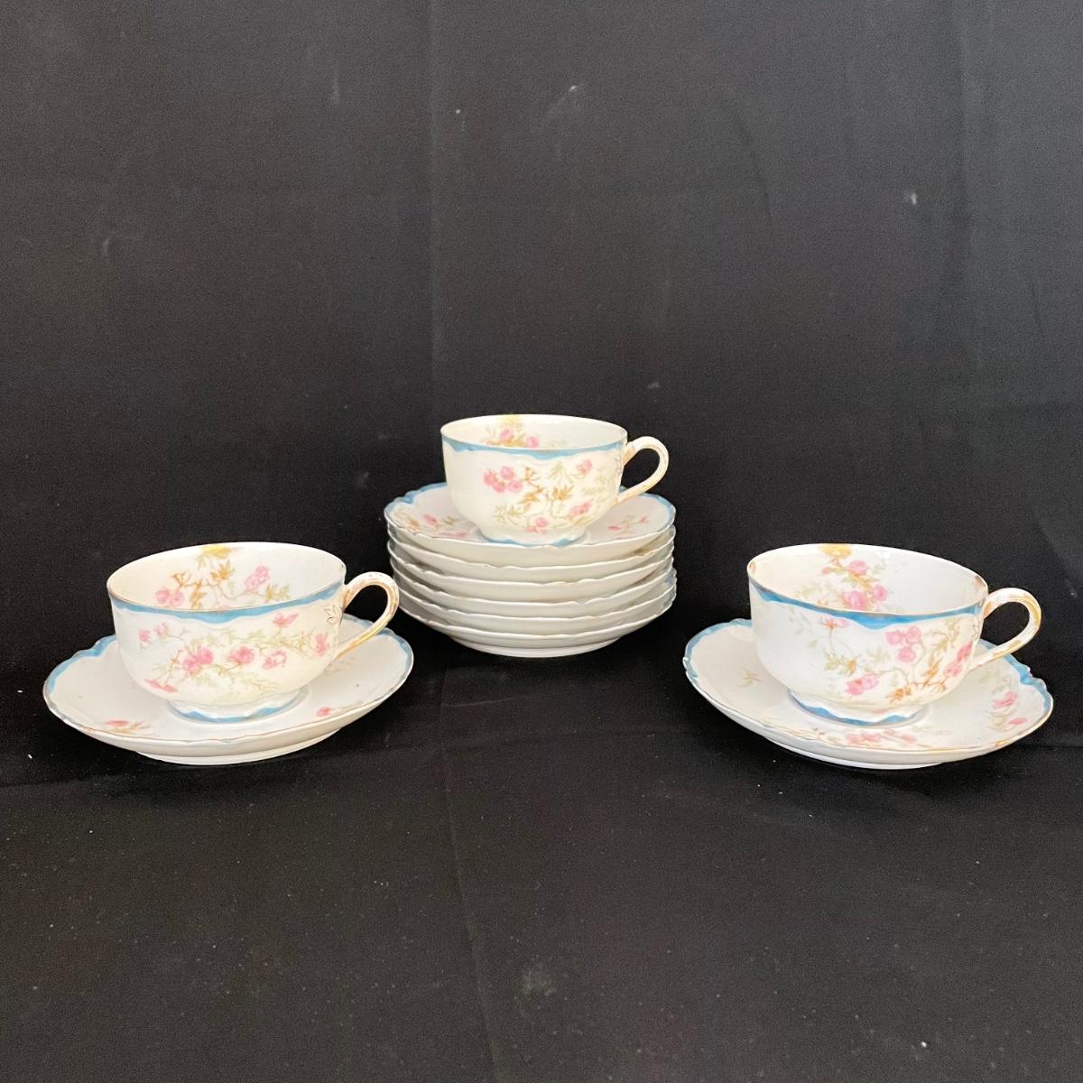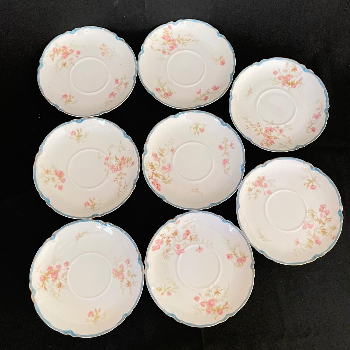 Three teacups and eight saucers by Haviland & Co, Limoges. Pieces are in very good shape. A few blemishes are noted in photos, what appears to be cracks seem to be very superficial and not felt by the touch. See images. Shipping available.