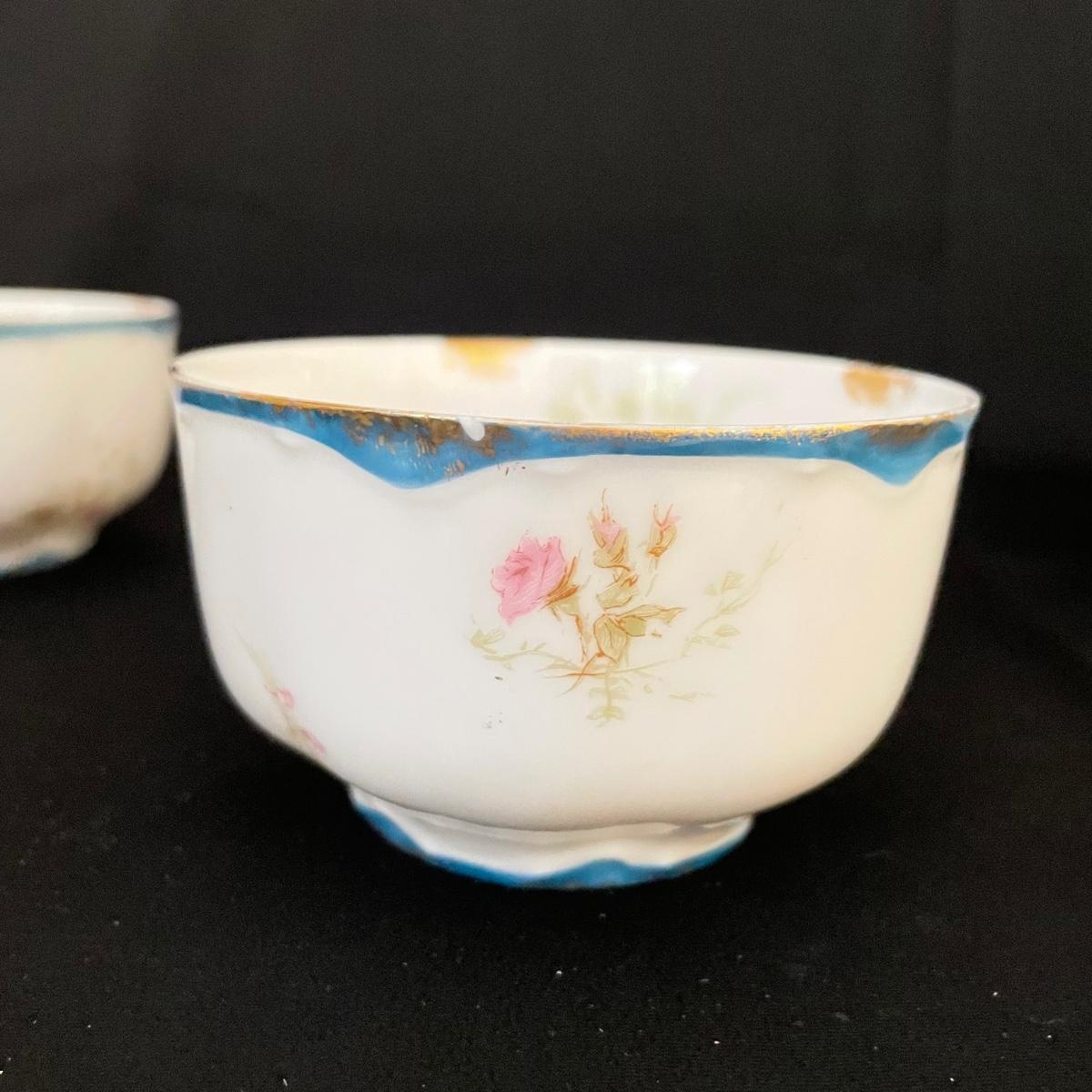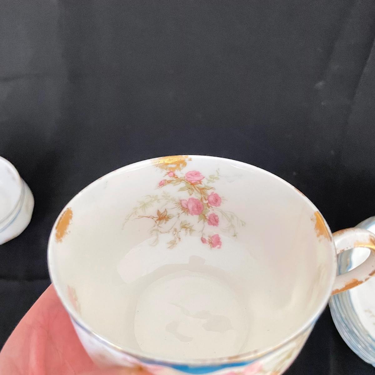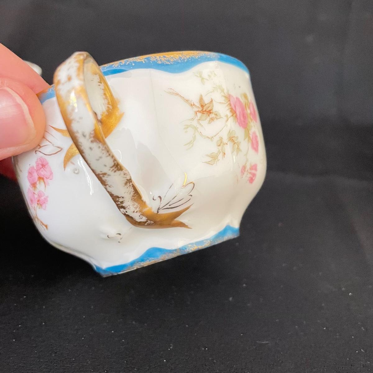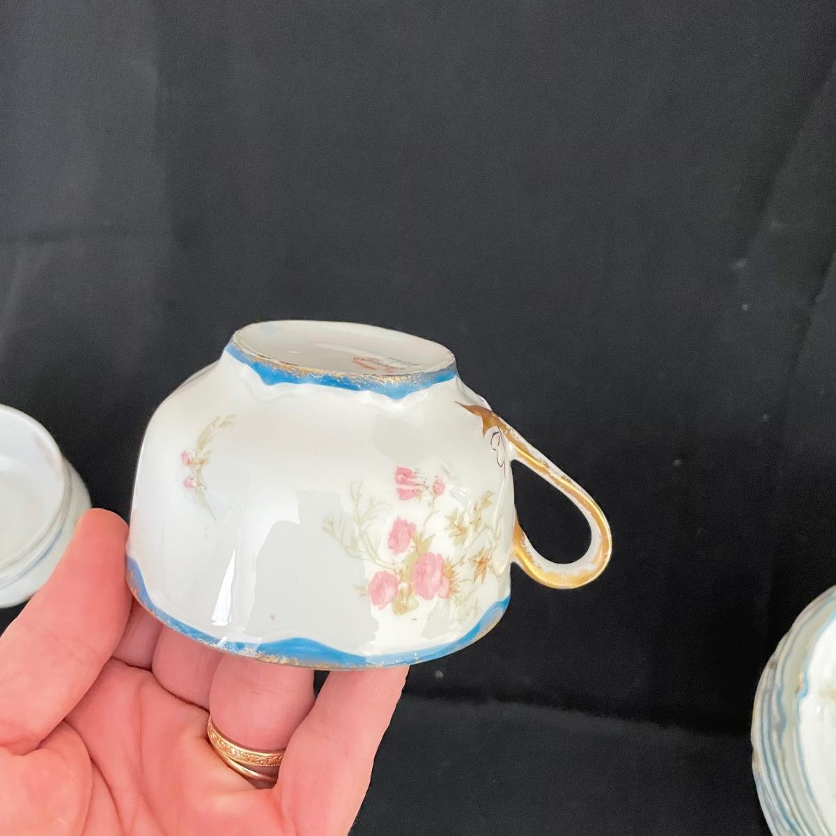 Three teacups and eight saucers by Haviland & Co, Limoges. Pieces are in very good shape. A few blemishes are noted in photos, what appears to be cracks seem to be very superficial and not felt by the touch. See images. Shipping available.
