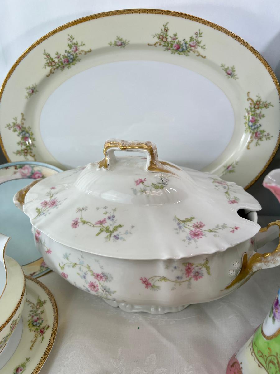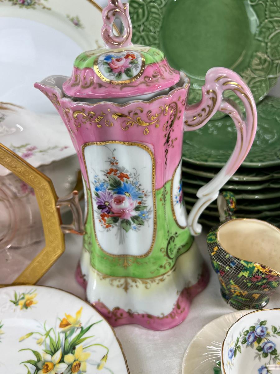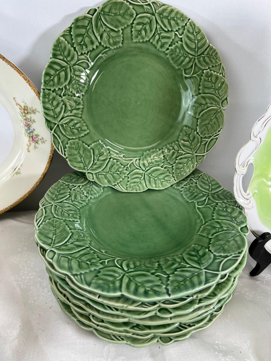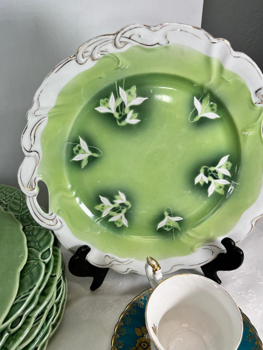 Tea Cups, Chocolate pitcher, Set of Green plates, casserole bowl, gravy boat.