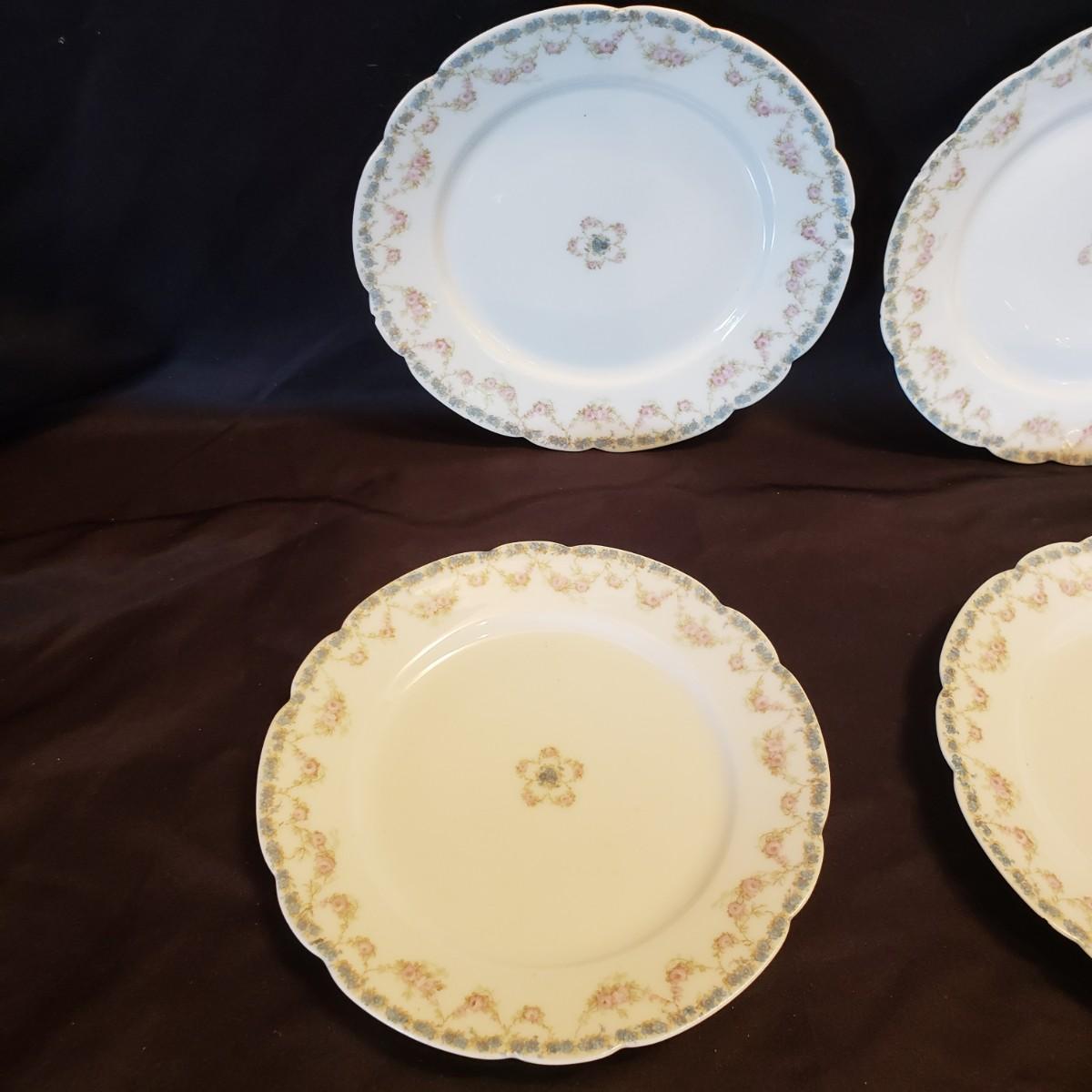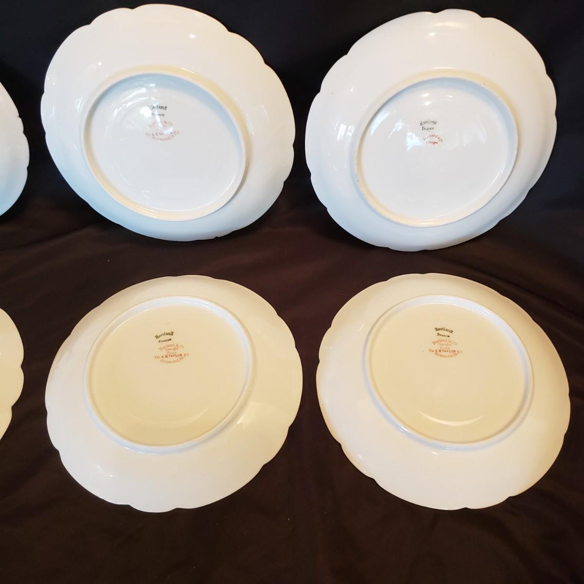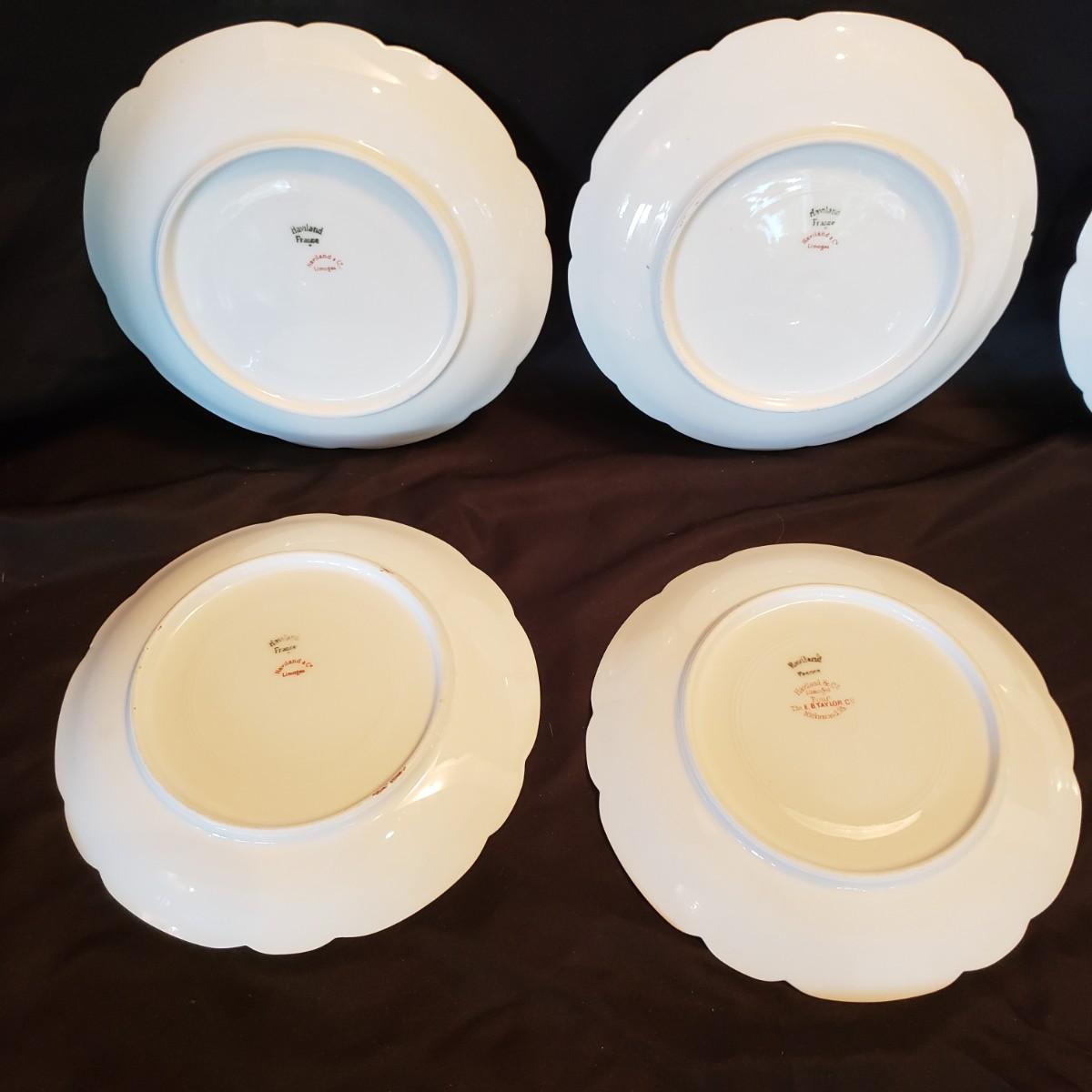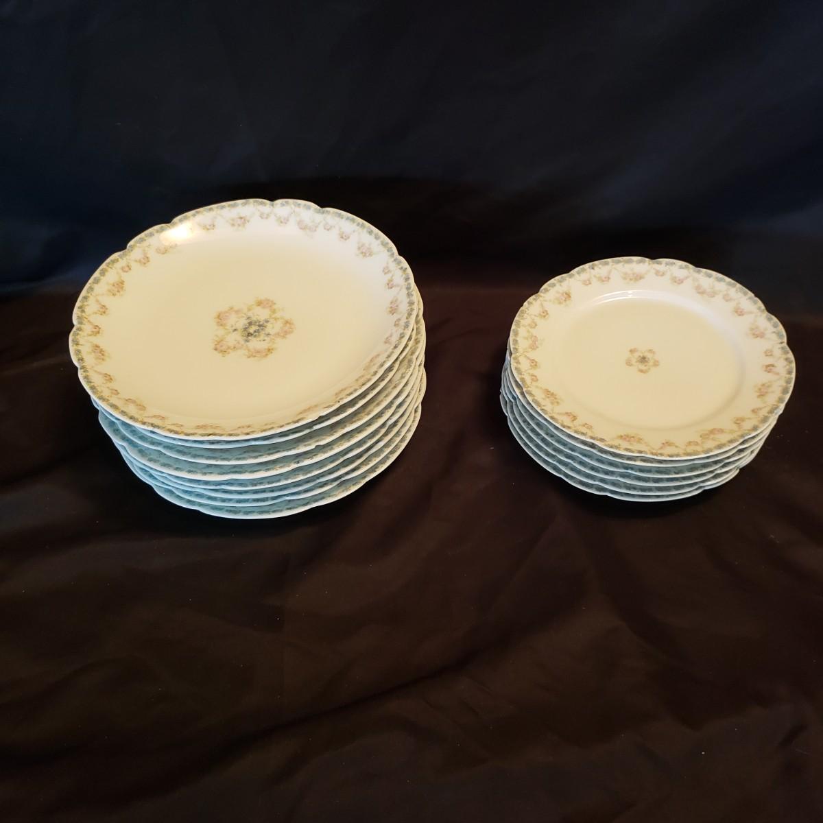 This set of eight luncheon plates (7") and six dessert plates (6"), are made by Haviland Limoges from France. The dishes have a scalloped rim and feature a rose and blue floral pattern
