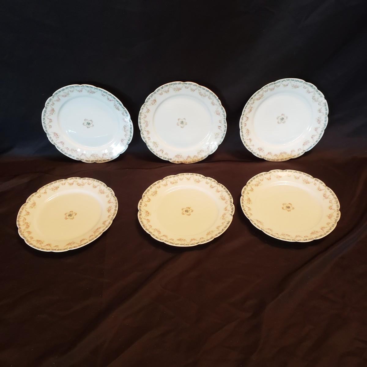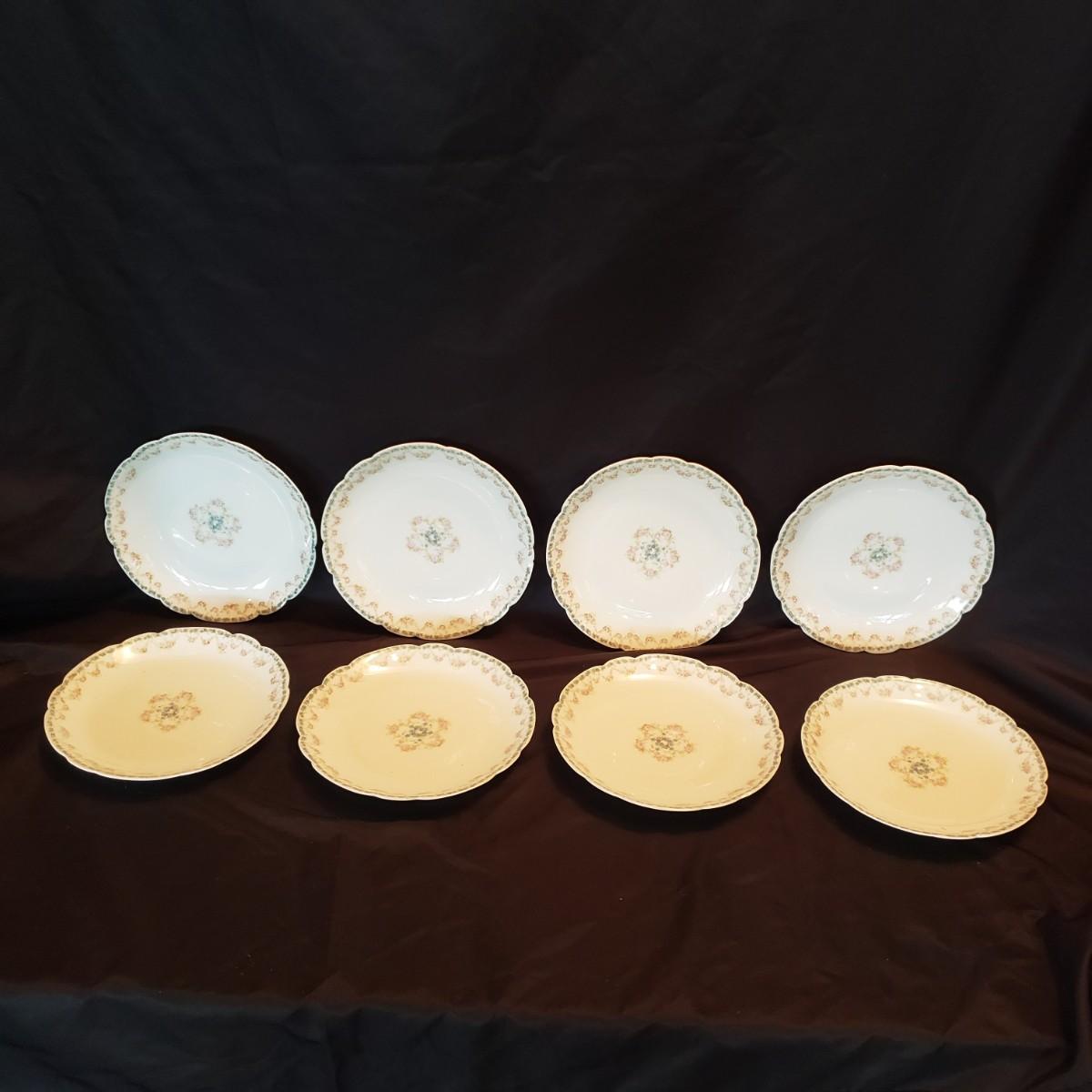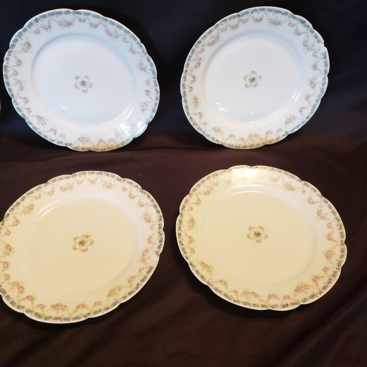 This set of eight luncheon plates (7") and six dessert plates (6"), are made by Haviland Limoges from France. The dishes have a scalloped rim and feature a rose and blue floral pattern