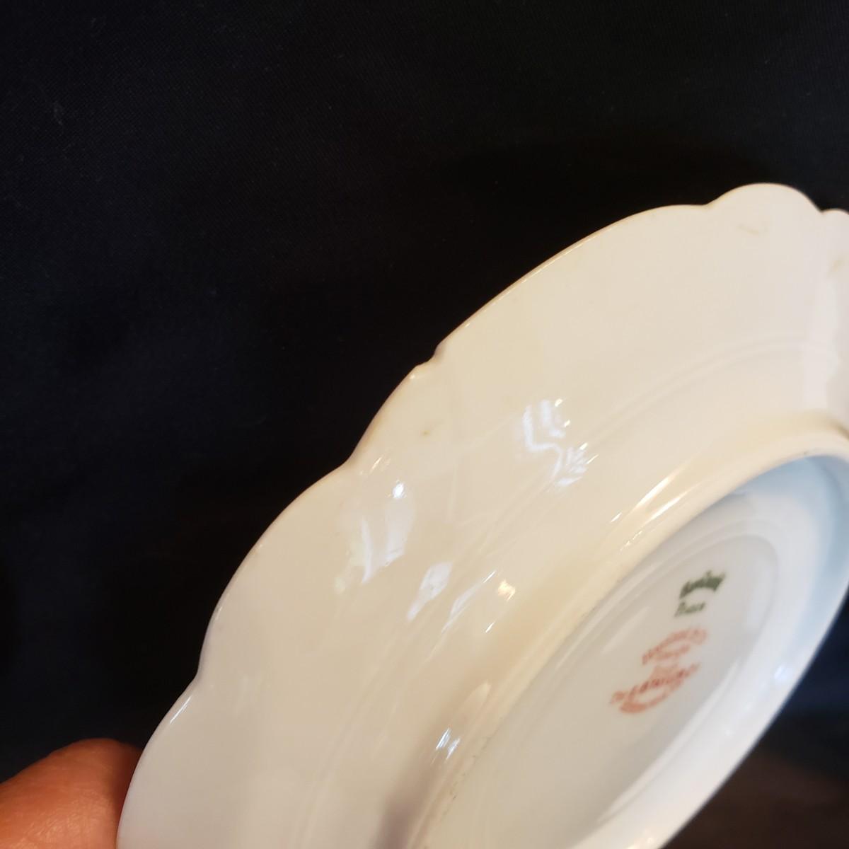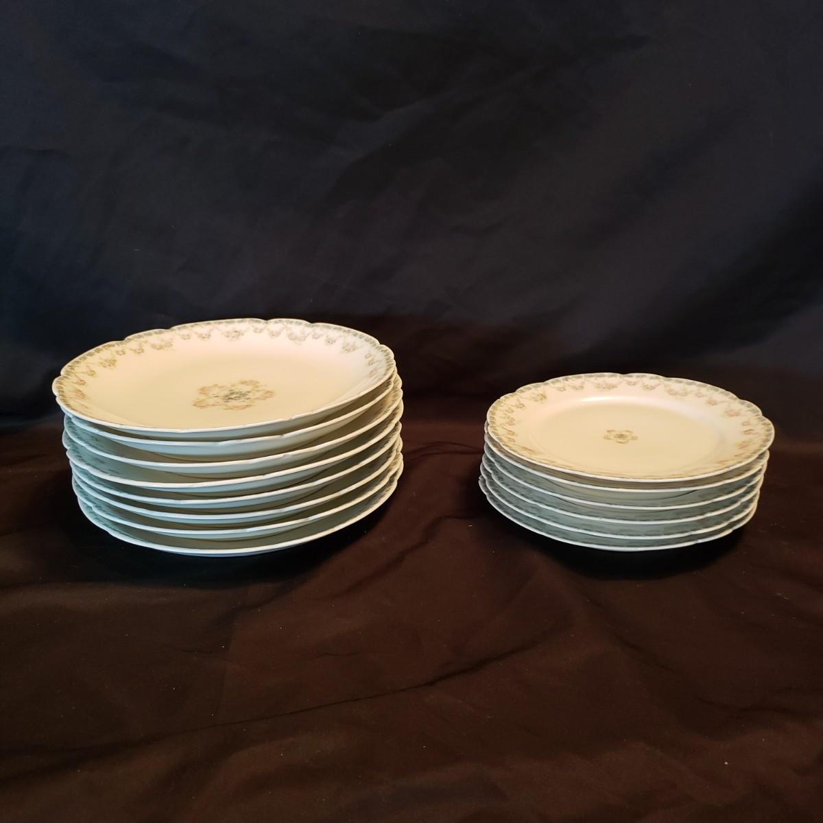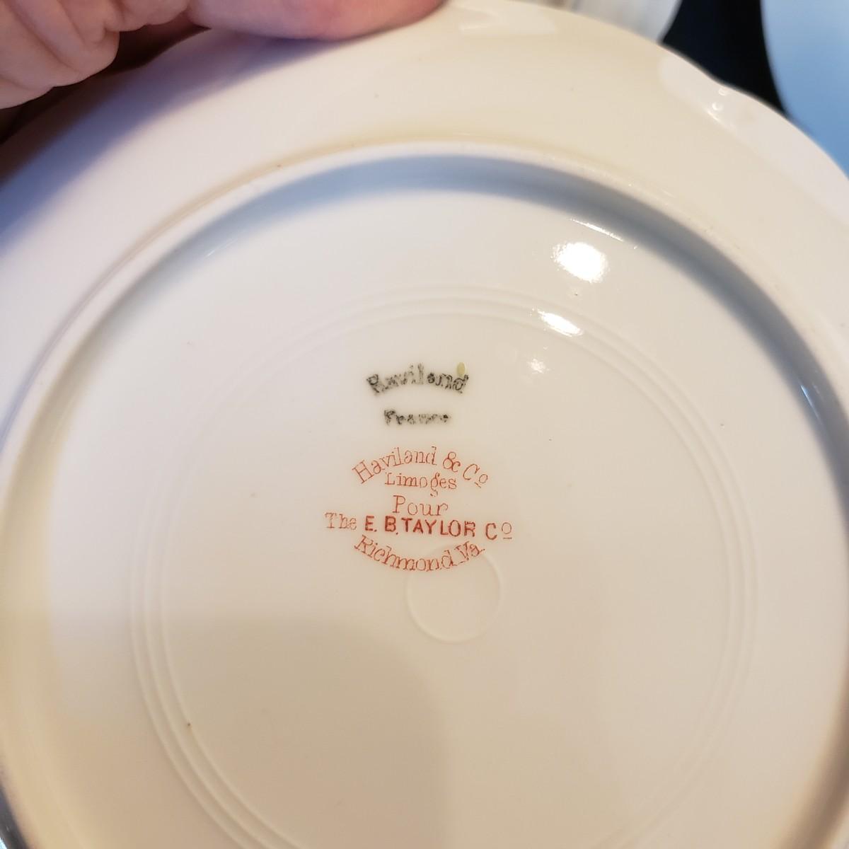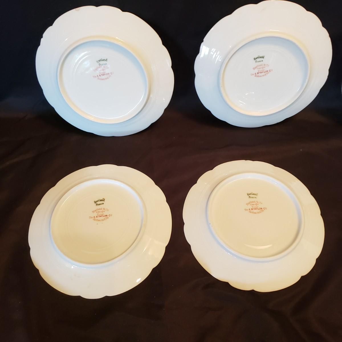 This set of eight luncheon plates (7") and six dessert plates (6"), are made by Haviland Limoges from France. The dishes have a scalloped rim and feature a rose and blue floral pattern