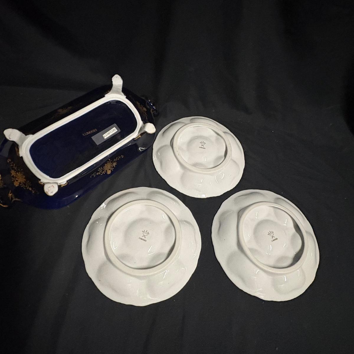 Six stunning serving pieces, including three oyster plates, gorgeous cobalt floral footed centerpiece dish, and 'Princess' bon-bon dish. Footed dish is 15” x 6.75” x 3.25”H, oyster plates are 8.5.”