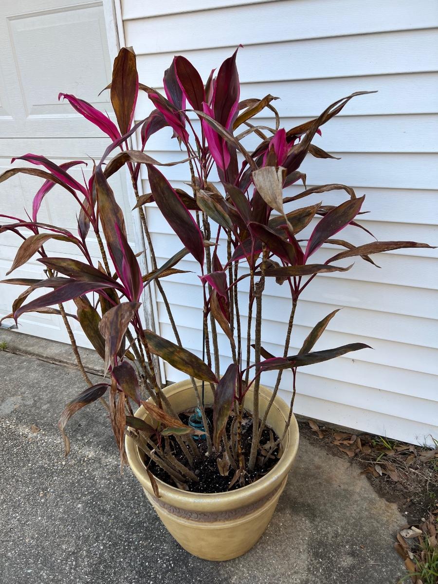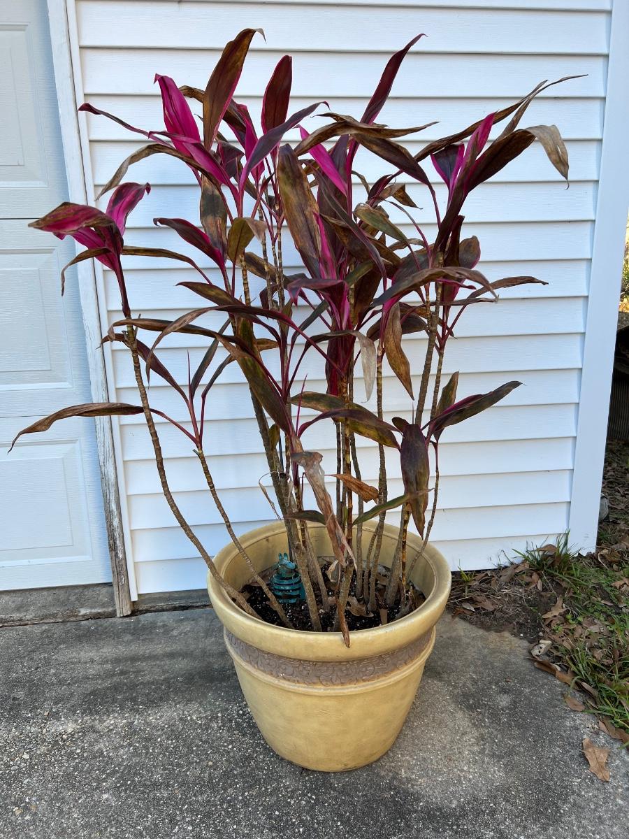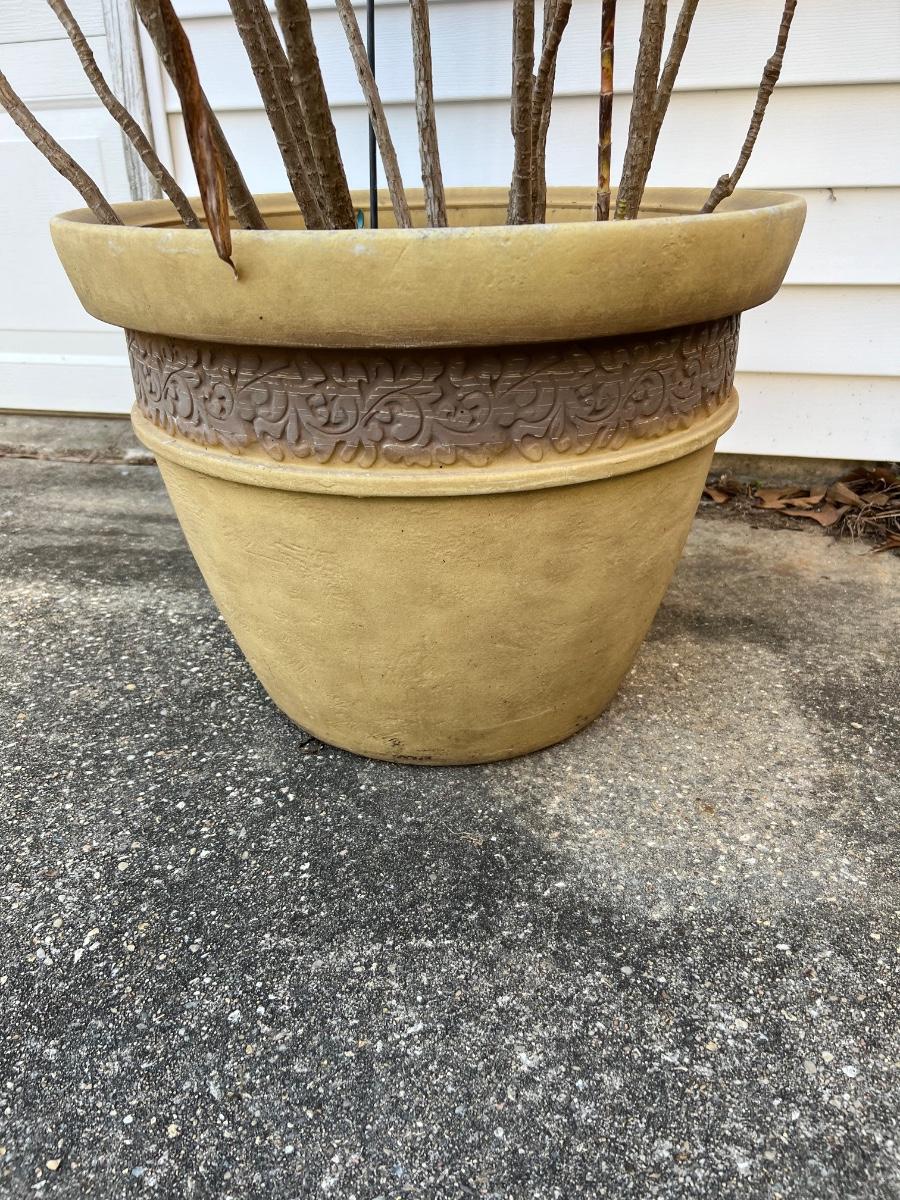 Beige Planter is plastic, measures 15 inches tall 20 inches wide. Ground to tallest point measures 53 inches.