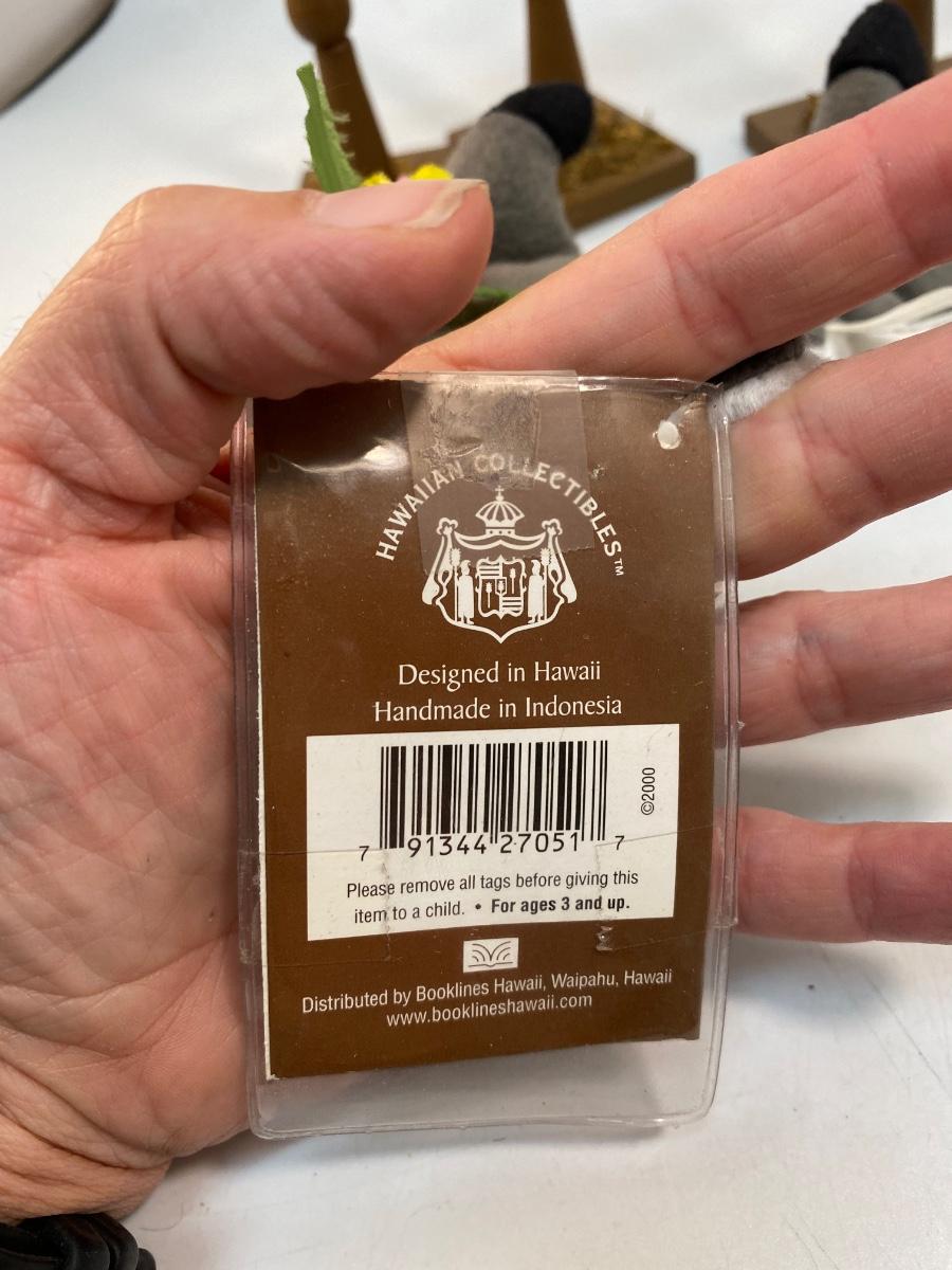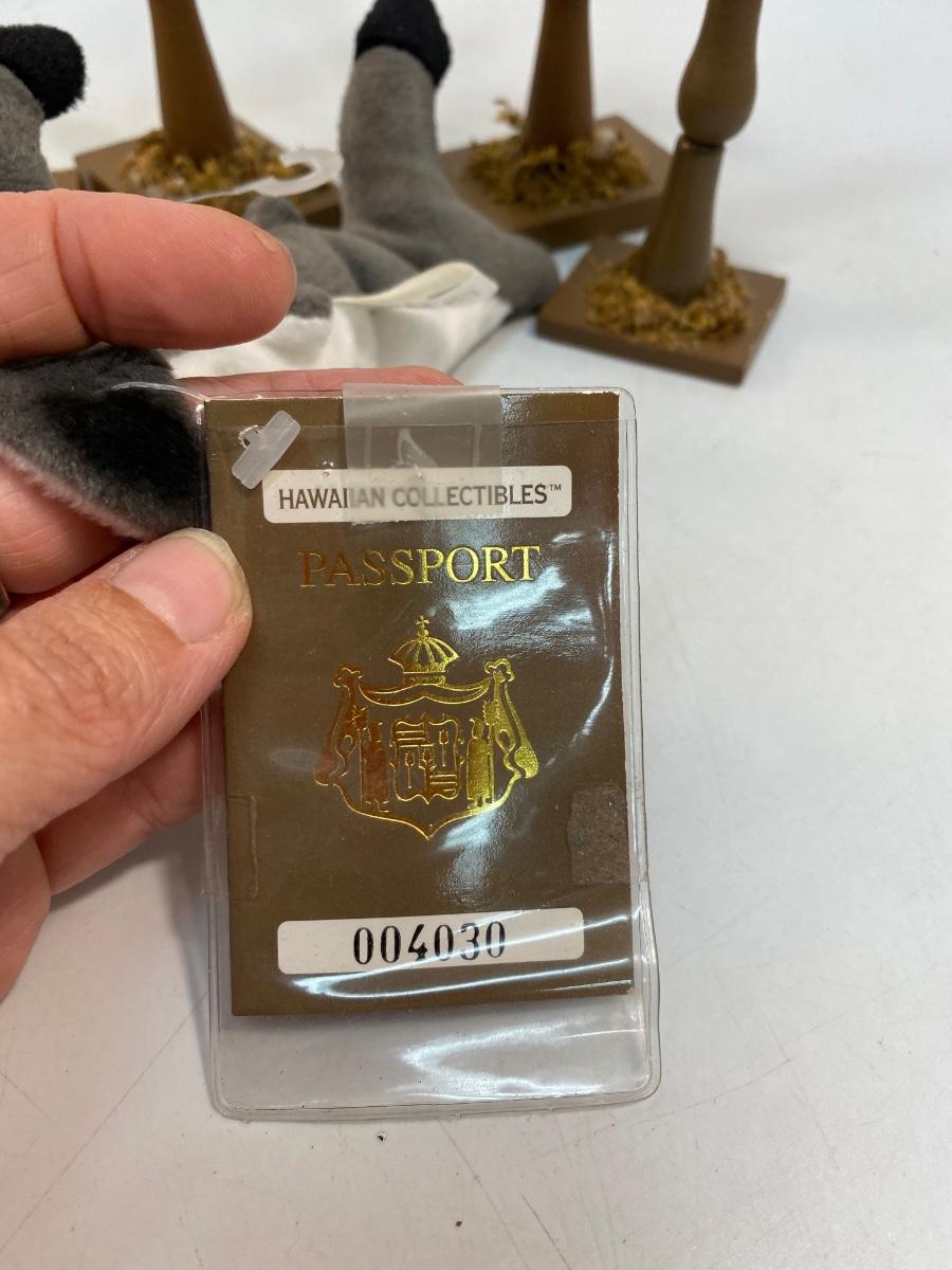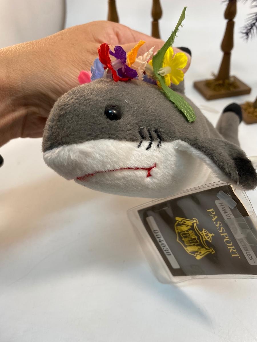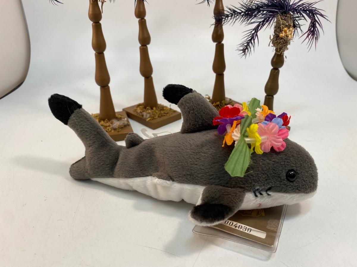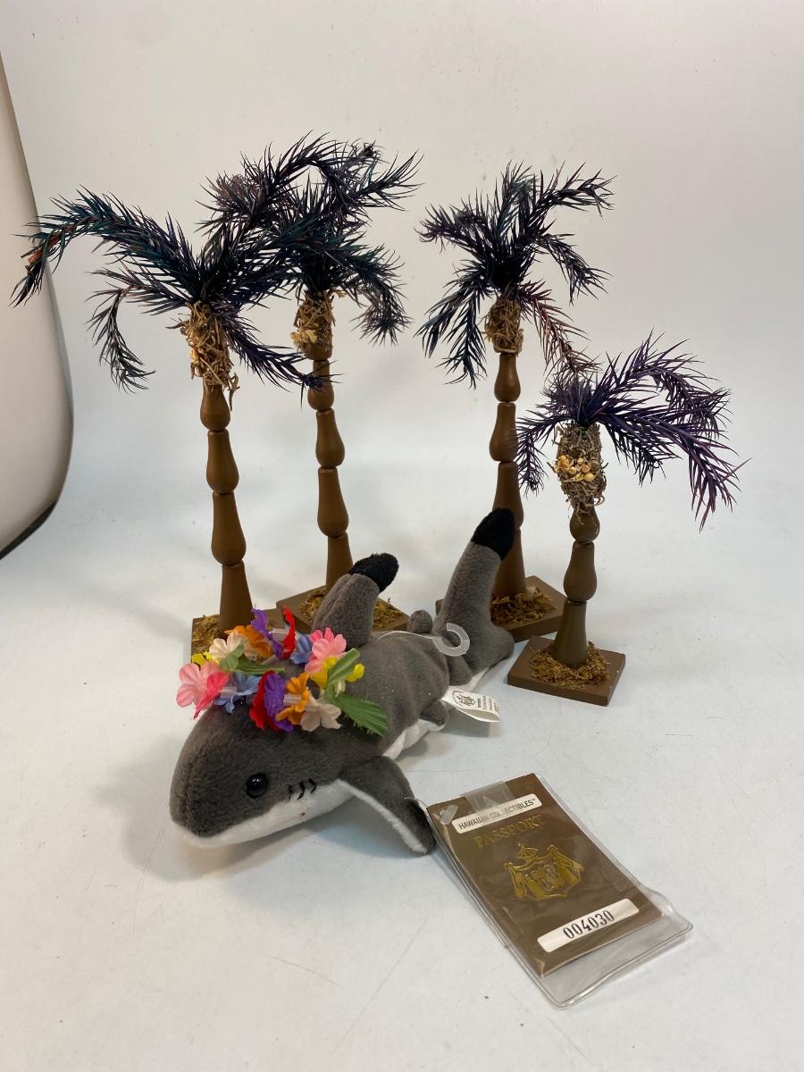 Hawaiian Collectibles Beanie Shark Nemonemo Plush Stuffed Animal and Faux Palm Trees. Shark in good condition, about the size of a beanie baby. Palm trees are made of painted wood beads and fake leaves.