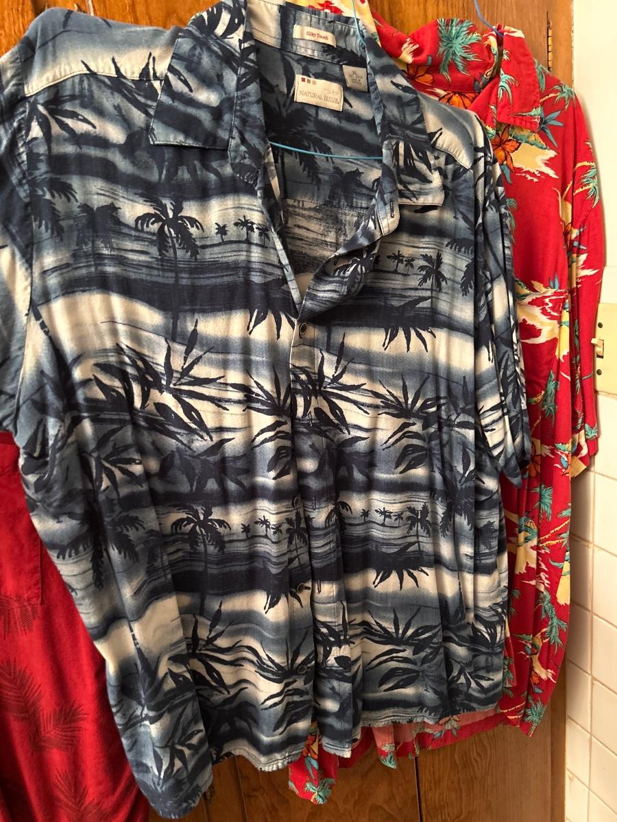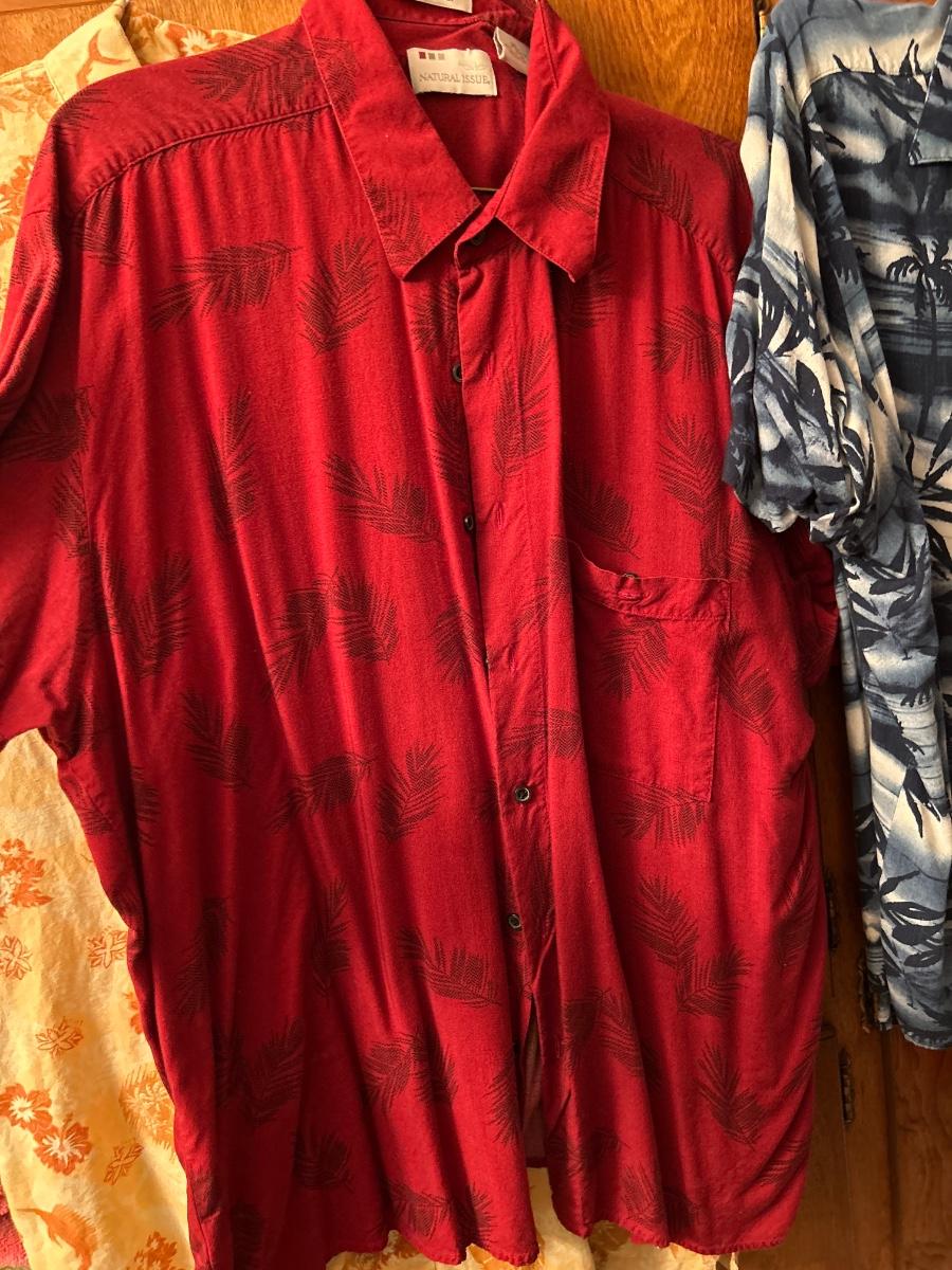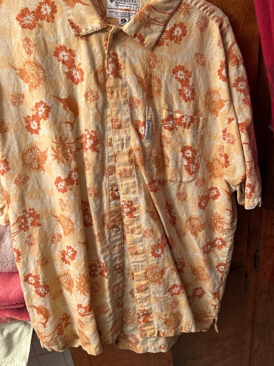 All men’s size extra large: the light orange one is Columbia, the next two are natural issue brand & the last one with palm trees and flowers is Cherokee brand.