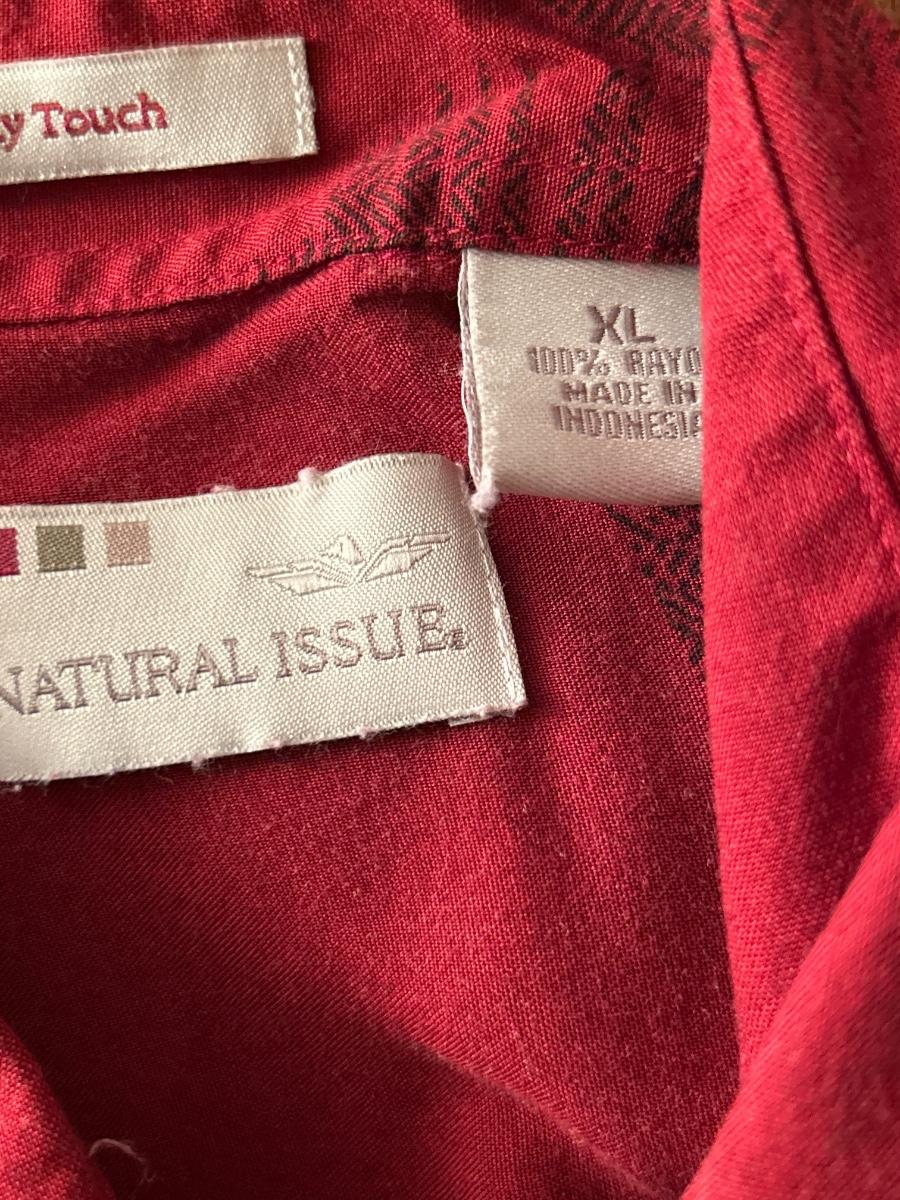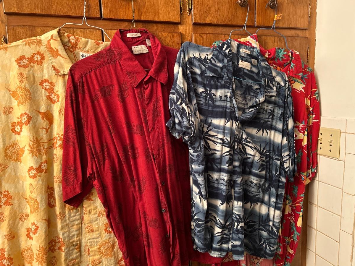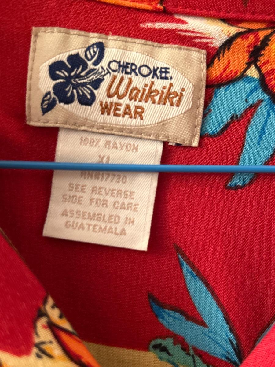 All men’s size extra large: the light orange one is Columbia, the next two are natural issue brand & the last one with palm trees and flowers is Cherokee brand.