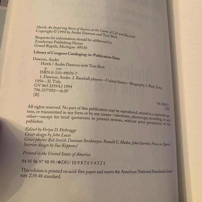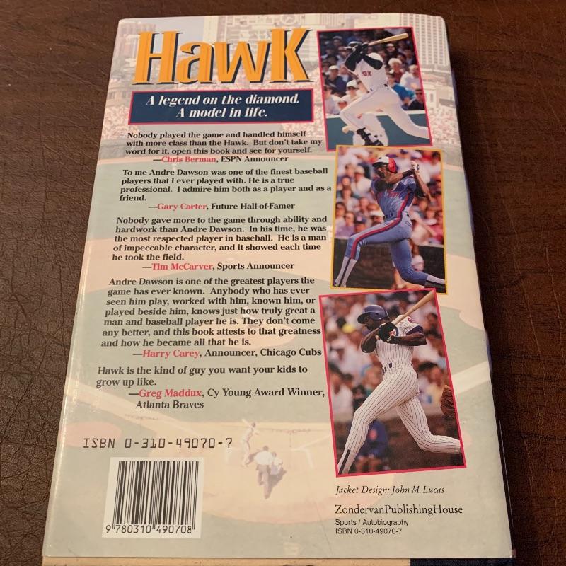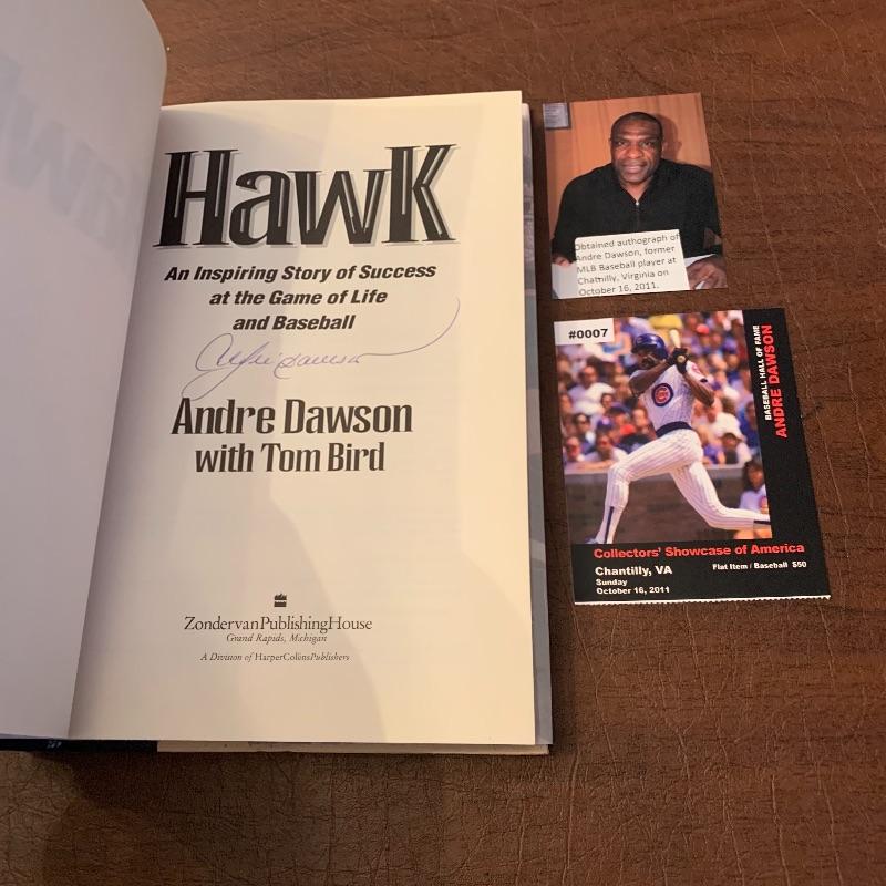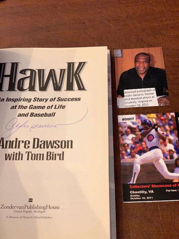 “Hawk” Andre Dawson autographed hardback book. The autograph was obtained at the collector showcase in Chantilly Virginia on 10/16/2011.