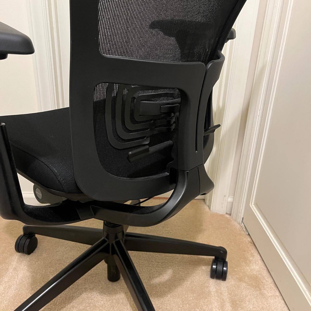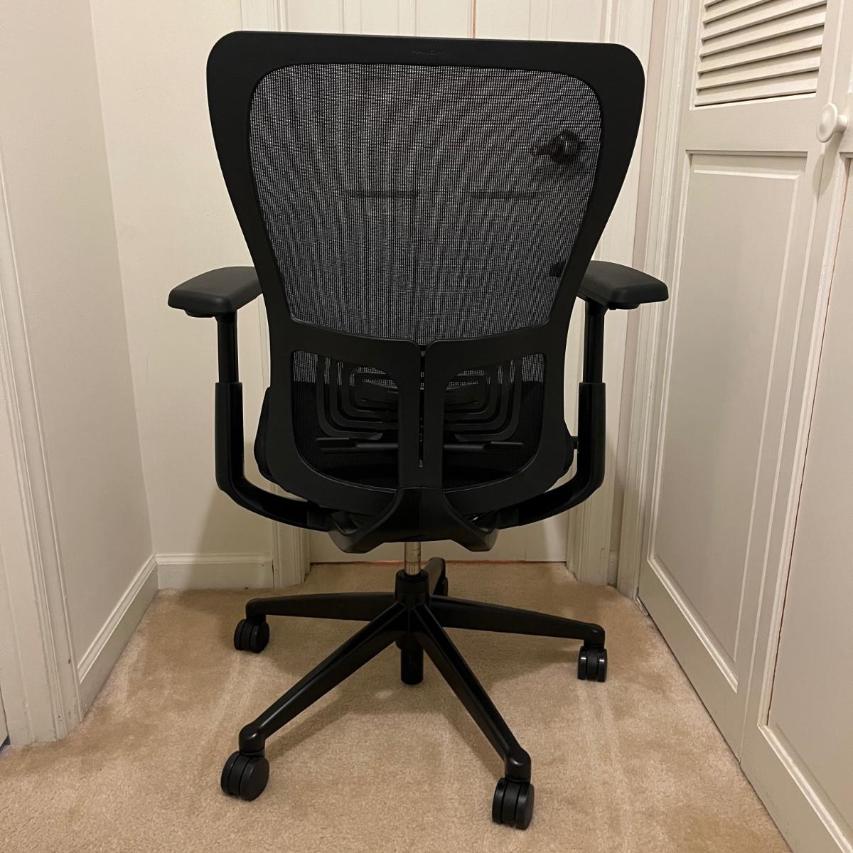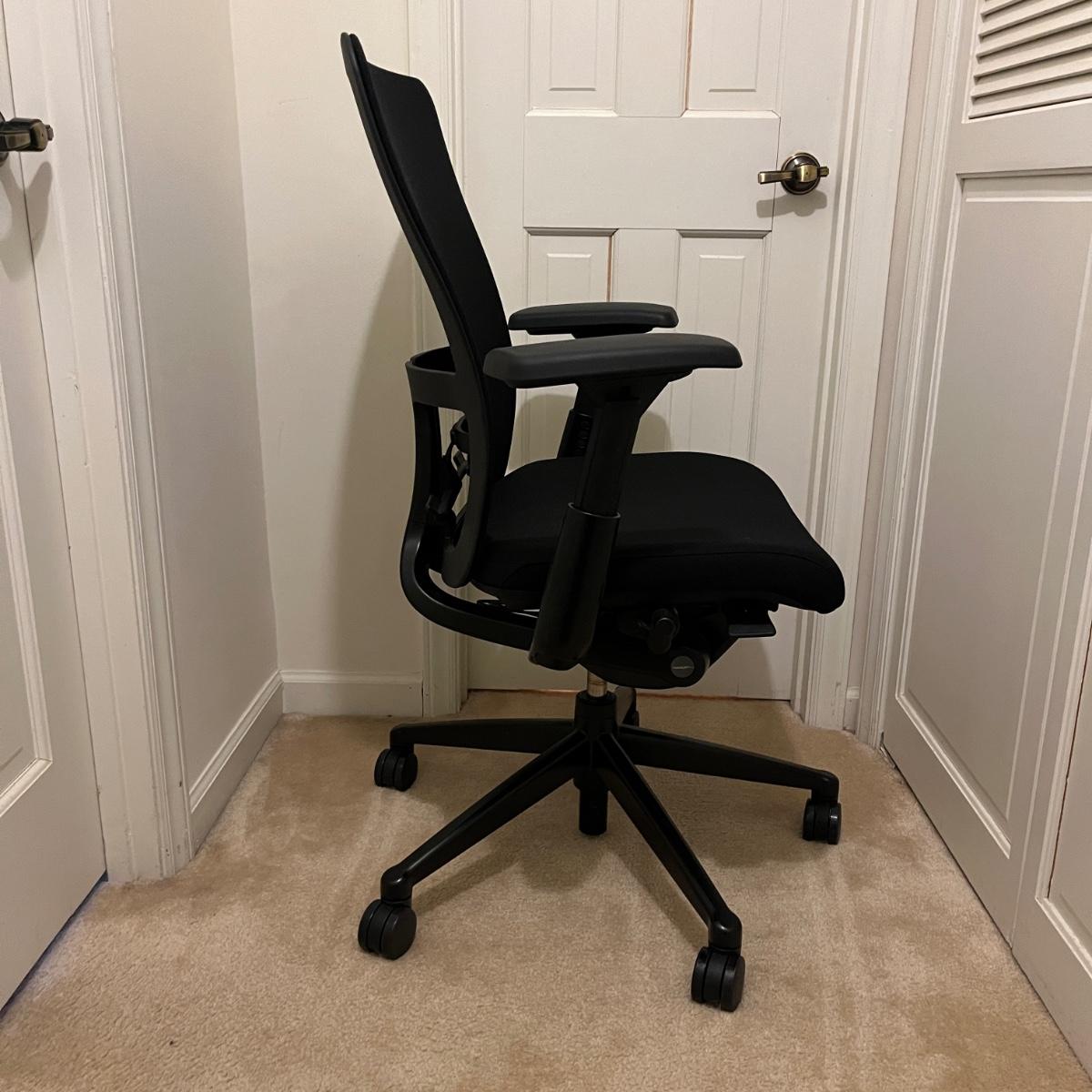 Lot includes a Haworth office chair with adjustable height and armrests. Chair measures 27” x 27” x 42”H at its tallest setting. It appears that oil is present on the shaft, see pictures.