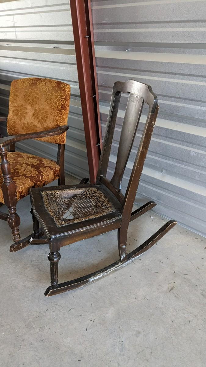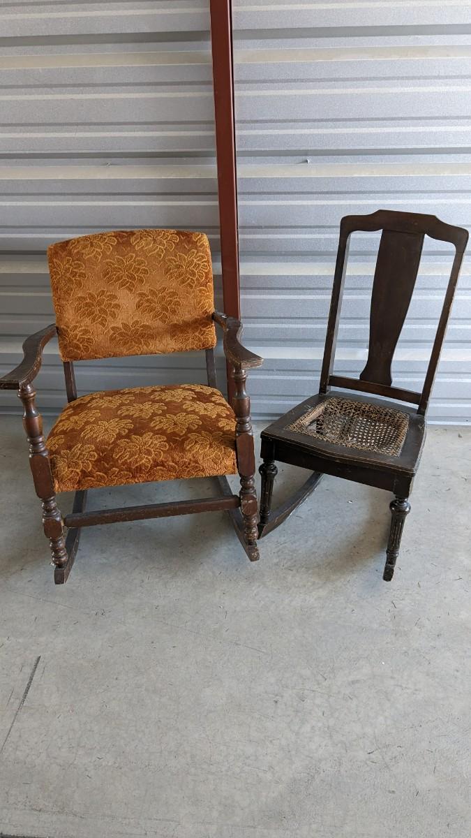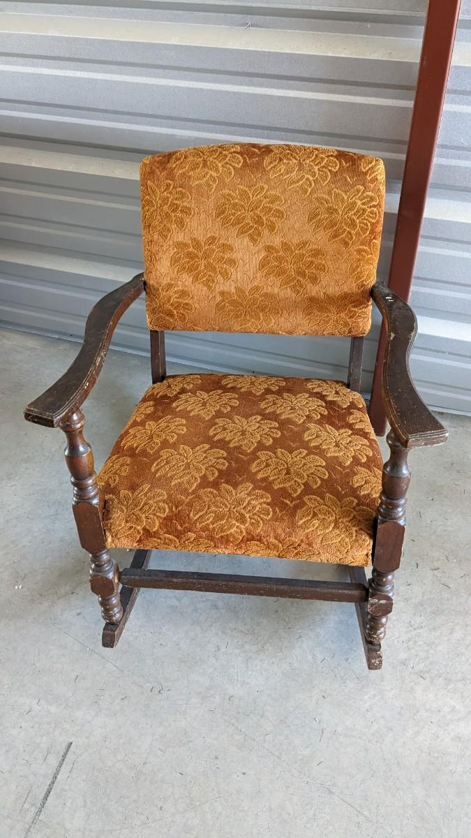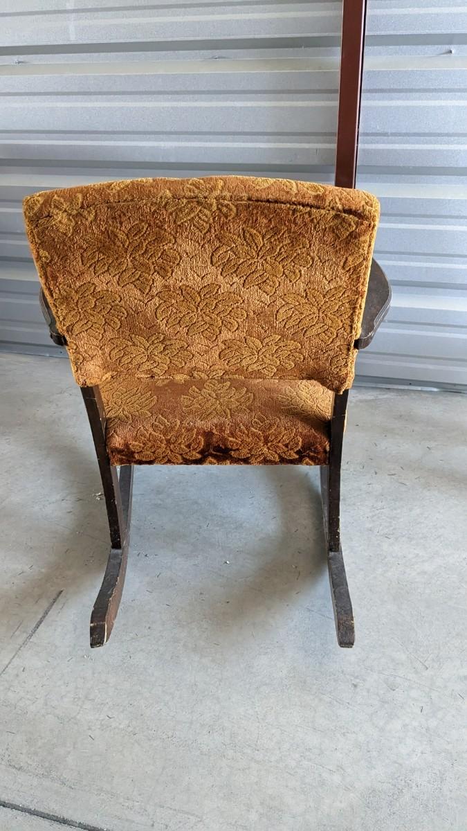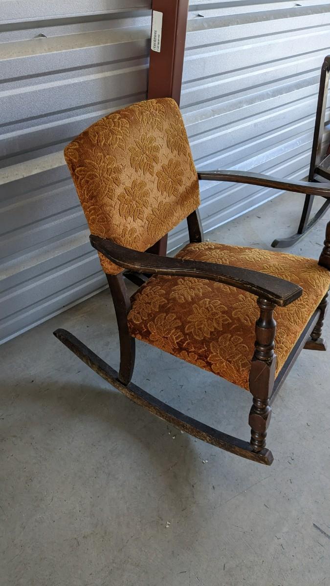 paper tag partially intact Haywood rocking chair, feet measure 29.5" long, seat is 16"x16", 15.25" off the ground, 33.25" tall. Multiple areas of wear found note in photos. Includes 24"x18.5"x 30.5" vintage upholstered petite wide rocker, seat sits 17" off ground with 31.25" feet, upholstery in excellent condition but a bit dusty with various wear showing to the wood. No shipping. 2616