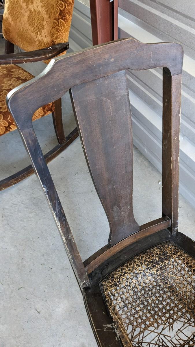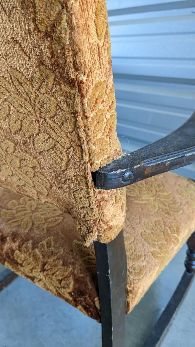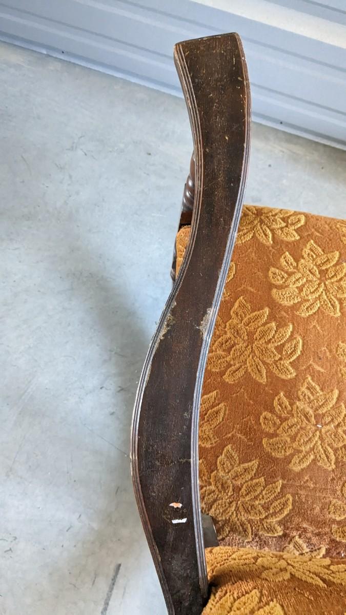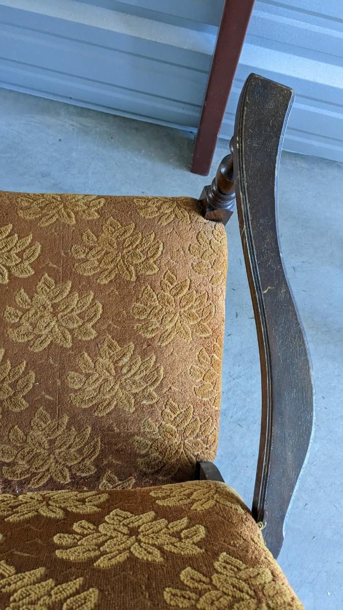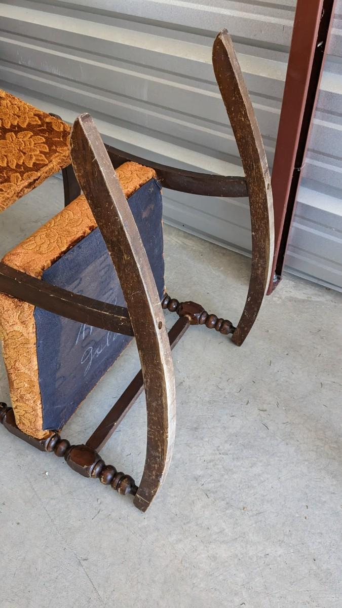 paper tag partially intact Haywood rocking chair, feet measure 29.5" long, seat is 16"x16", 15.25" off the ground, 33.25" tall. Multiple areas of wear found note in photos. Includes 24"x18.5"x 30.5" vintage upholstered petite wide rocker, seat sits 17" off ground with 31.25" feet, upholstery in excellent condition but a bit dusty with various wear showing to the wood. No shipping. 2616