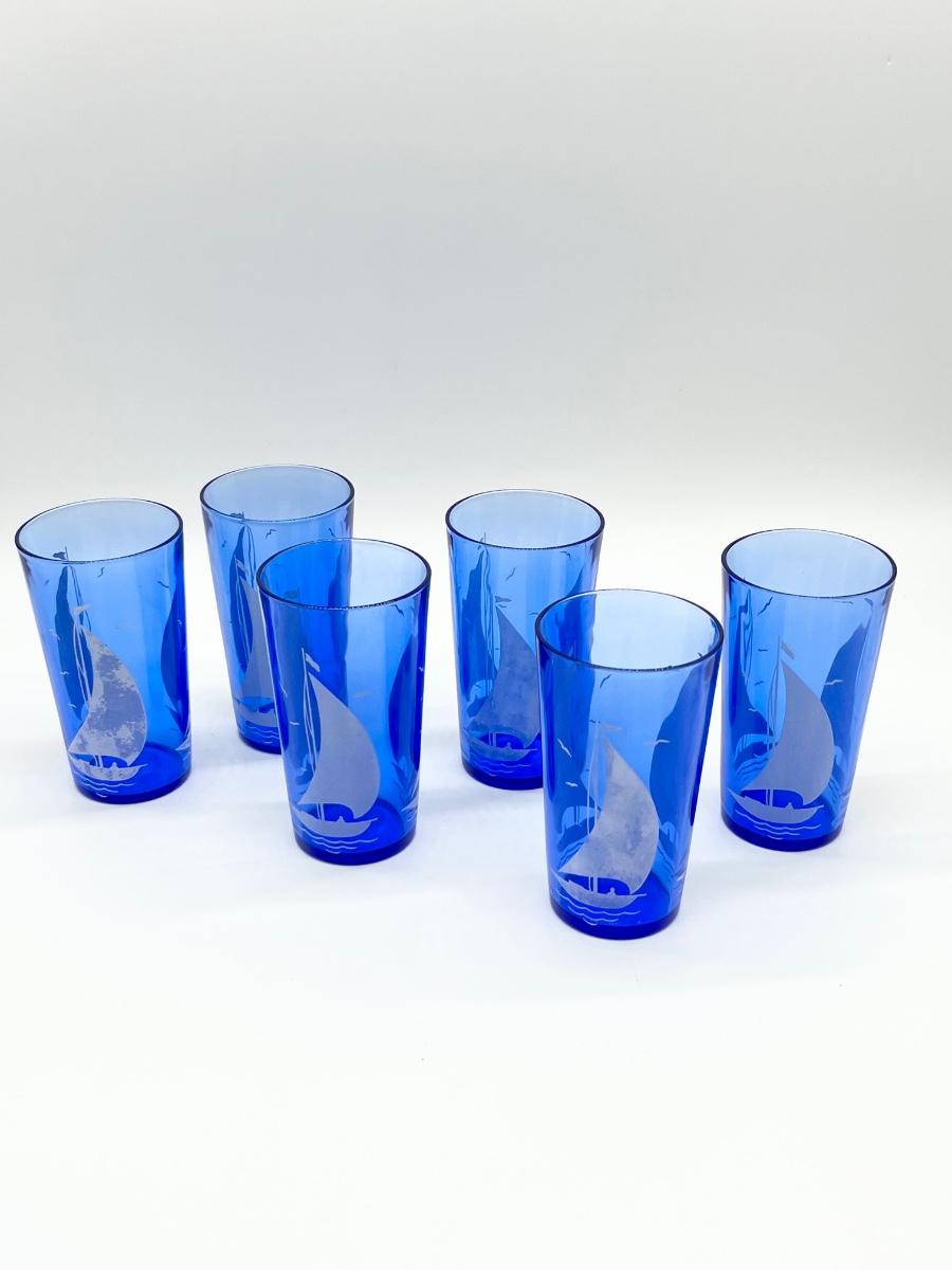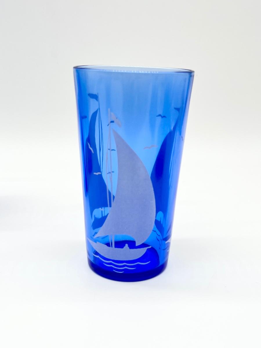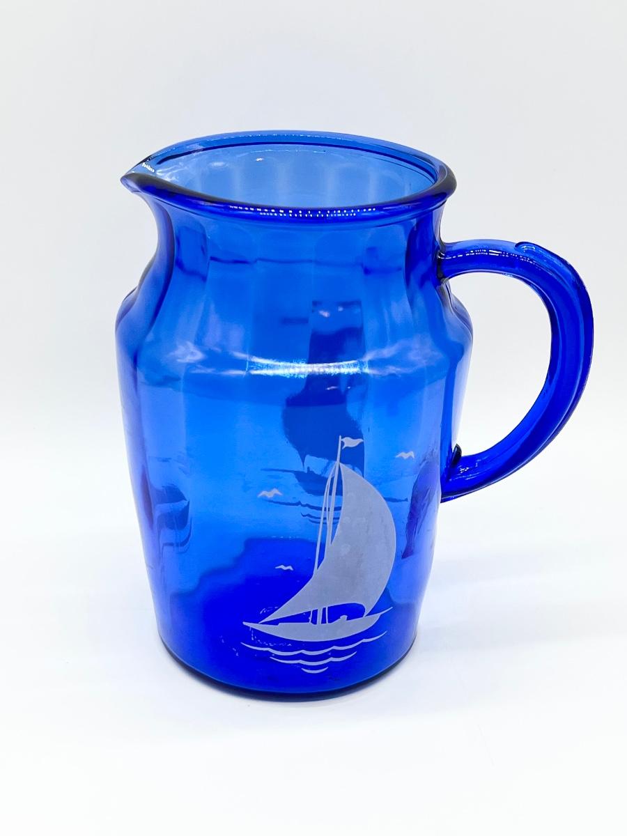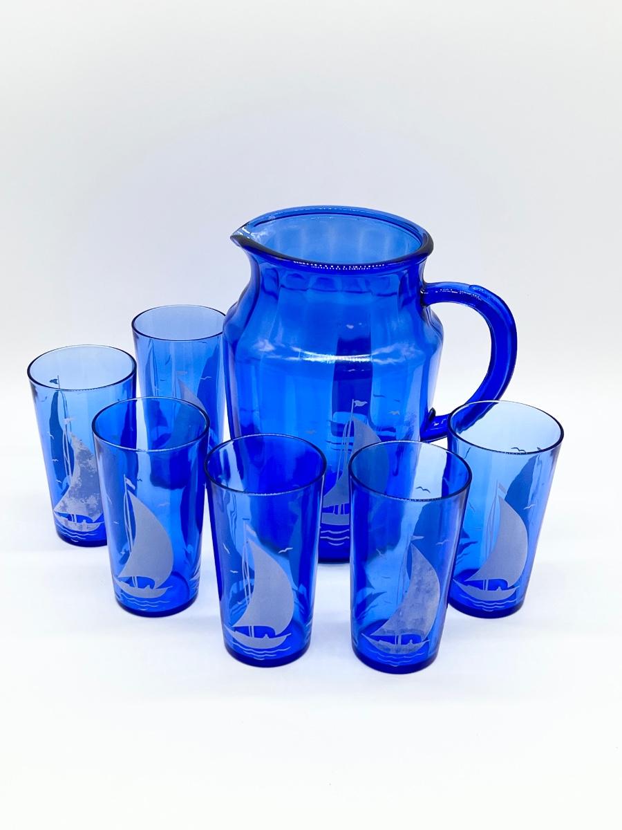 HAZEL ATLAS ~ Cobalt Blue Sailboat Pitcher & Tumbler Set