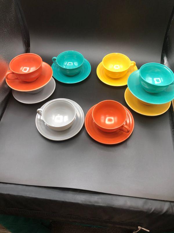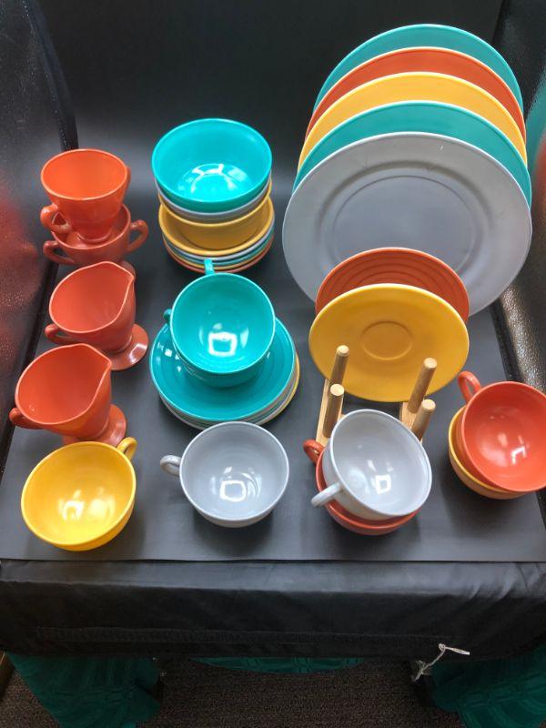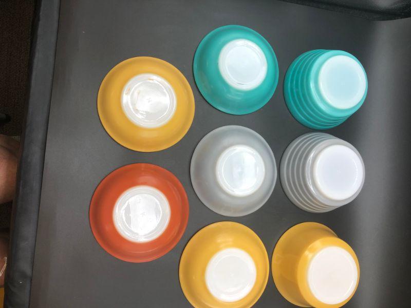 Huge lot of Hazel Atlas dishware. Colorful milk glass in Platonite & Ovide patterns. Did not notice any chips in the pieces. Everything pictured is included in this auction. 33 pieces total.