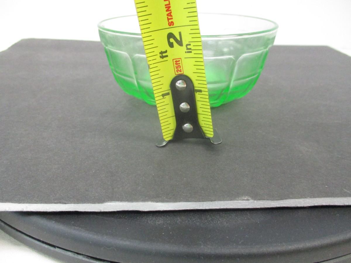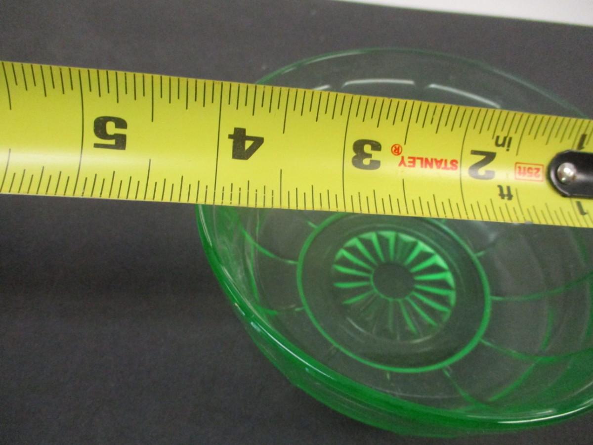 The Hazel Atlas Vaseline Green Uranium Glass Bowl is a stunning piece of decorative glassware. This bowl features a beautiful green color that glows under black light, thanks to the presence of uranium in the glass. It is a unique and eye-catching addition to any home decor, adding a touch of vintage charm and elegance. Perfect for displaying flowers or serving snacks, this bowl is sure to be a conversation starter in any room.