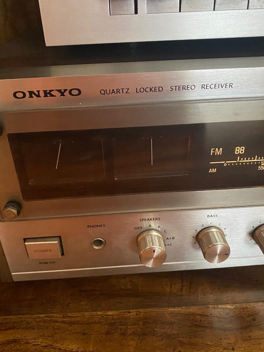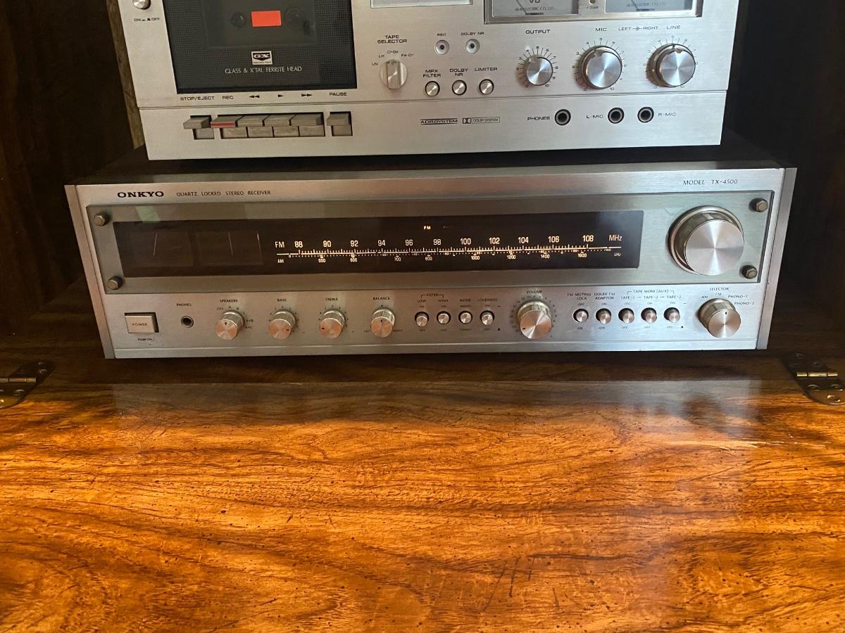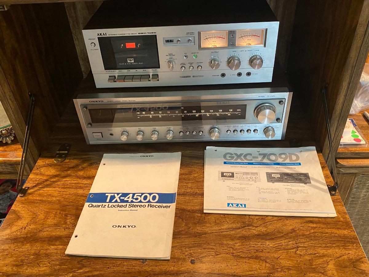 Vintage ONKYO TX-4500 Stereo Receiver & AKAI GXC-709D Cassette Deck with Speakers. Both tested and work. Tape deck may need to be cleaned due to age, tape tested was wobbly sounding at first and evened out a little after playing for a bit. There is a little static when knobs are turned probably also due to dust and age. In good condition. Receiver gets loud and speakers hold up. No name on speakers or speaker boxes. Some of the display lights on receiver are not lighting up. Owner's manual for both.