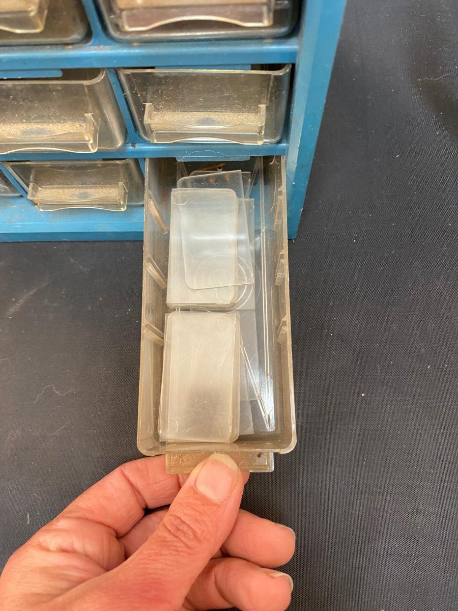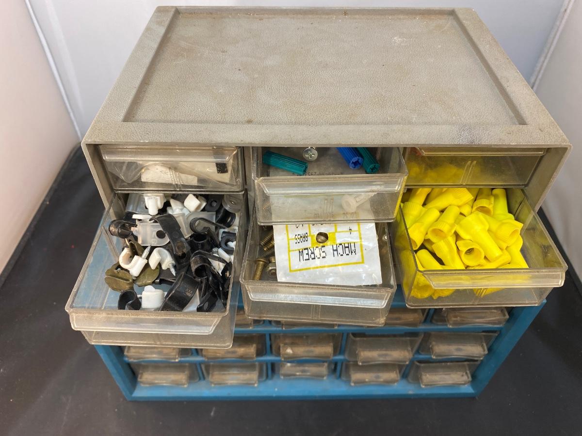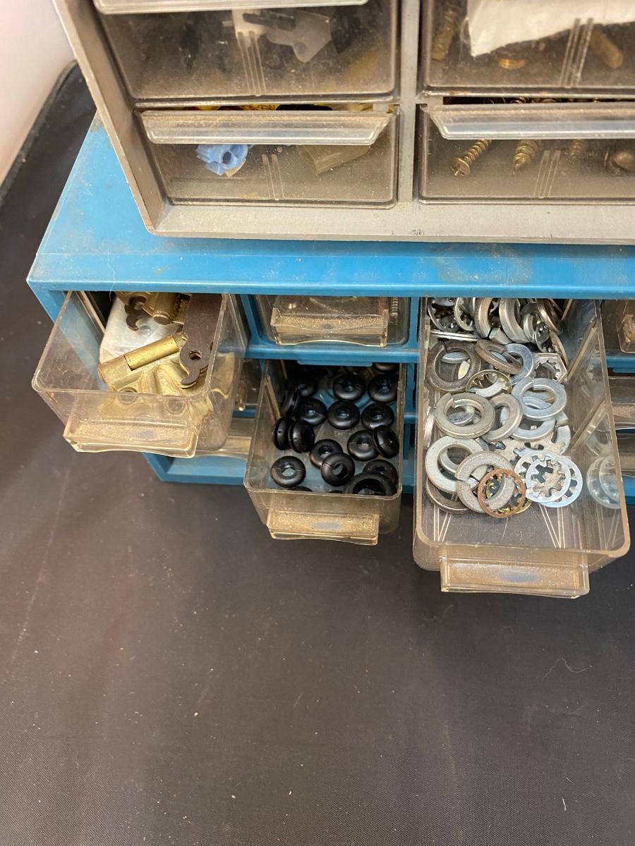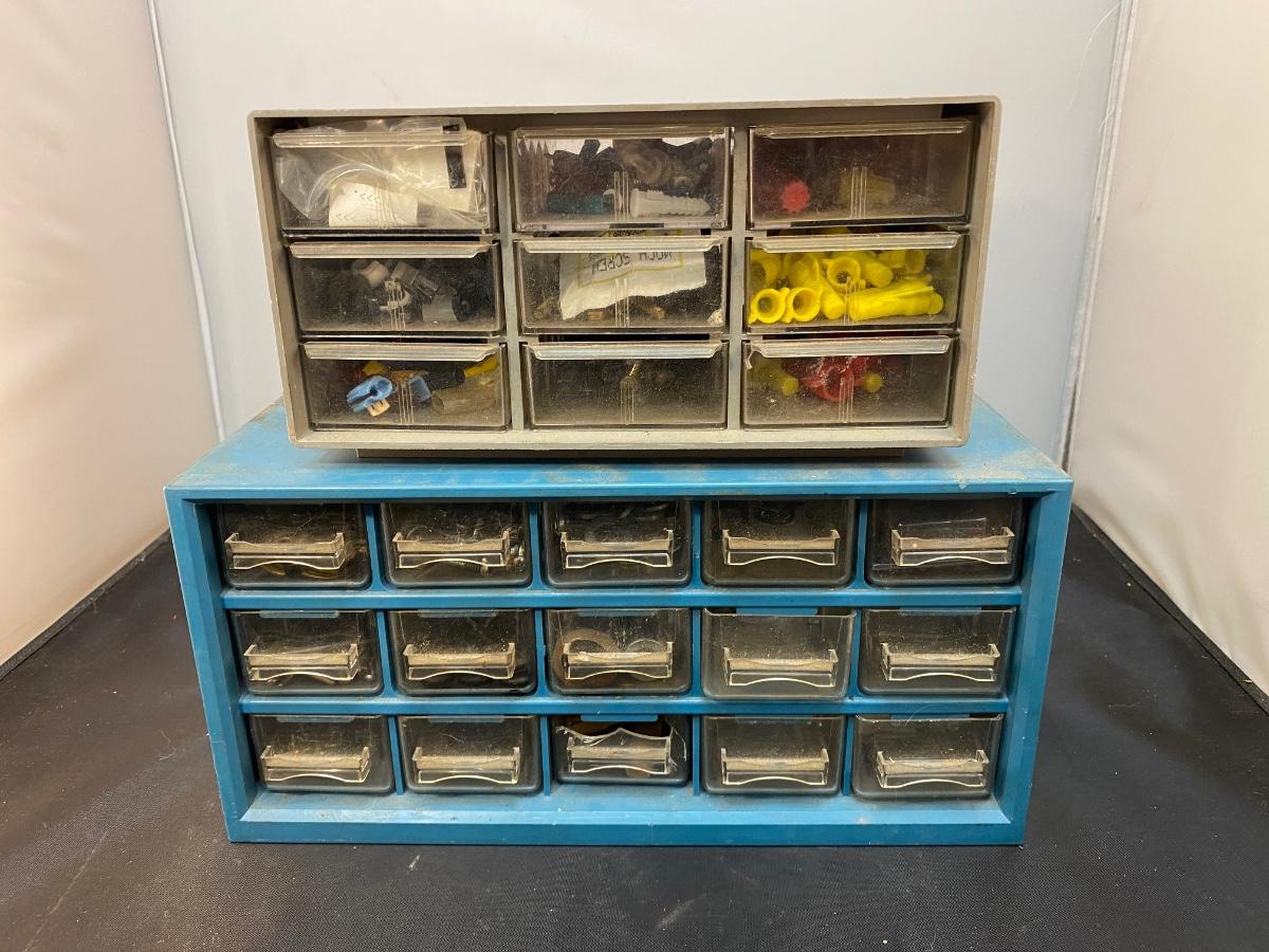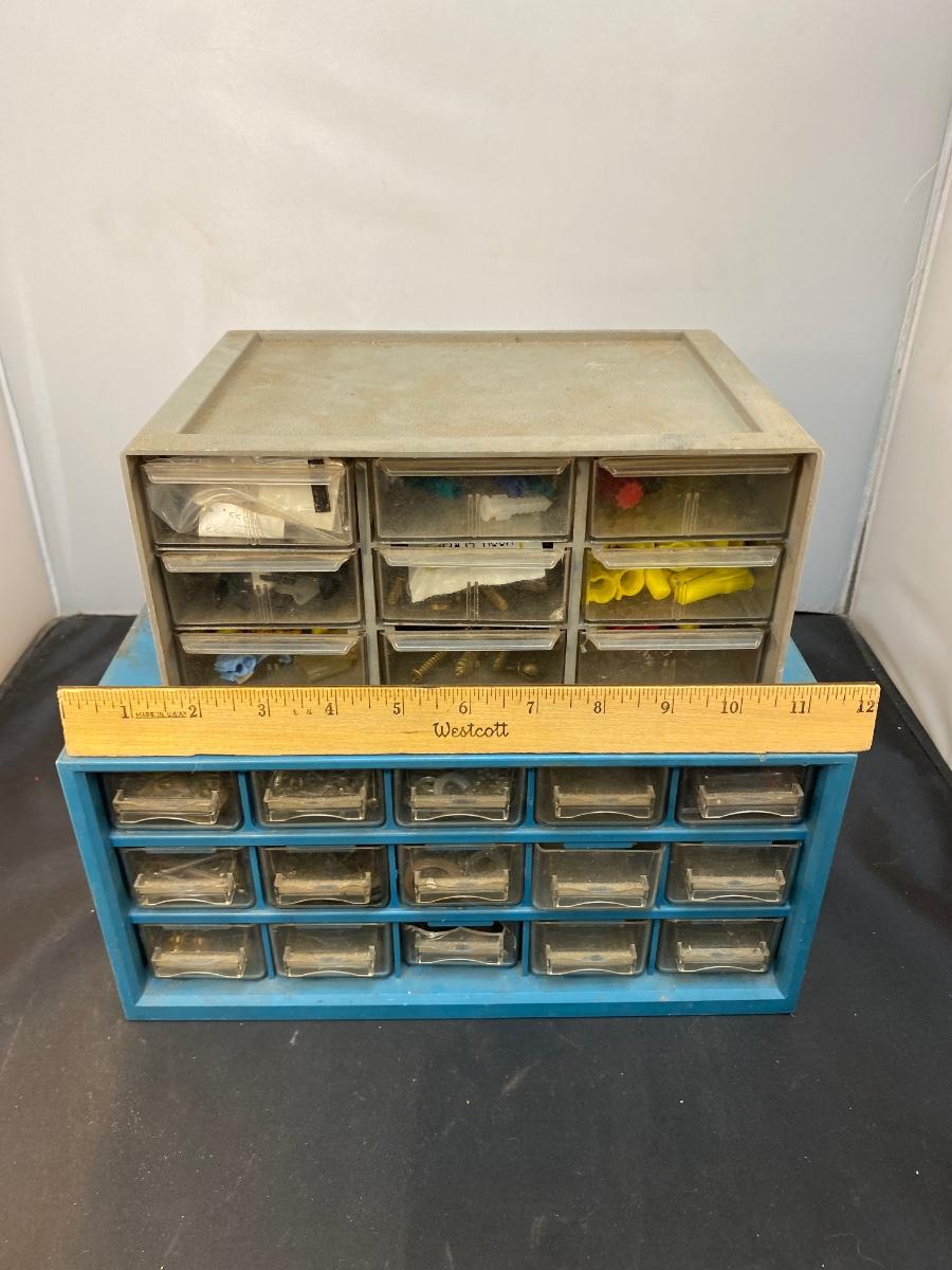 Pair of Multidrawer Organizers with Random Hardware Nails Screws. Various hardware items and some empty drawers. Dusty from garage use.