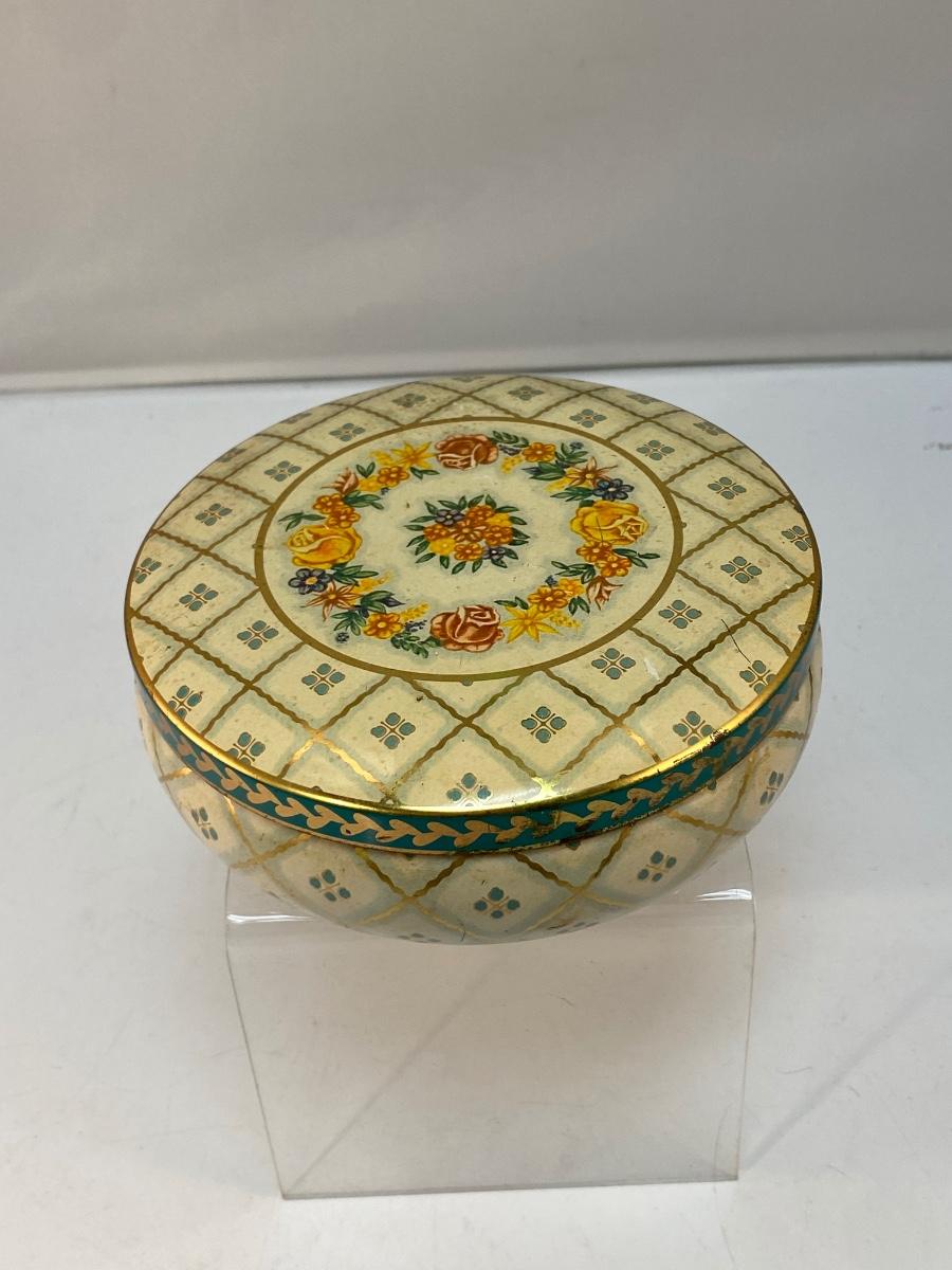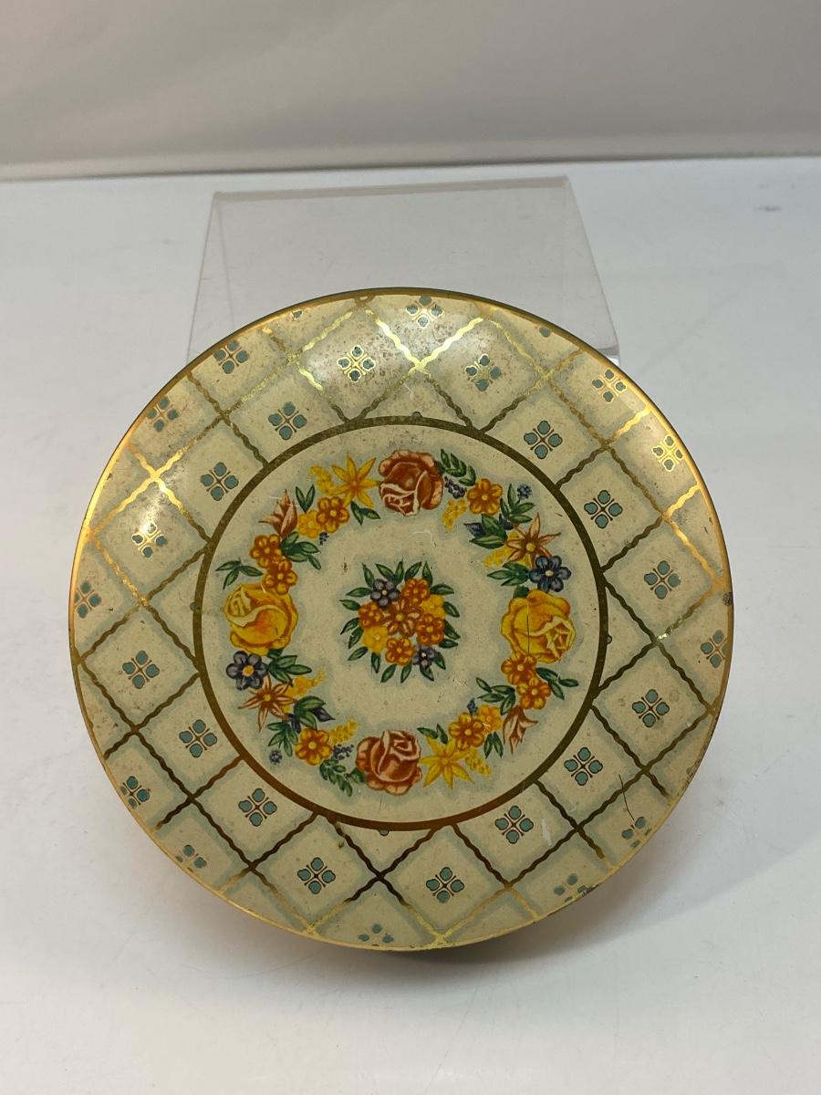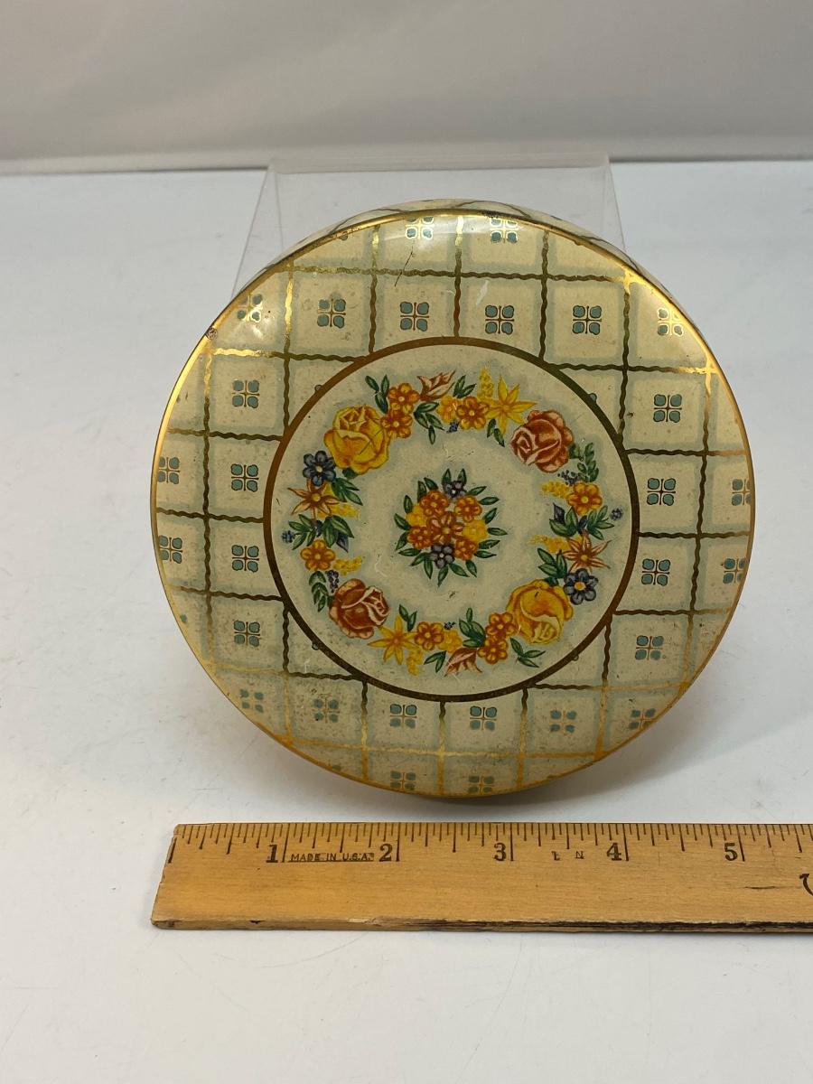 Vintage Round Daher Decorated Ware Powder Tin Flowers Checkered. In fair vintage condition. Would display nicely. Does have signs of age and wear. 5" diameter.