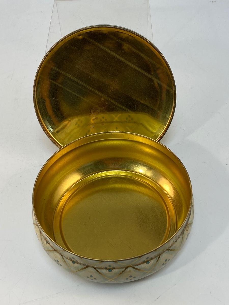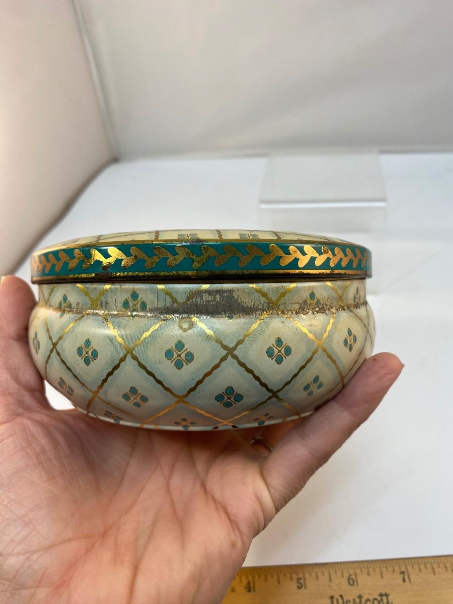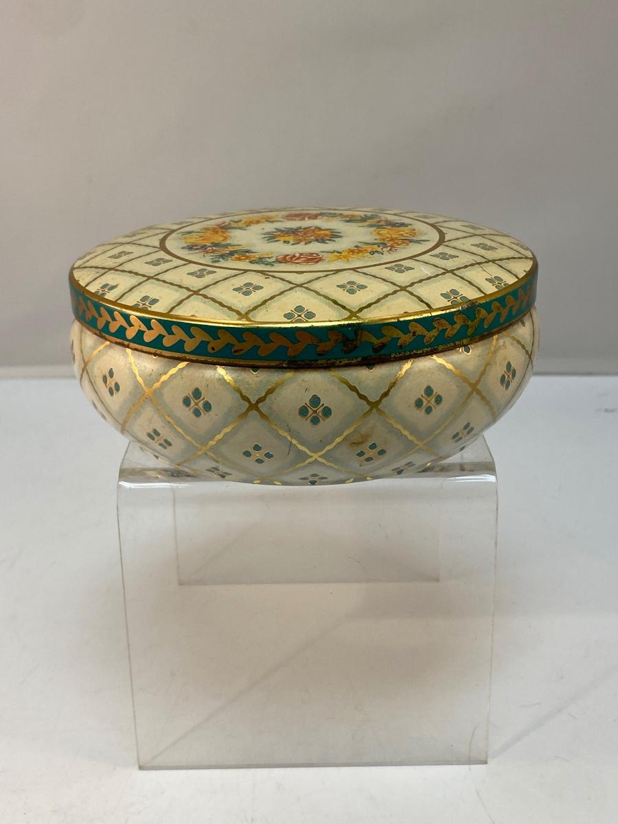 Vintage Round Daher Decorated Ware Powder Tin Flowers Checkered. In fair vintage condition. Would display nicely. Does have signs of age and wear. 5" diameter.