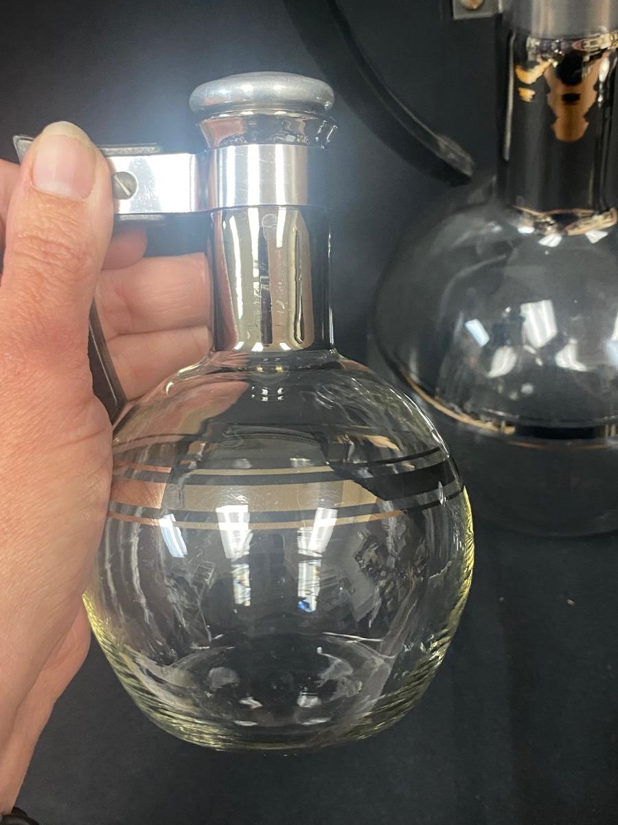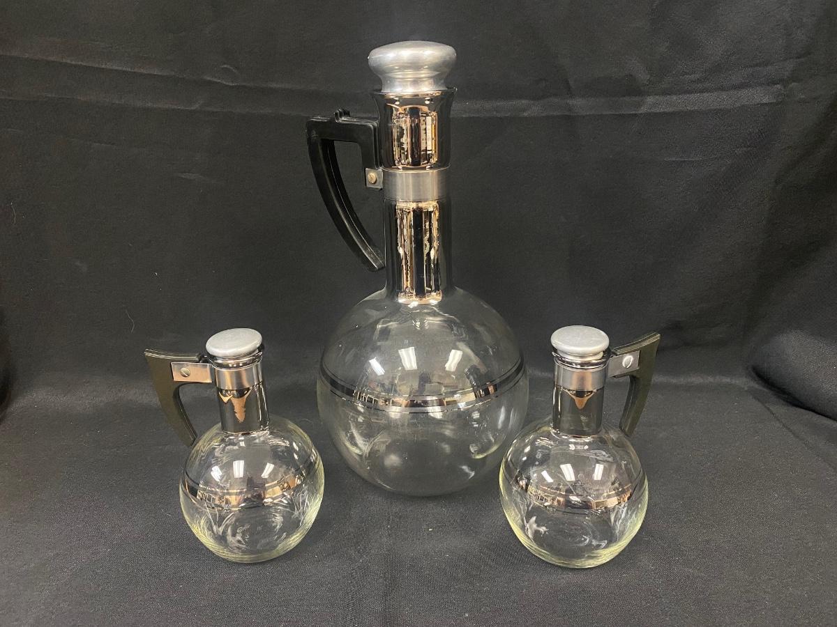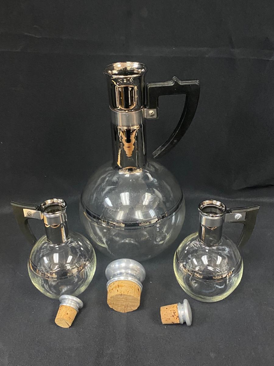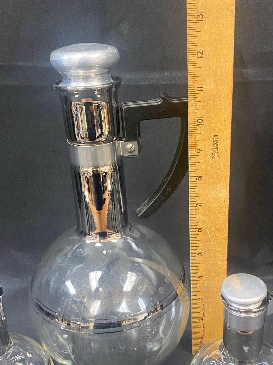 Vintage Retro MCM Inland Glass Company Silver Striped Bubble Bottom Carafe Set. In good vintage condition, very little wear to silver. No chips, corks on the stoppers look good as well. Great for use or display. The larger could use a bit more cleaning inside.