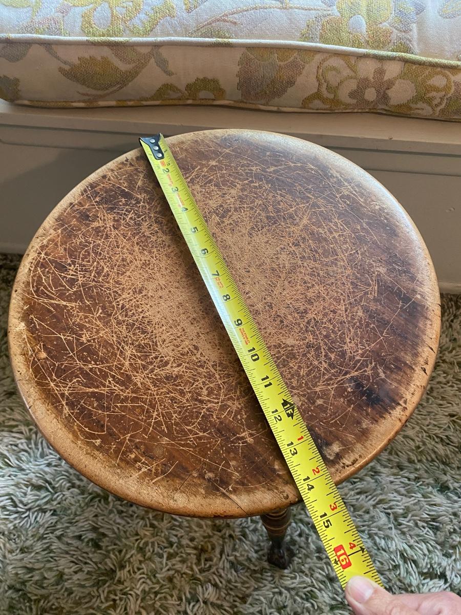 Small Vintage Round Claw Foot Stool Seat Turn to Adjust Height. In vintage used condition. Turns smoothly. Great as seat or plant stand. About 14" diameter surface.