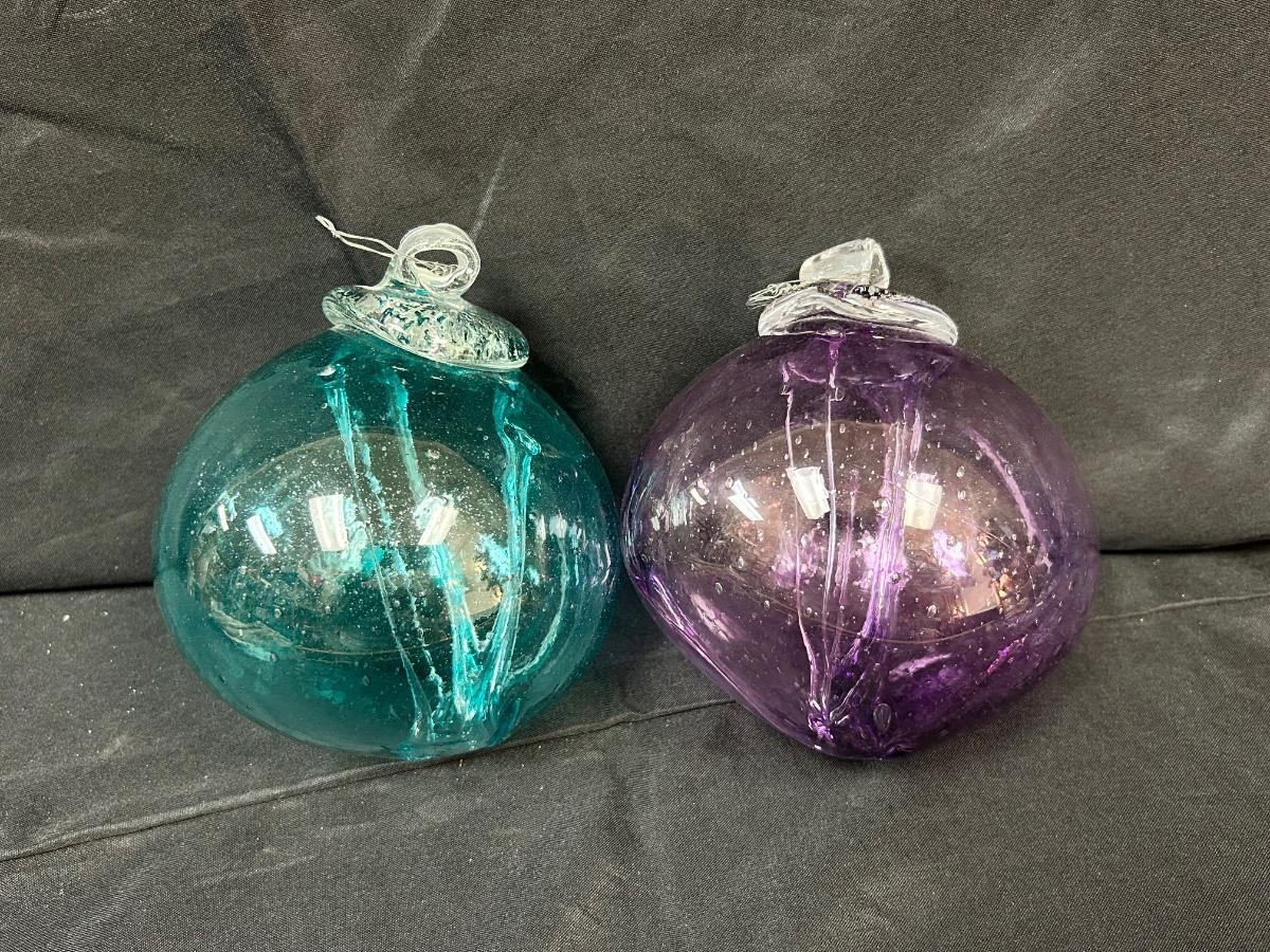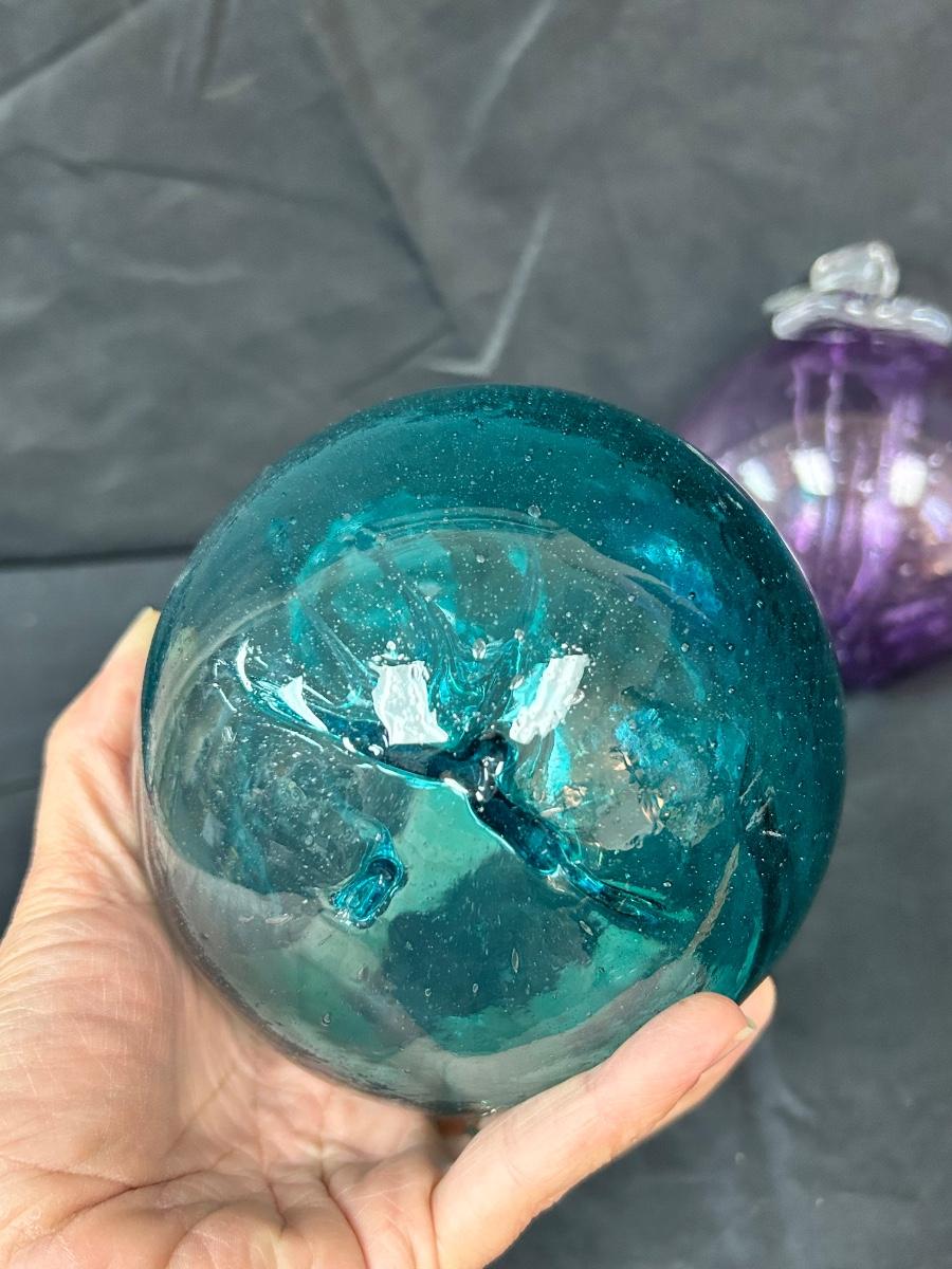 Turquoise Blue & Purple Blown Art Glass Hanging Orbs Fishing Net Floats. In good condition. Similar size but oddly shaped, not perfect orbs. No branding or artist marks. Large, 5" to 6" size. Have loop in top for hanging.