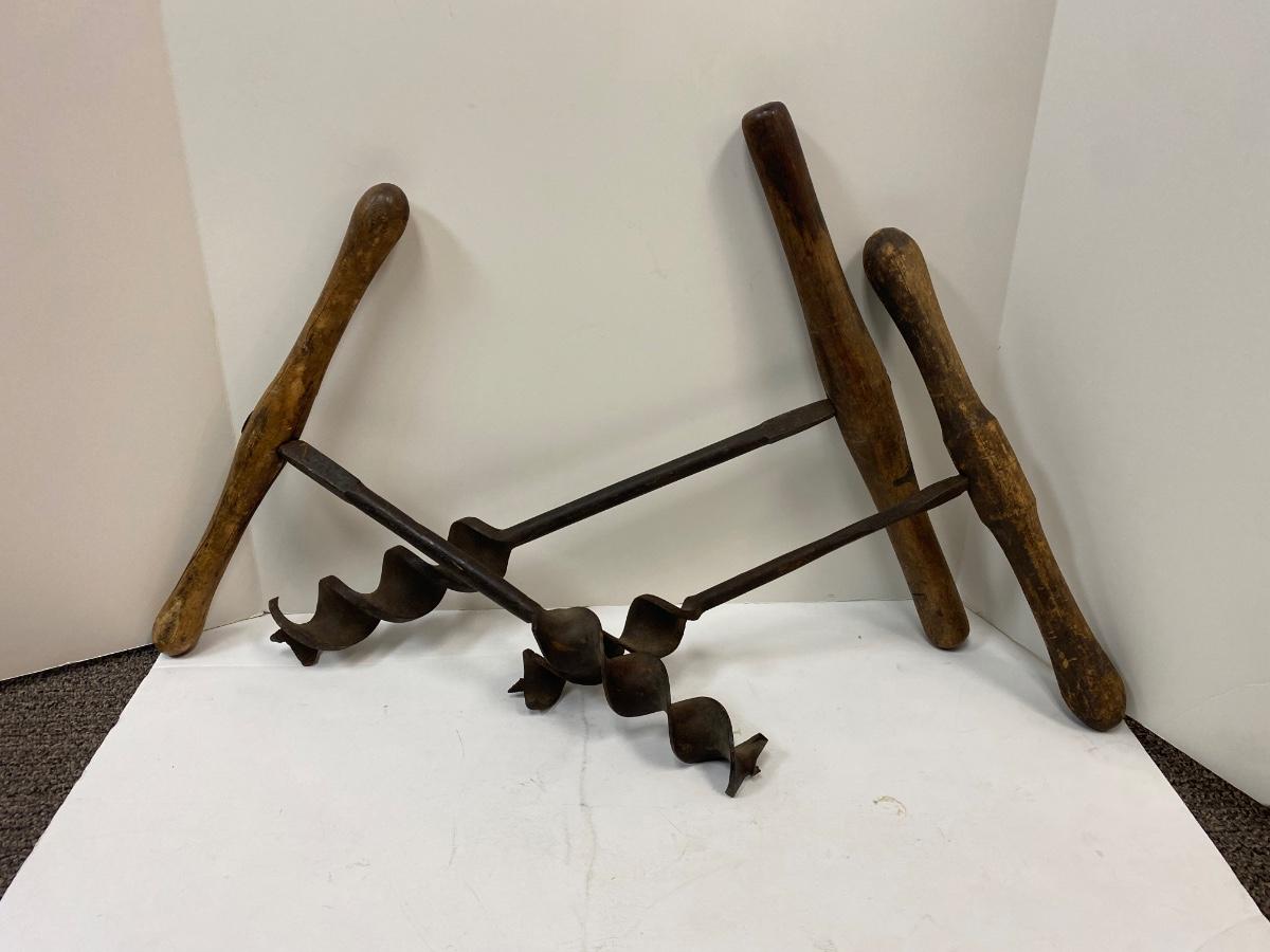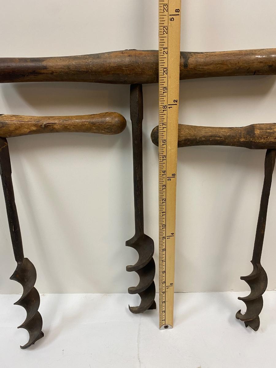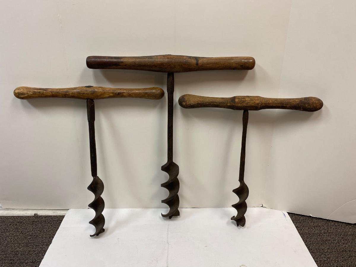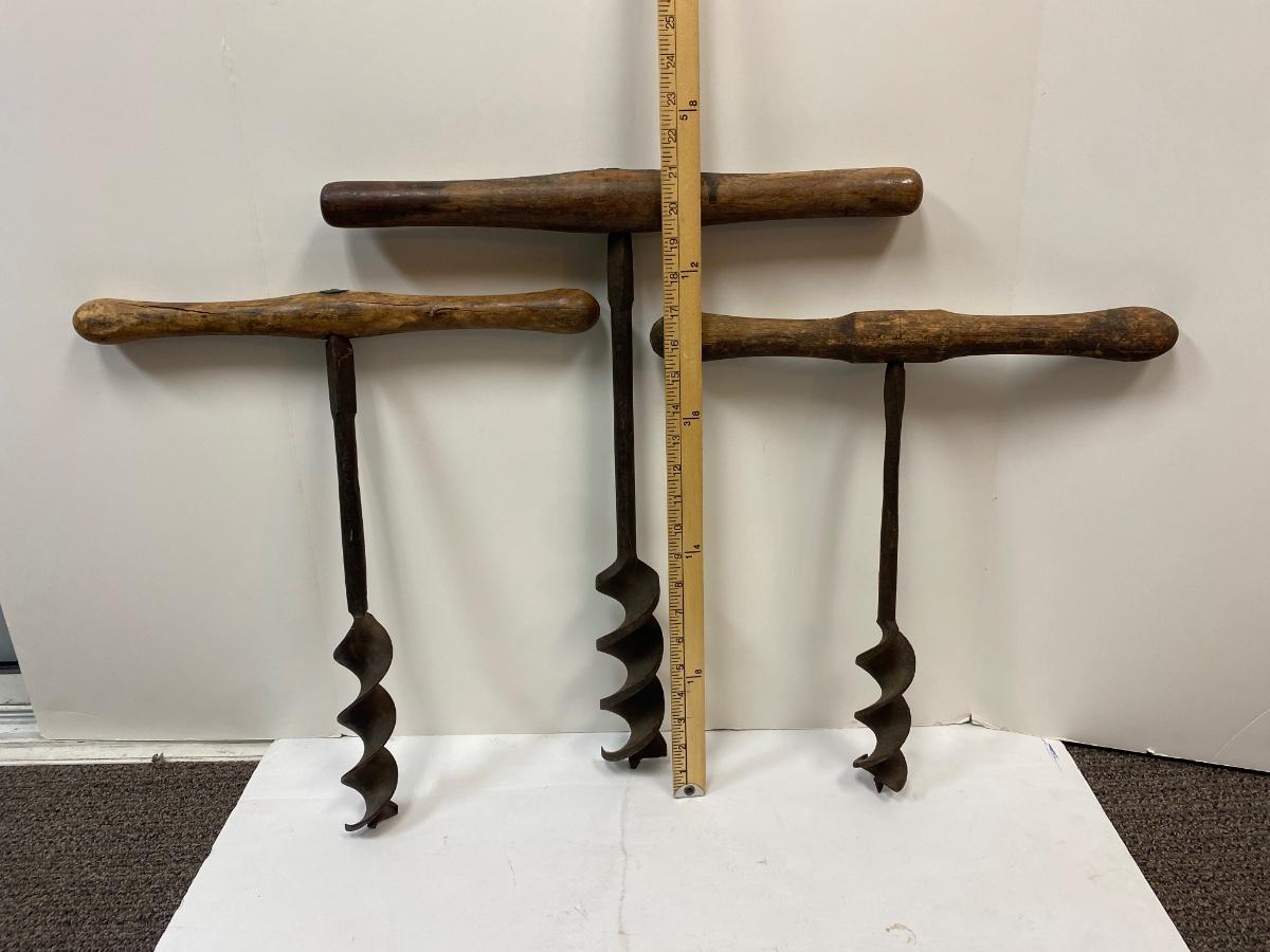 Lot of Antique Crude Spiral Cork Screw Augers Cast Steel Natural Wood Tools