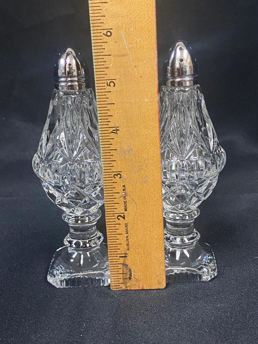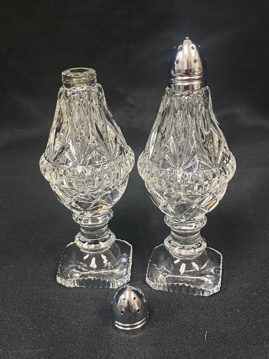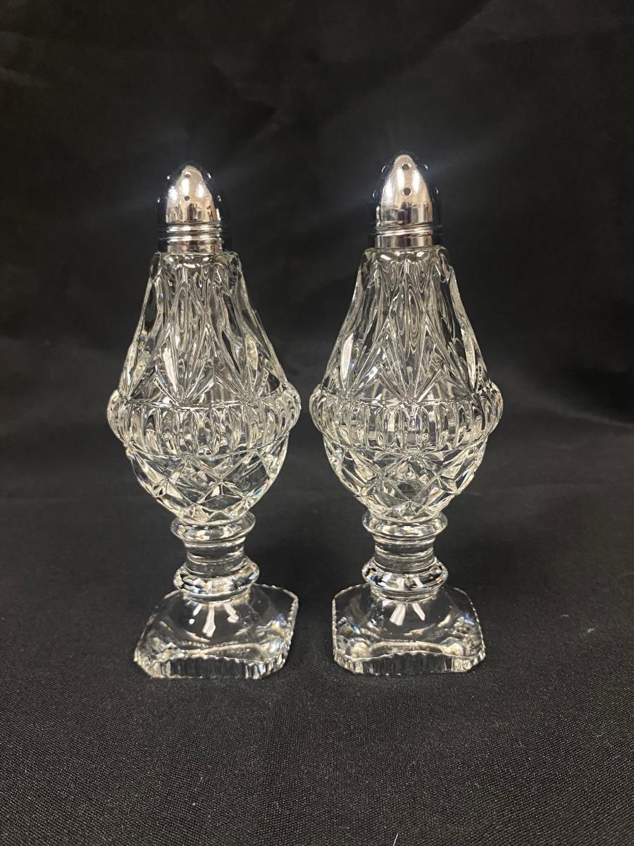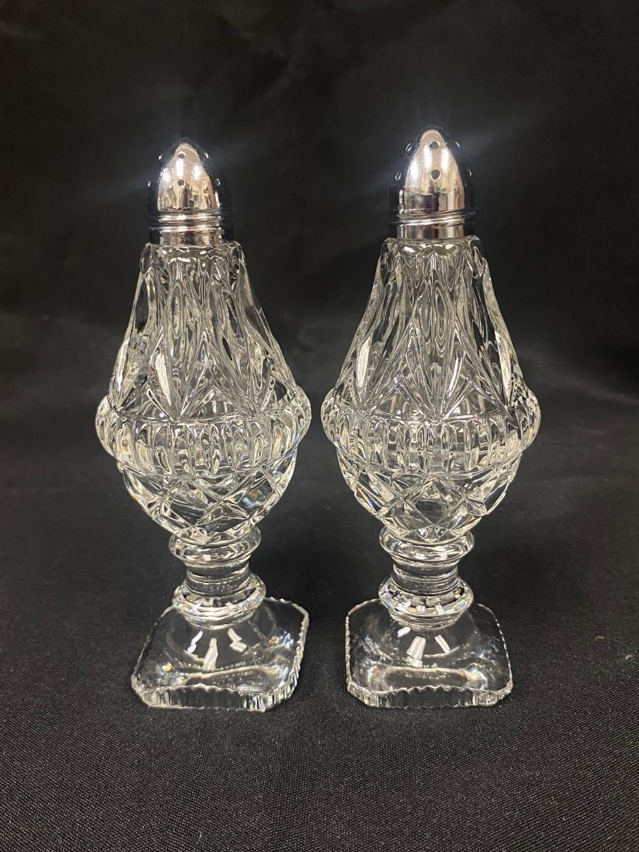 Pair of Cut Crystal Glass Salt & Pepper Shakers. In good condition. We were able to get one cap off but not the other, probably needs to soak a little. Almost 6" size.