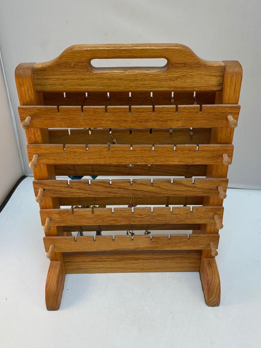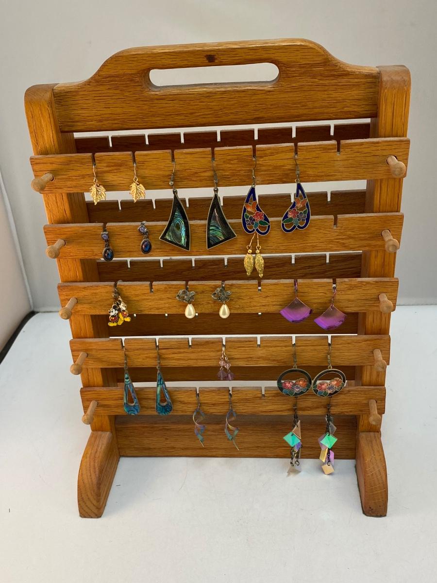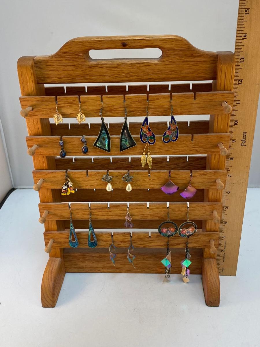 Retro Wood Earring Jewelry Holder Organizer Rack with Variety of Fashion Earrings. Double sided surface sitting rack. Wood slats move forward and back for easy jewelry storage and use. Comes with a variety of fashion earrings included. About 14" tall and 10" wide.