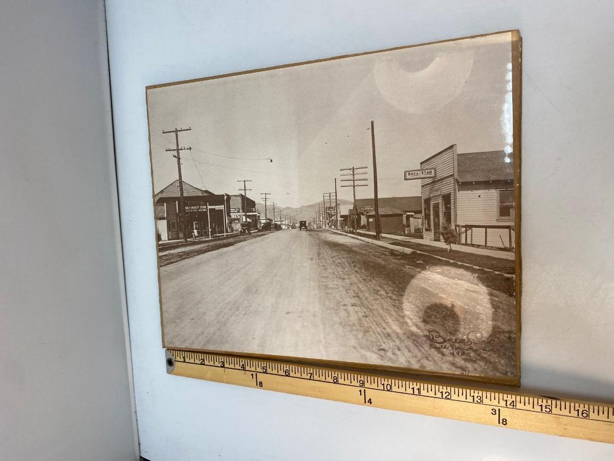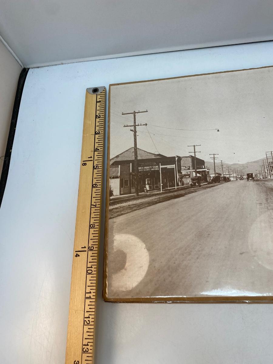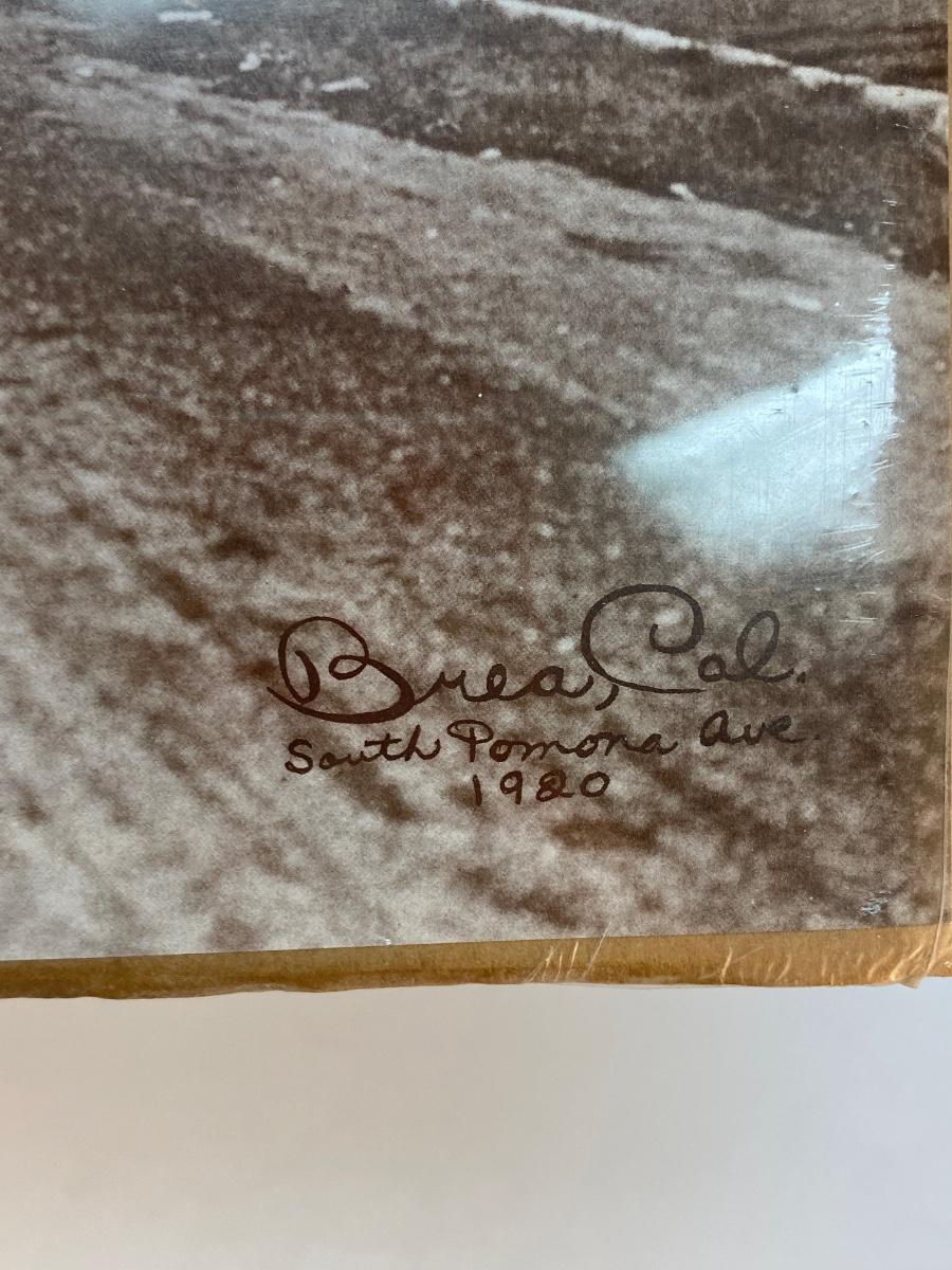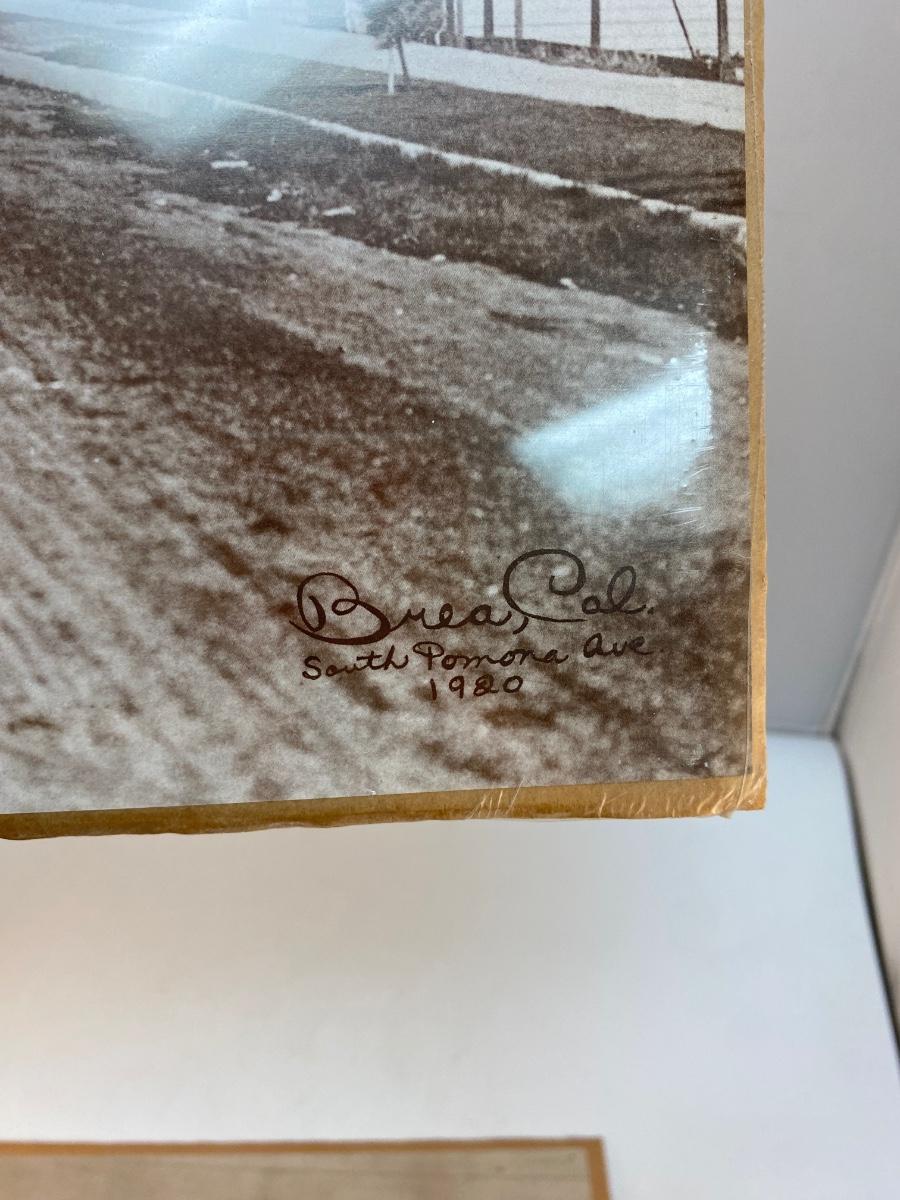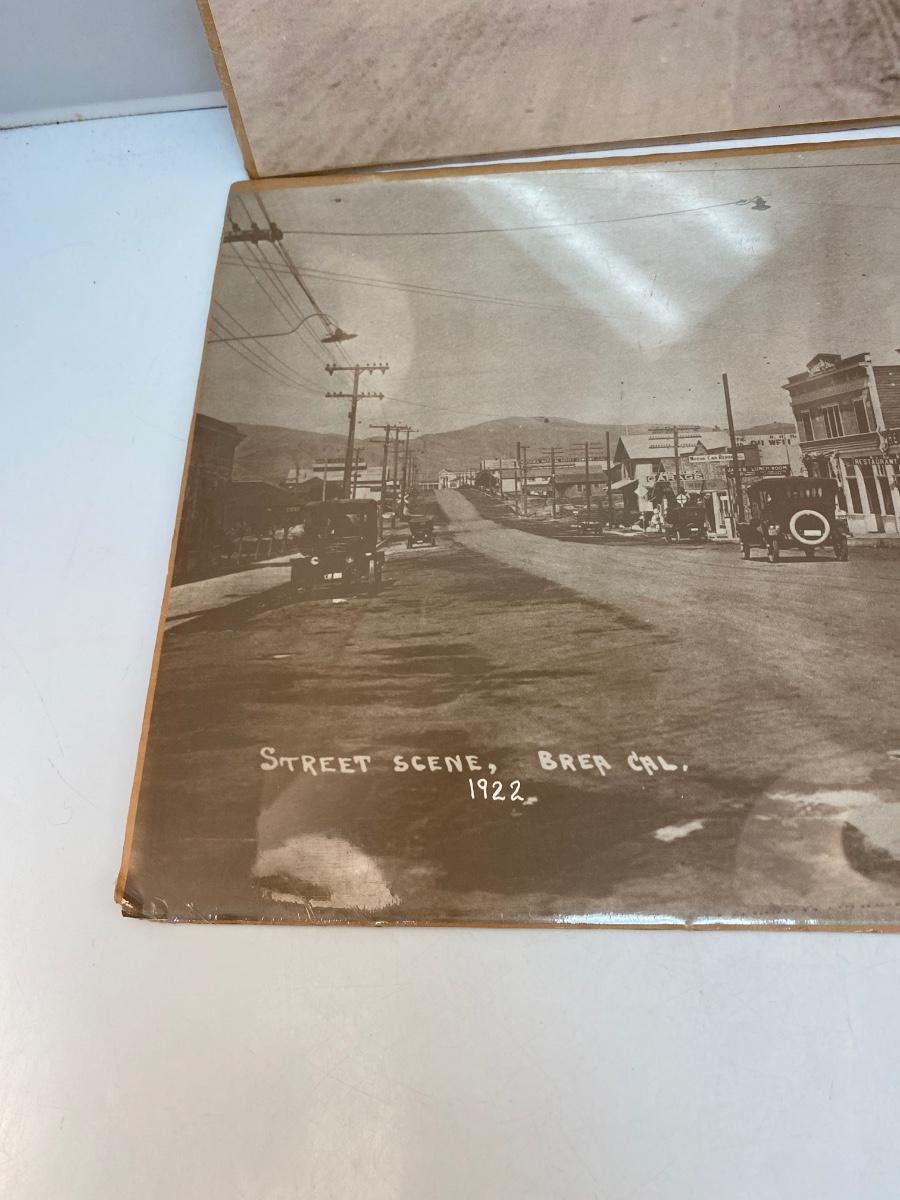 Pair of Sepia Reproduction Photos of Brea California Street Scene Pomona Ave 1920. Both are in plastic on cardboard. Good condition. One has the street name, Pomona Ave, the other just says street scene. 11x14 size.
