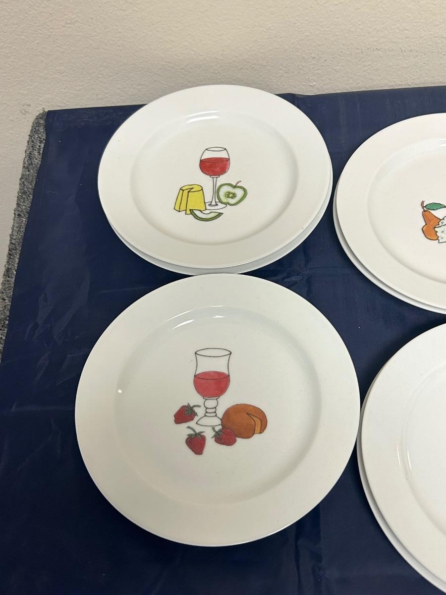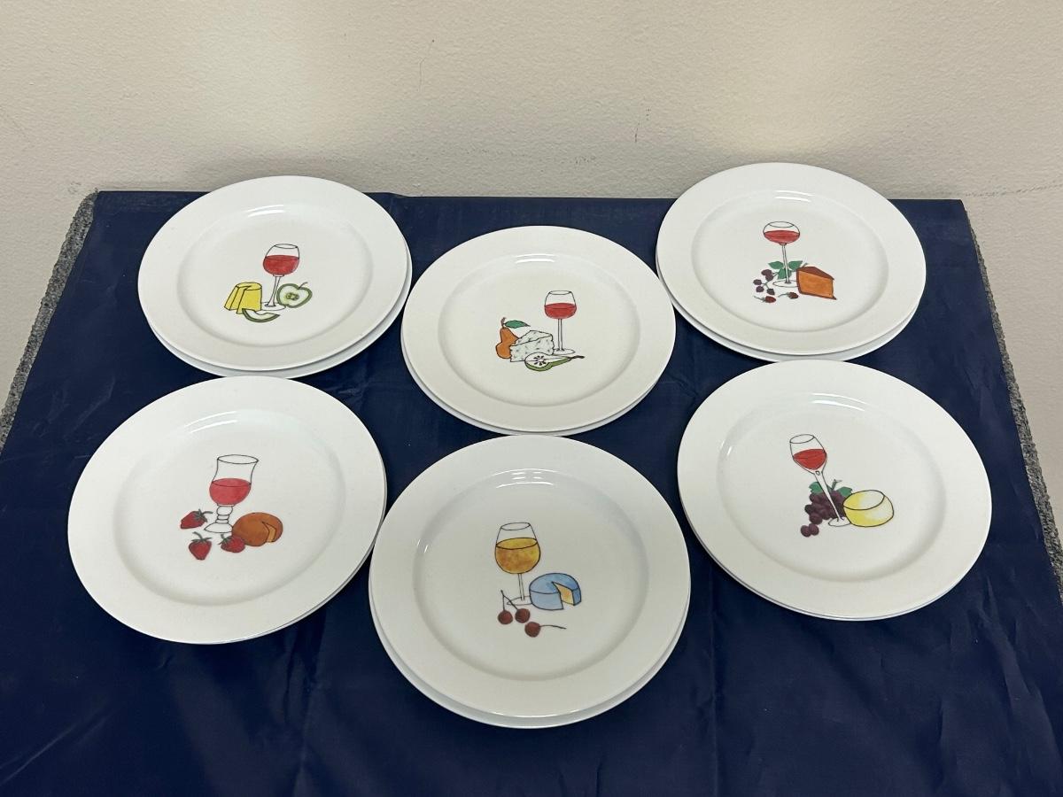 Set of 12 Wine & Cheese by Ursula Dodge for Signature Housewares Appetizer Plates. 6 different patterns. In good condition.