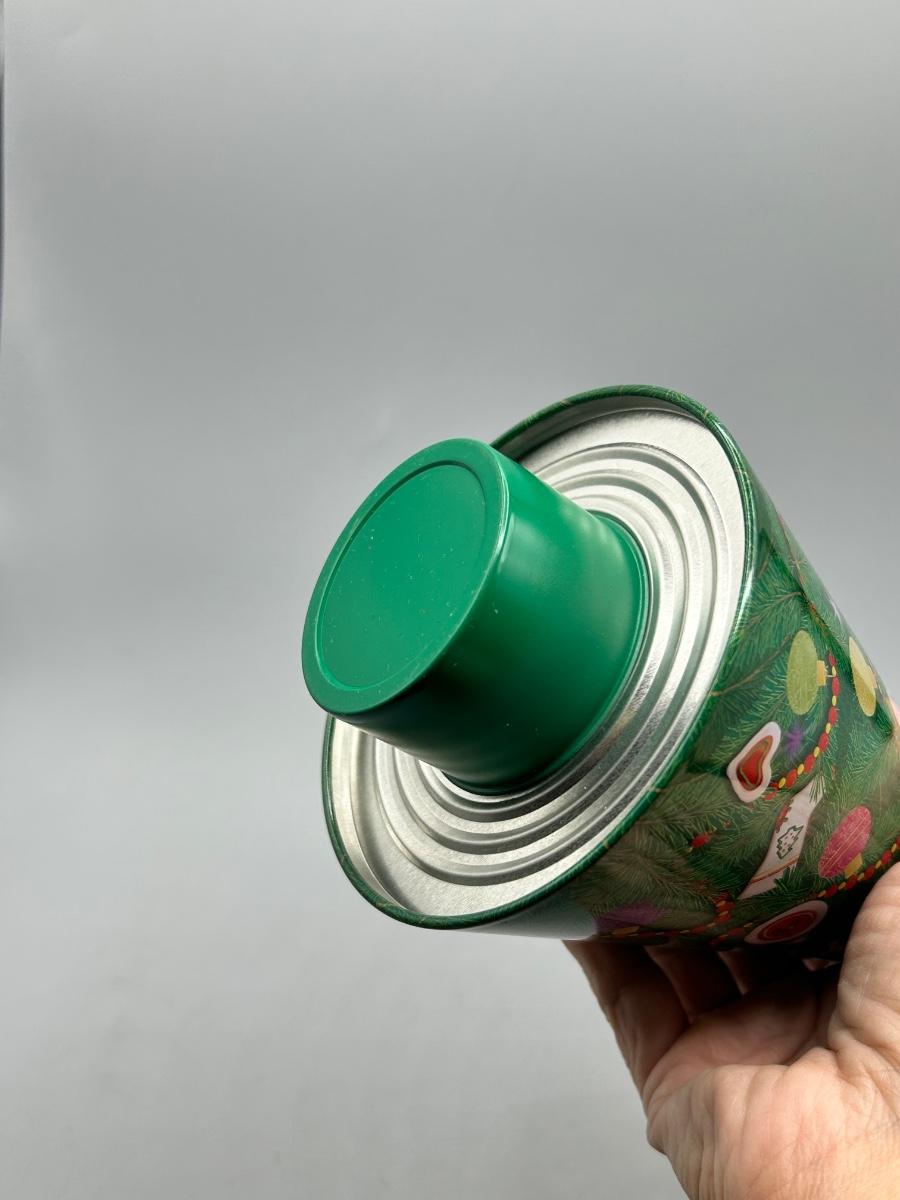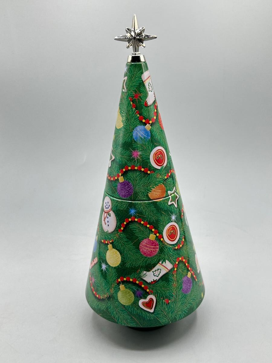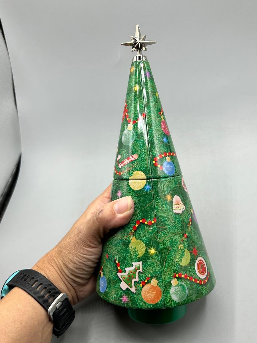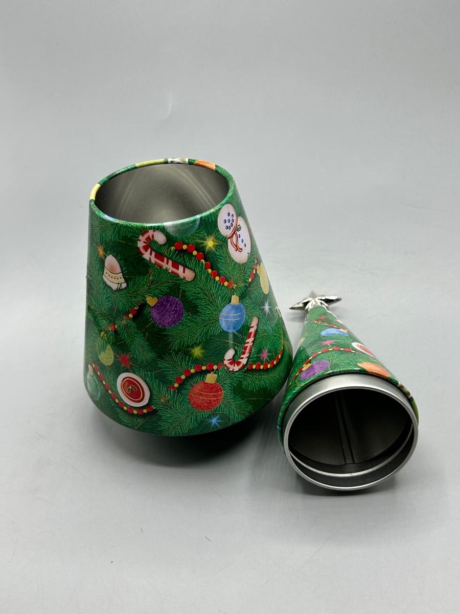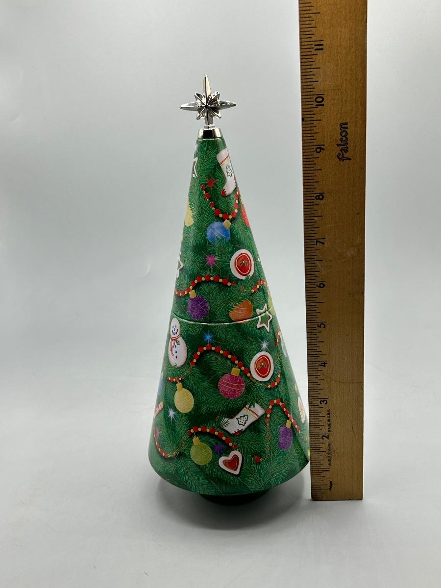 Vintage Retro Metal Christmas Holiday Tree Tin Canister Unbranded. In good condition. Did not find a brand name anywhere on the tin or bottom. Comes apart at the center. About 10" size.