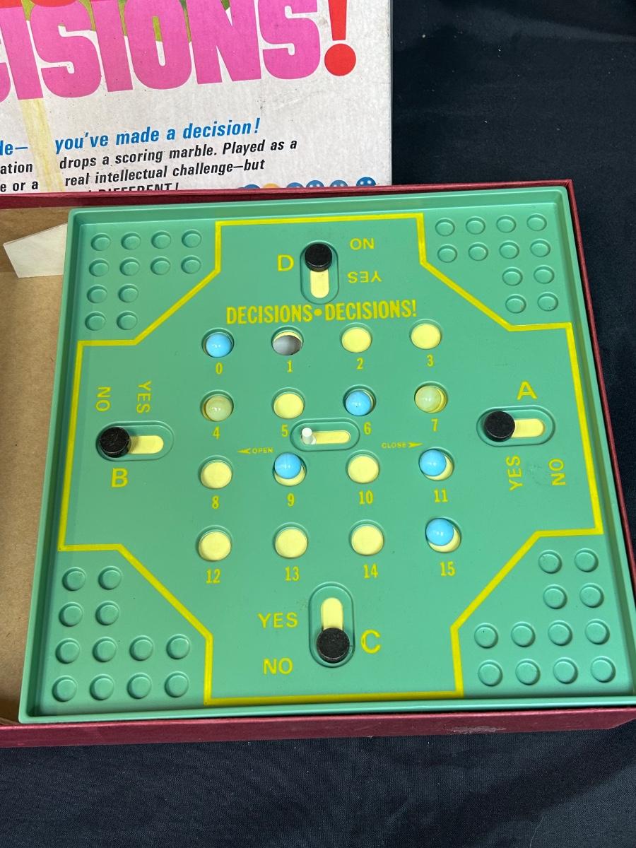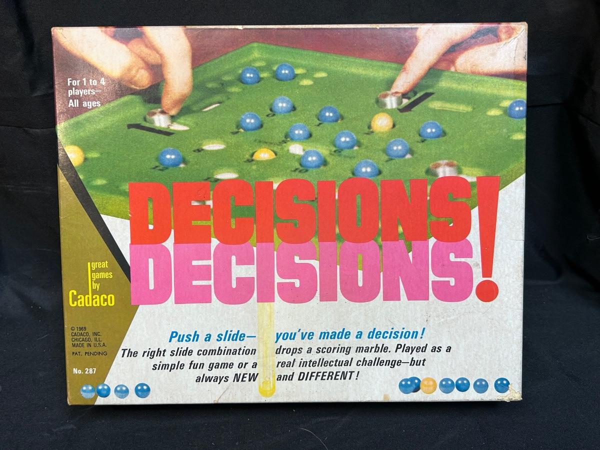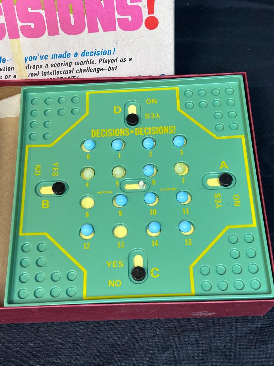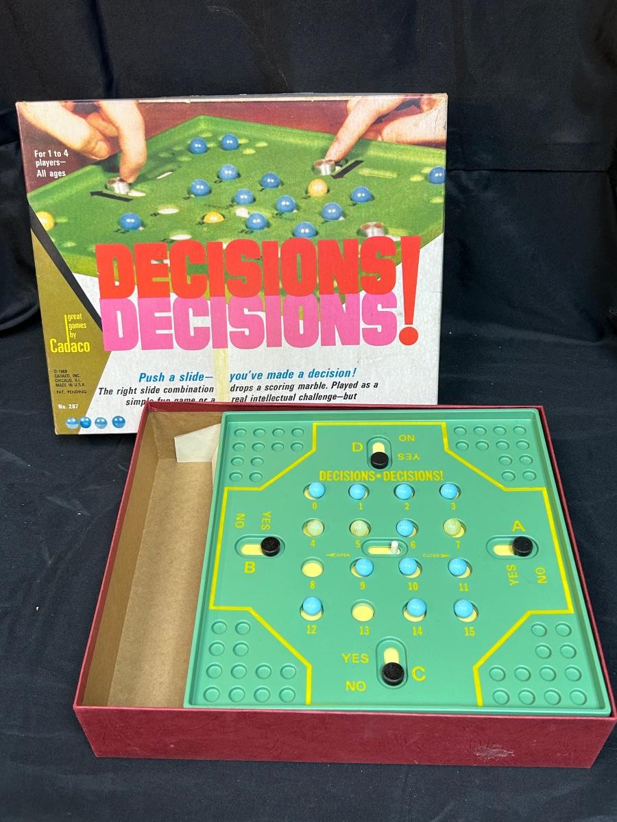 Decisions Decisions! 1969 Marble Board Game from Cadaco. In vintage condition. Does not have game instructions, unsure if it is missing pieces.