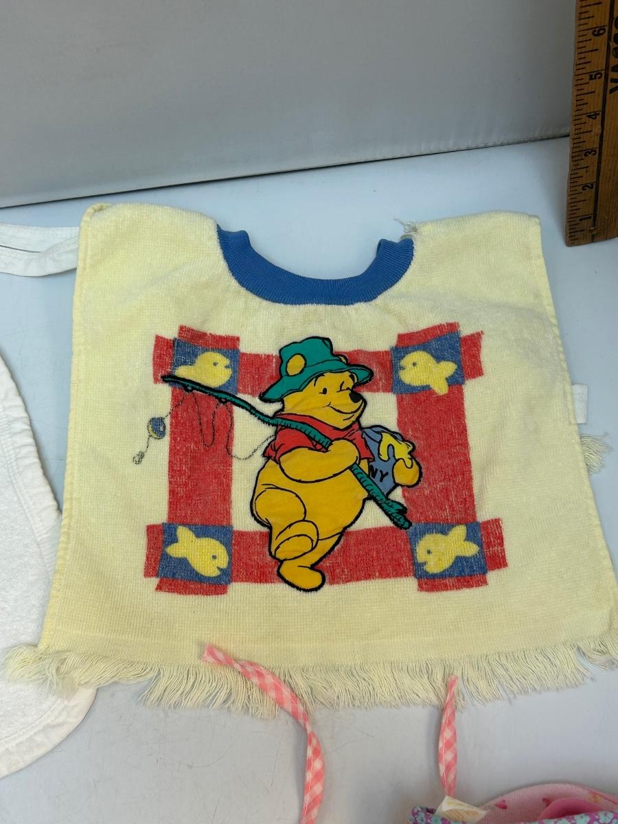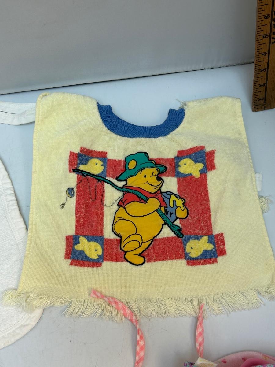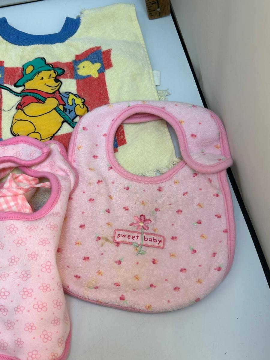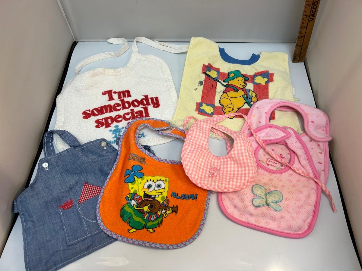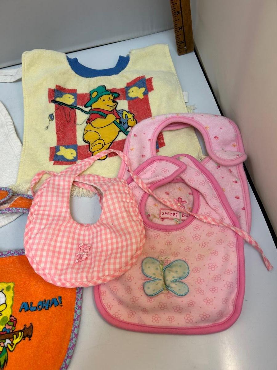 Mixed Lot of Vintage and New Baby Toddler Bibs Spongebob Winnie the Pooh. In various conditions, most are good. The two pink newer bibs have the most discoloration.