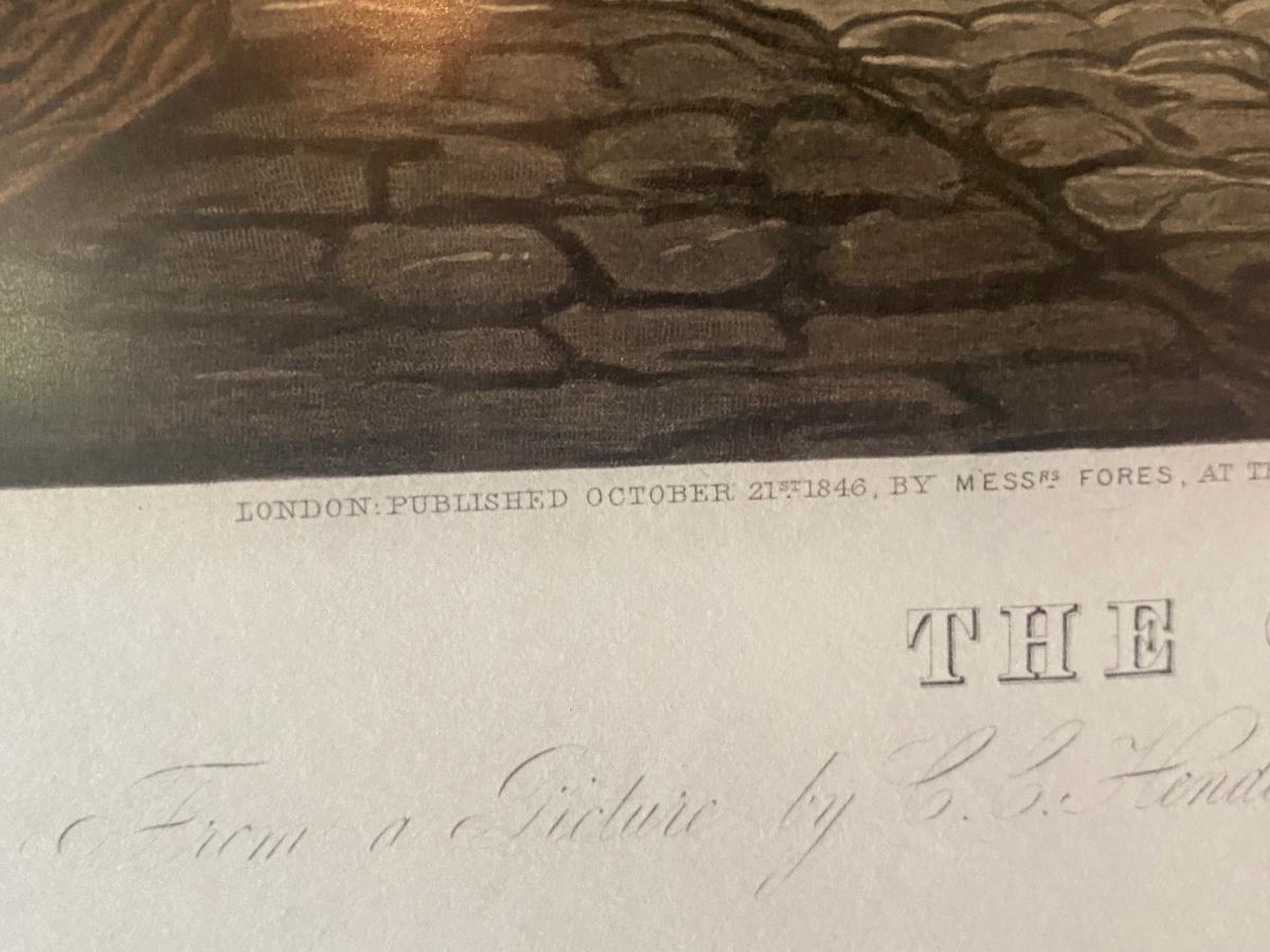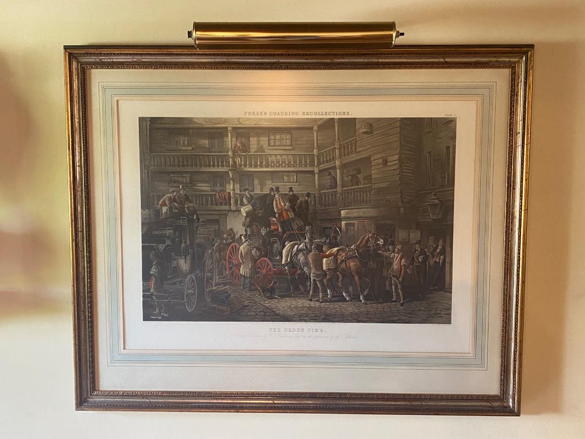 Large Frame Print The Olden Time Men on Horse Drawn Carriage. Originally published in 1846. Nicely framed print with light on top but light doesn't seem to be working, shine on art is from hanging fixture in room.