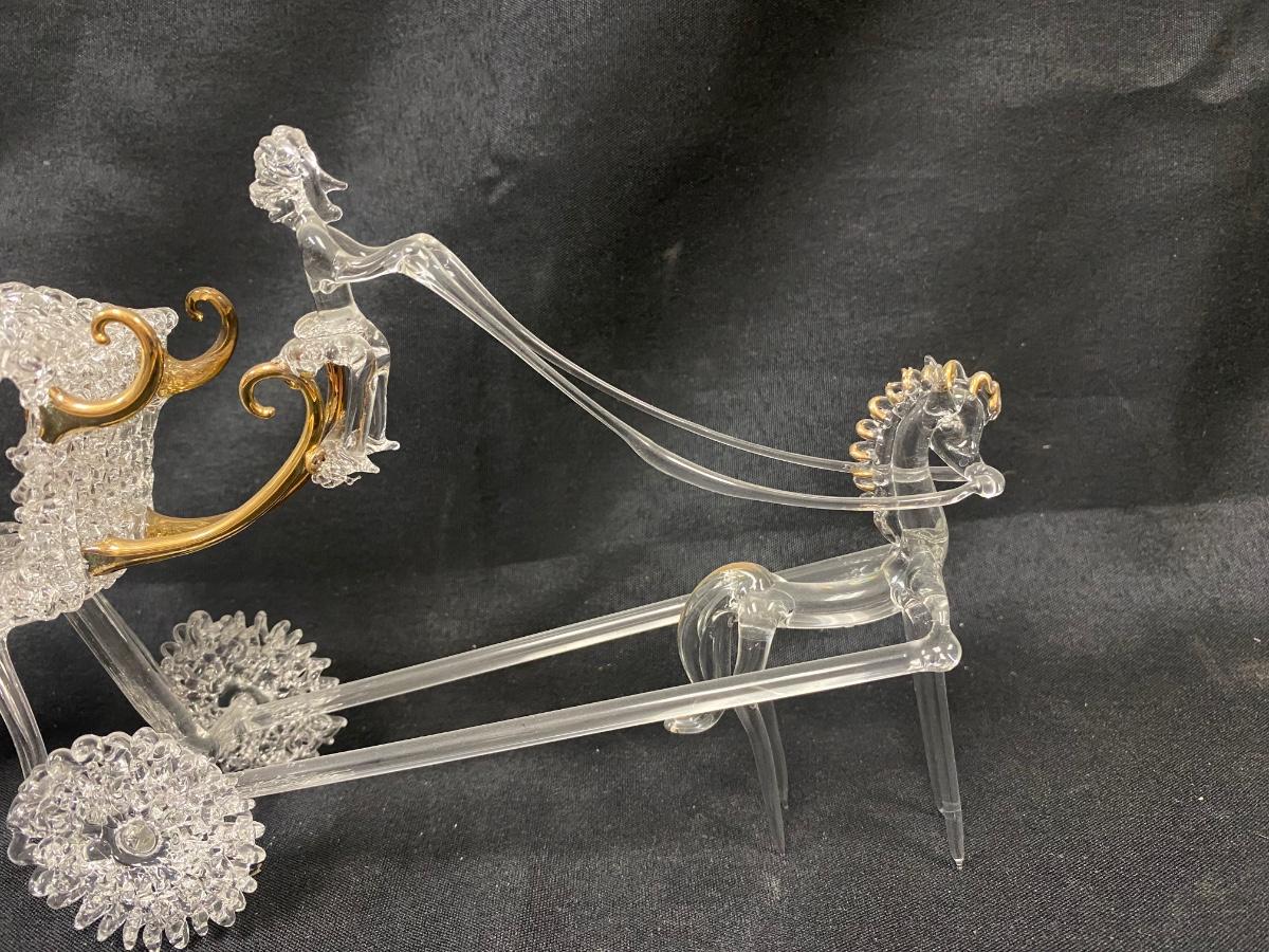 Vintage Retro Gold Accent Blown Glass Horse Drawn Carriage Figurine. In good condition, no damage noticed. Almost 12" length.