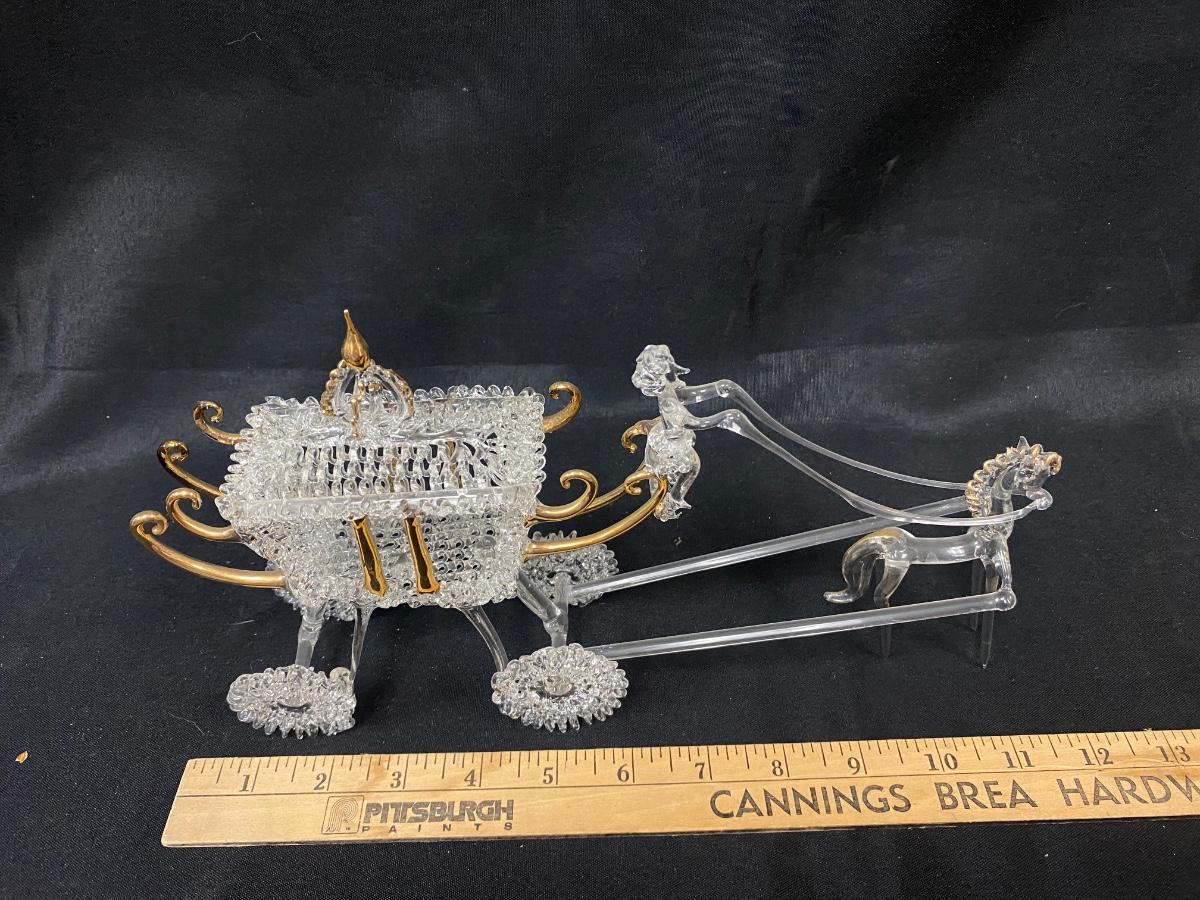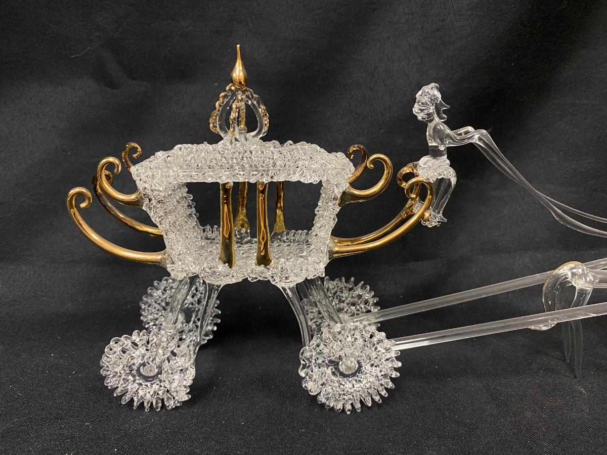 Vintage Retro Gold Accent Blown Spun Glass Horse Drawn Cinderella Carriage Figurine