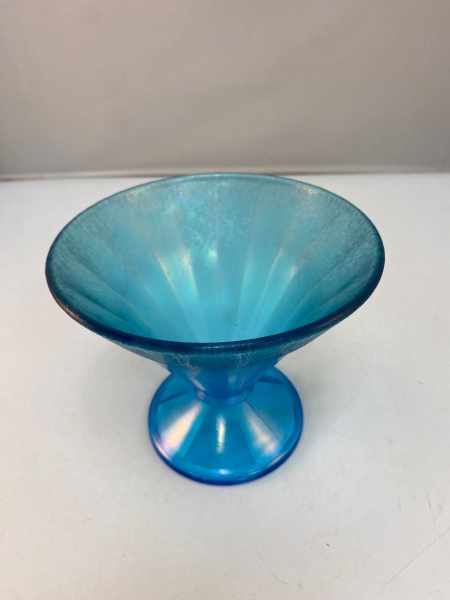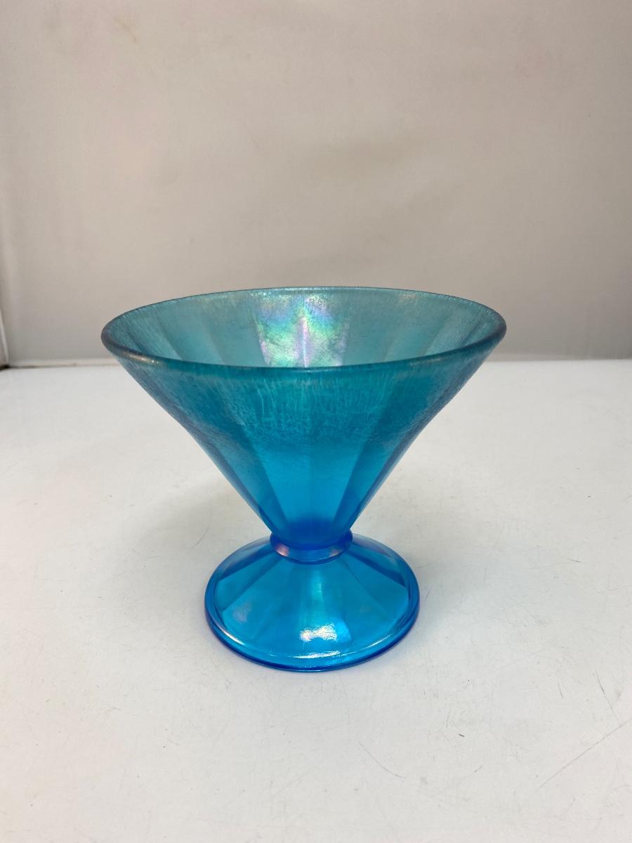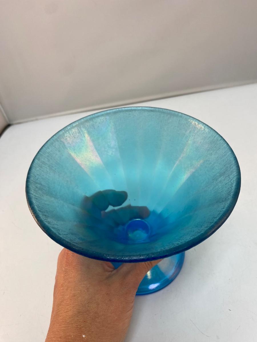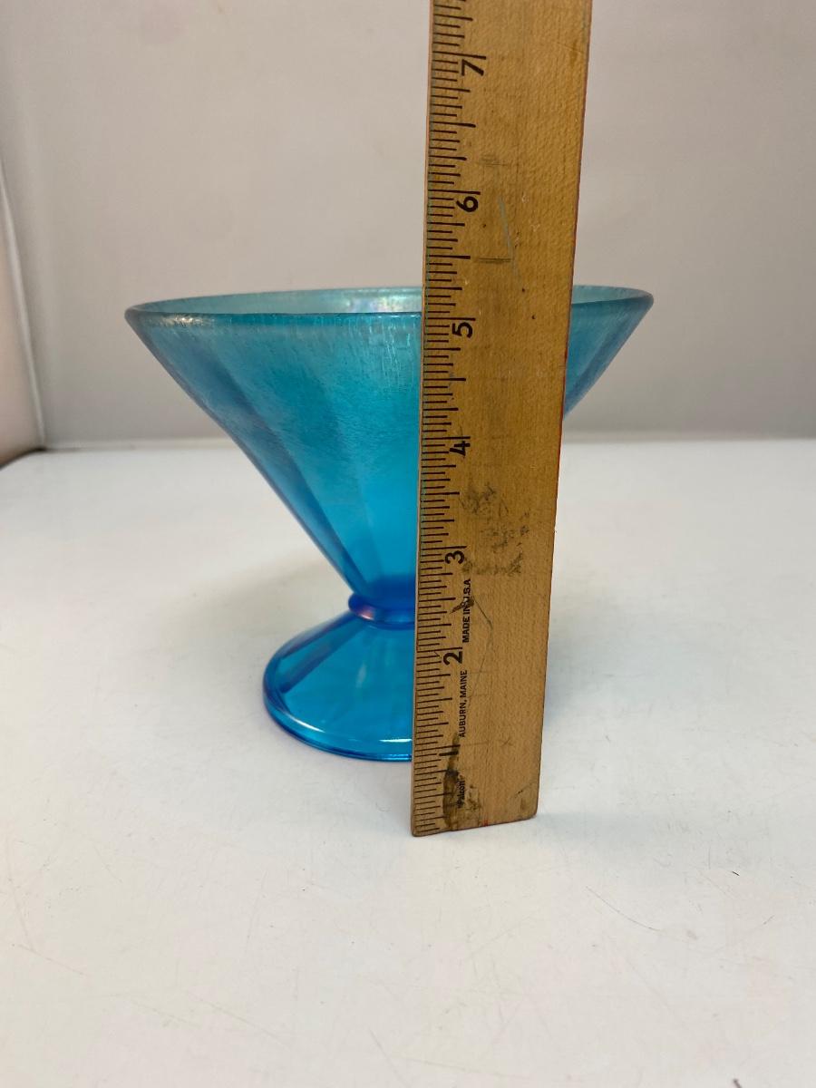 Vintage Ribbed Turquoise Carnival Glass Compote Candy Dish Vase Bowl. Some light signs of age to the finish on the glass but no chips found. 5" height.