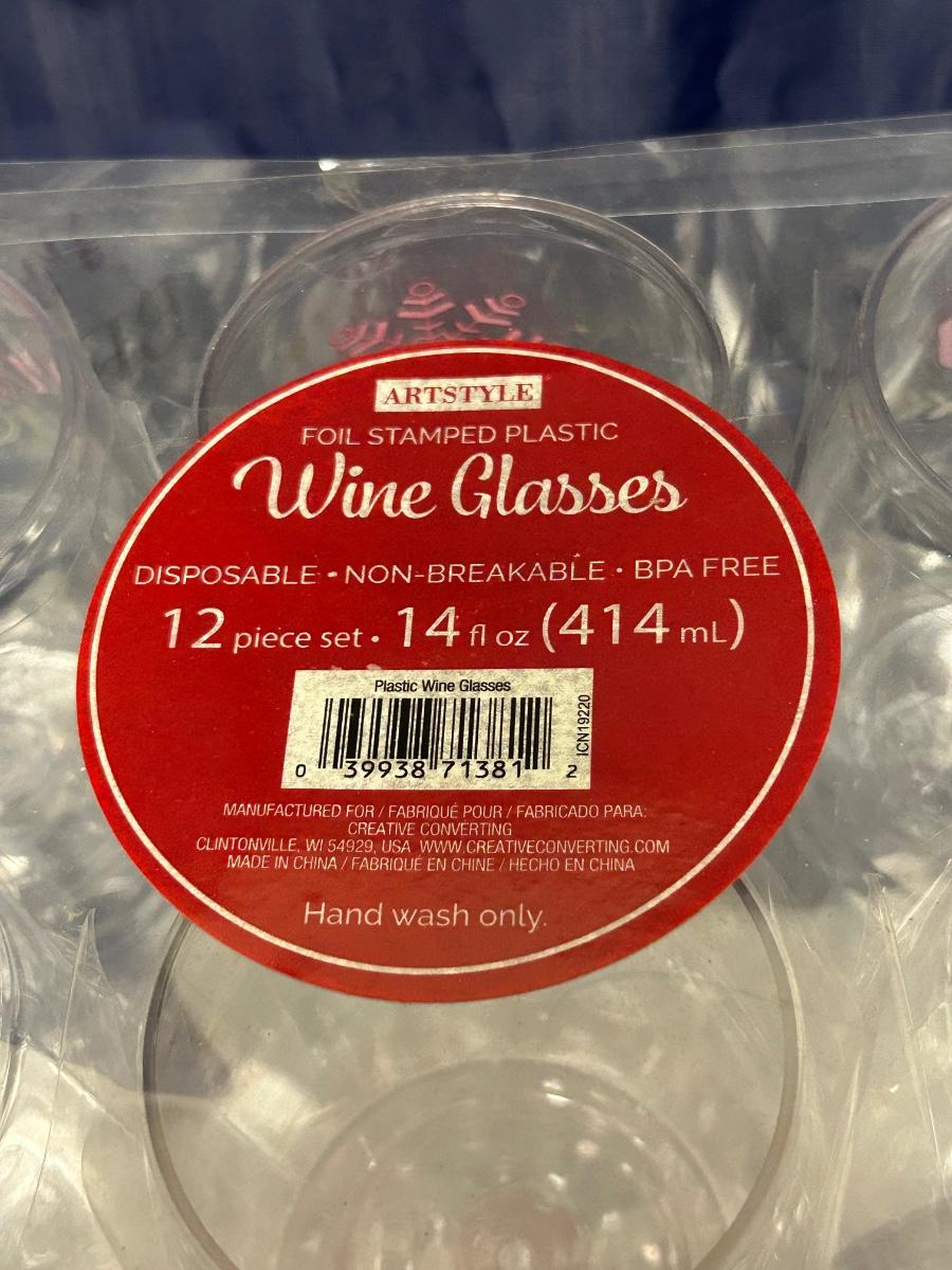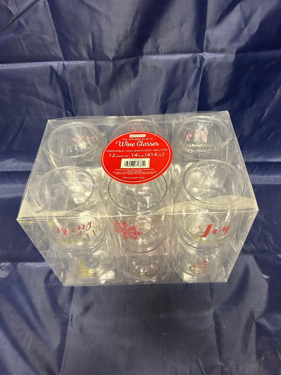New in the Package Christmas Holiday Plastic Wine Glasses Set of 12. In good condition. Package was sealed opened to remove one for photo.