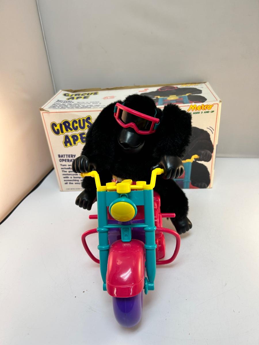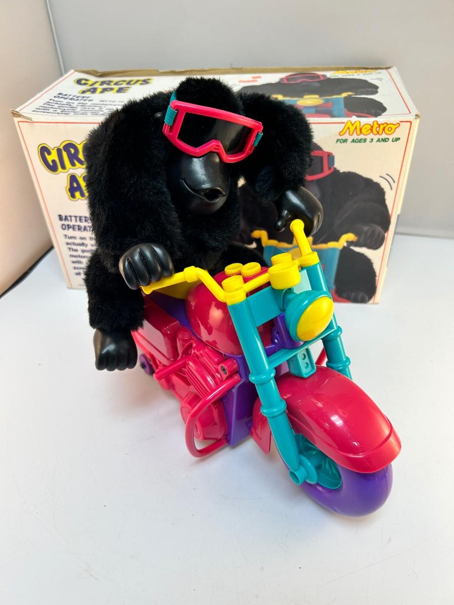 Vintage Retro Battery Operated Circus Ape Animatronic Motorcycle Riding Gorilla. In good retro condition. Untested with batteries but battery terminals are clean. Comes with original box. About 12" size.
