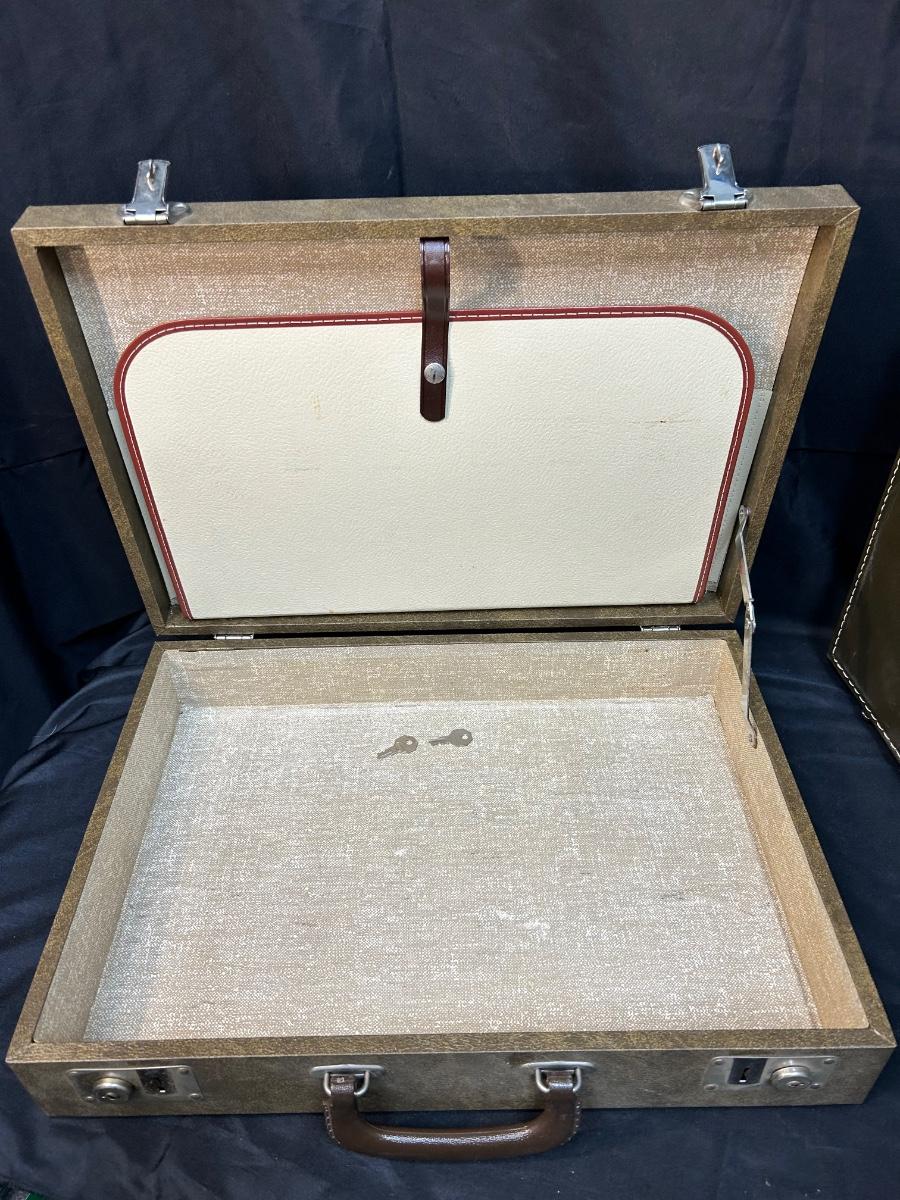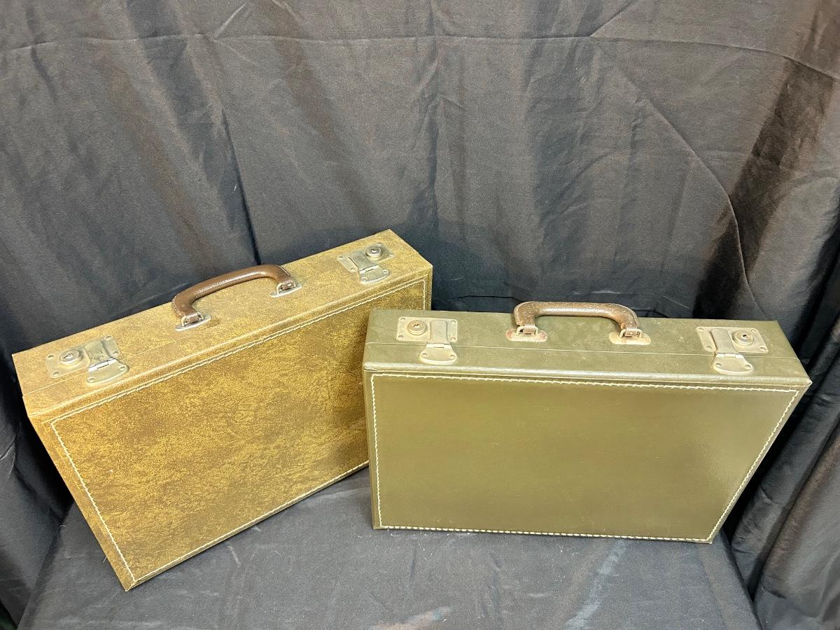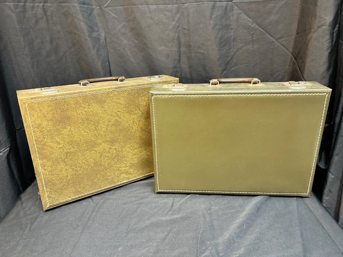 Pair of Vintage Olive Green Vinyl Hard Side Briefcases. In good vintage condition, a little dusty. Latches work well and both have keys for the locks.