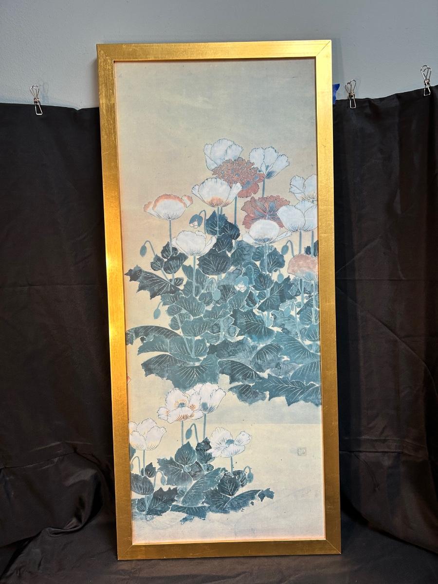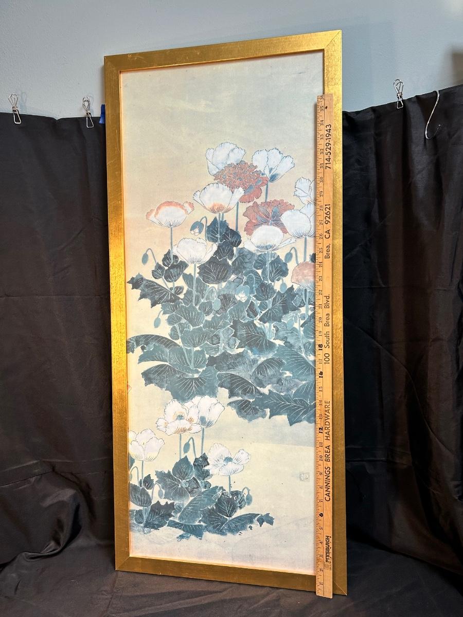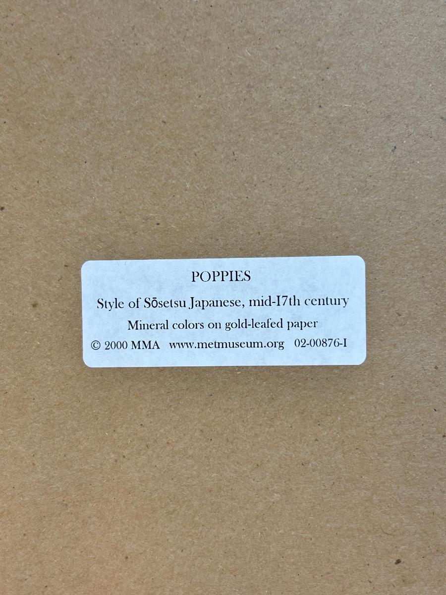 Frame Art Print MMA MET Museum POPPIES in Style of Sosetsu Japanese 17th Century. In good condition. Original artwork would have been done with mineral colors on gold leaf paper. About 18"x40" size.