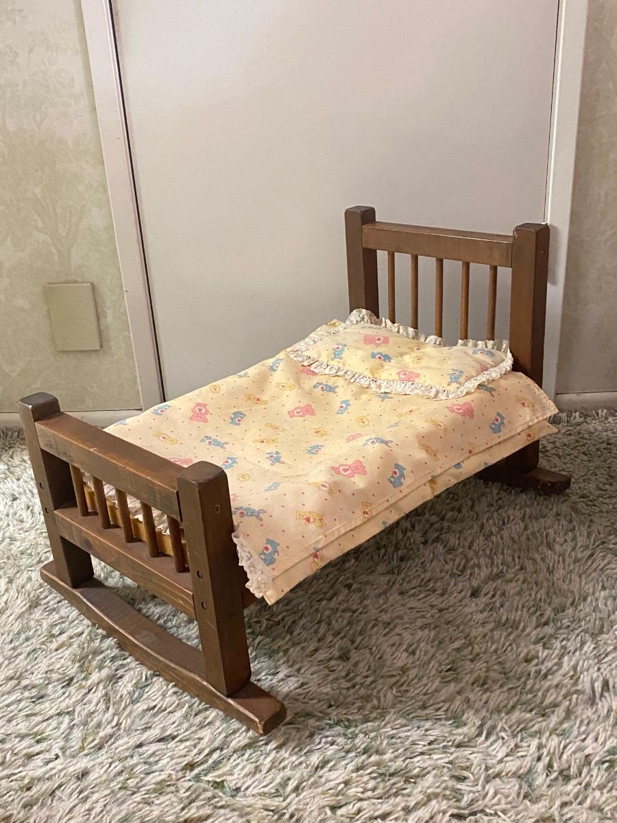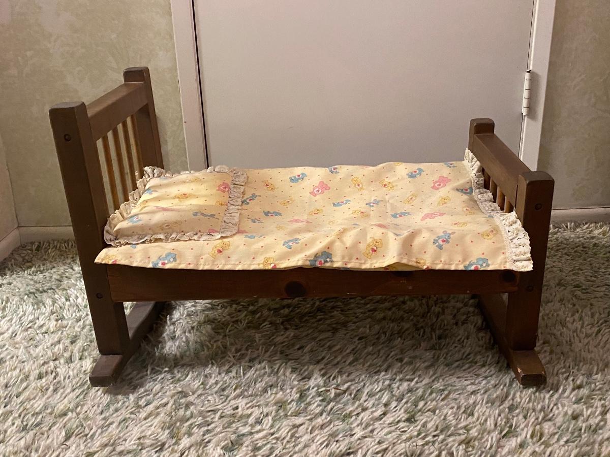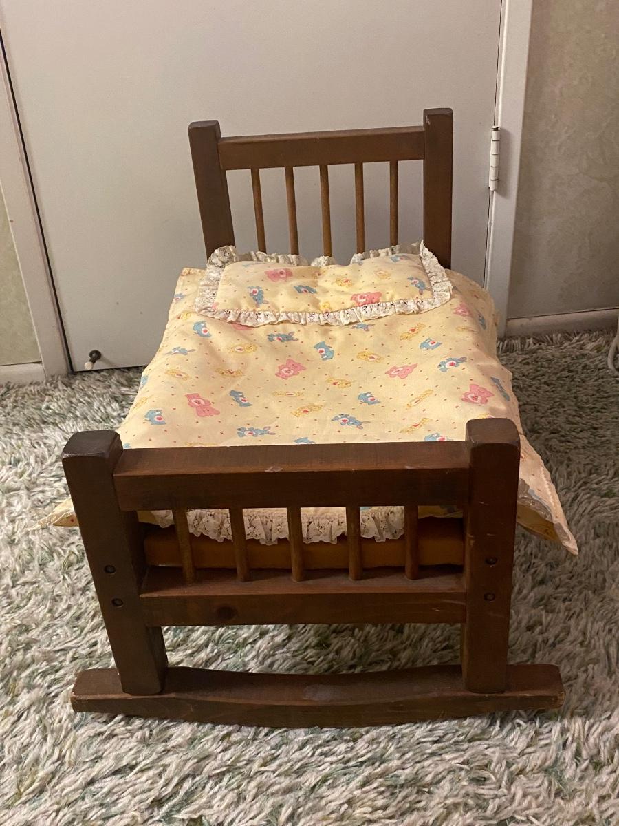 Vintage Wooden Doll Cradle Bed with Foam Mattress and Bedding