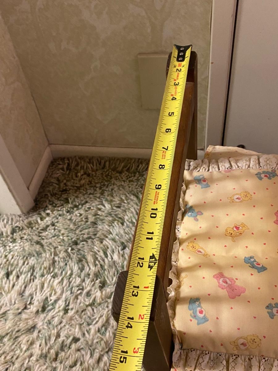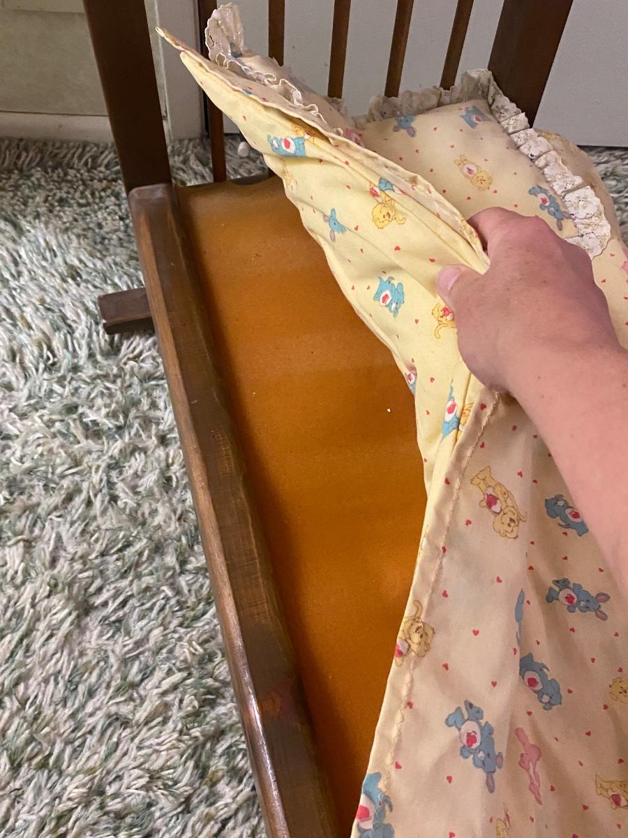 Vintage Wooden Doll Cradle Bed with Foam Mattress and Bedding. In good vintage condition. About 26" length.