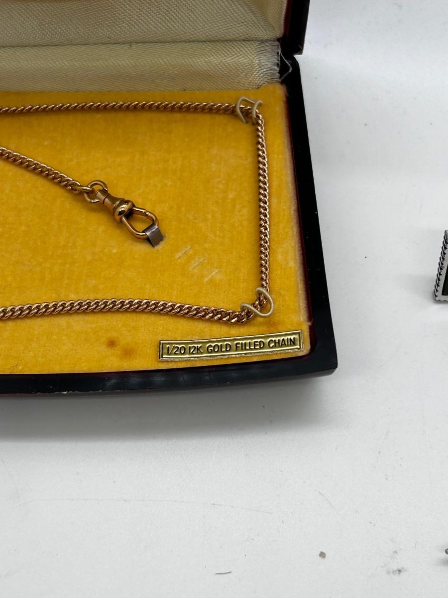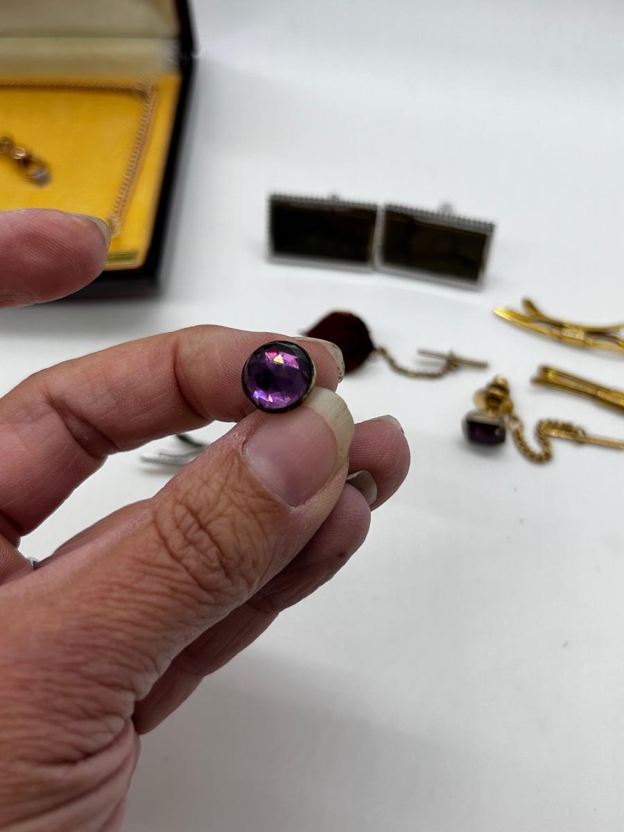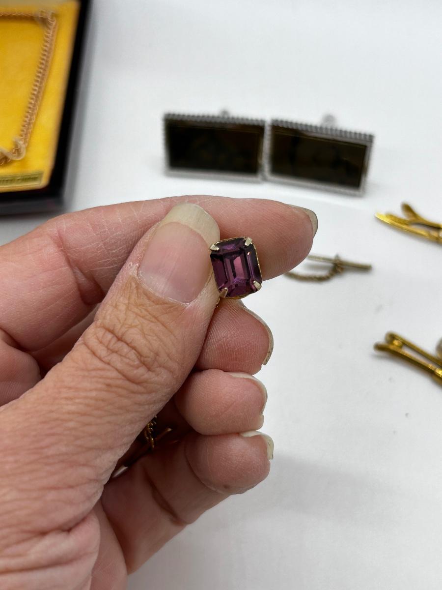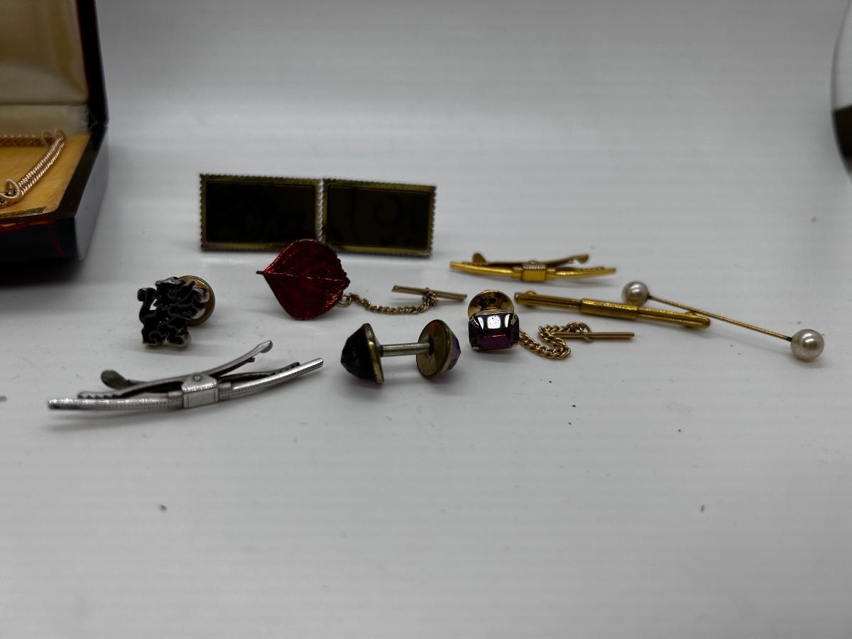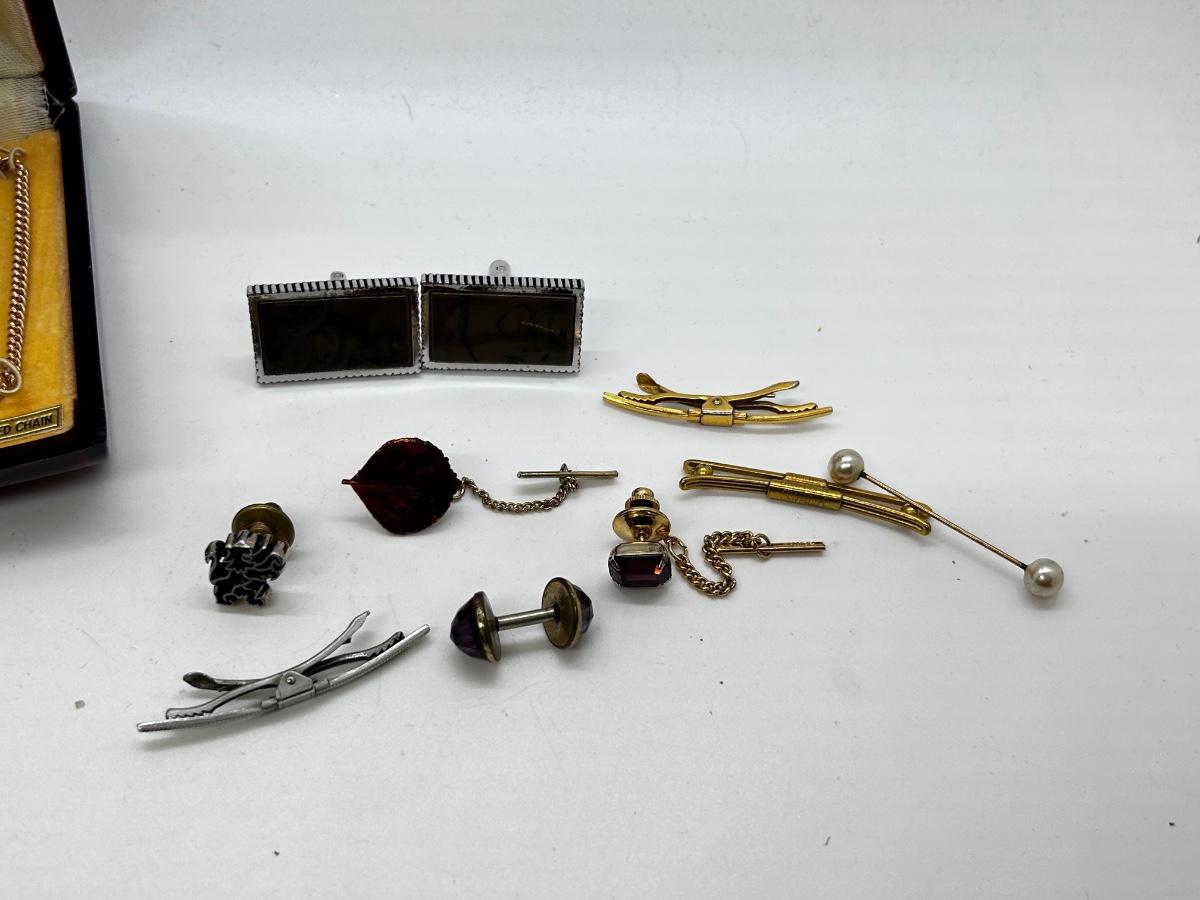 Mixed Lot of Miscellaneous Men's Jewelry Cuff Links Watch Chain Tie Clips Pins. In previously owned condition.